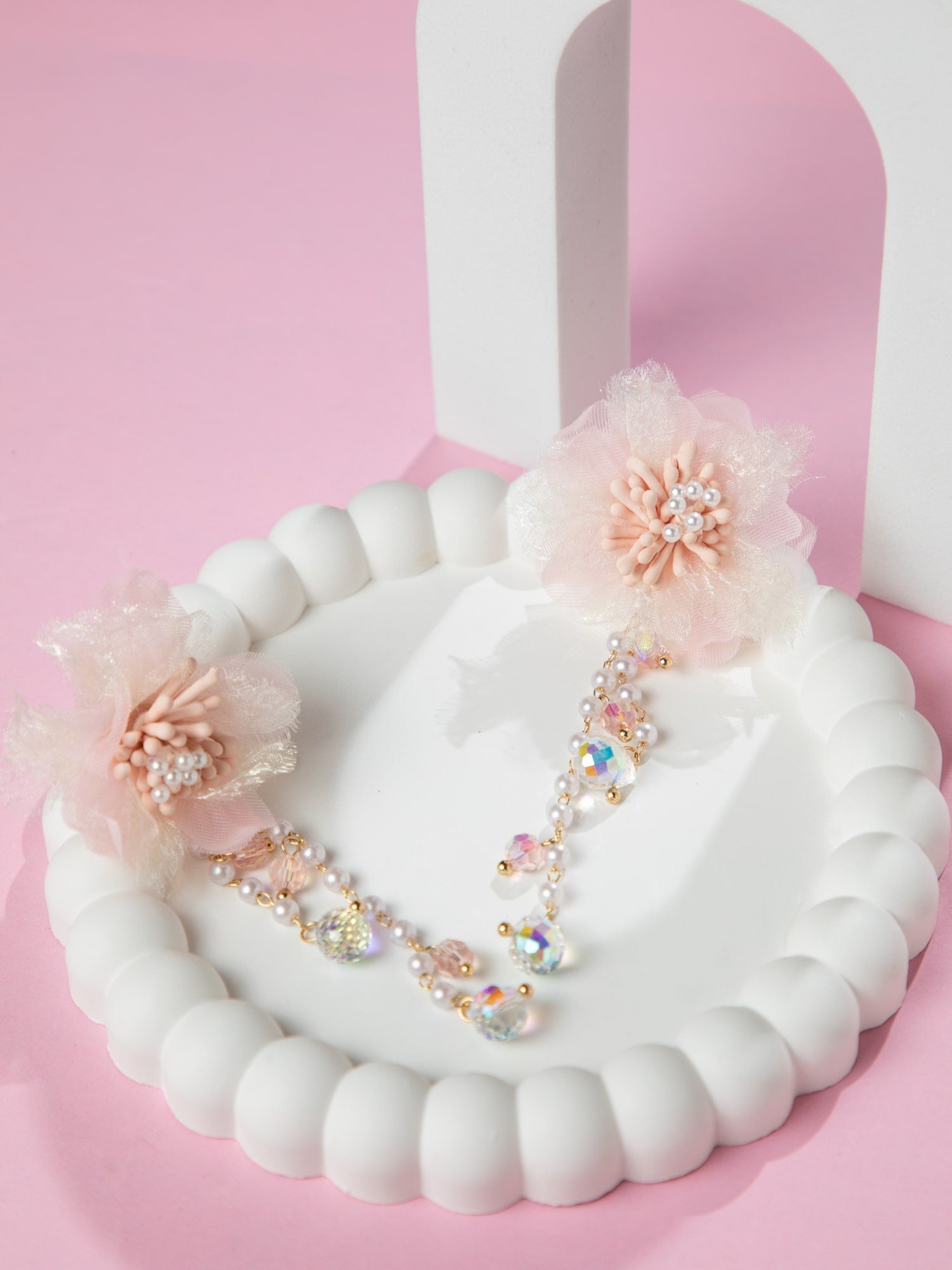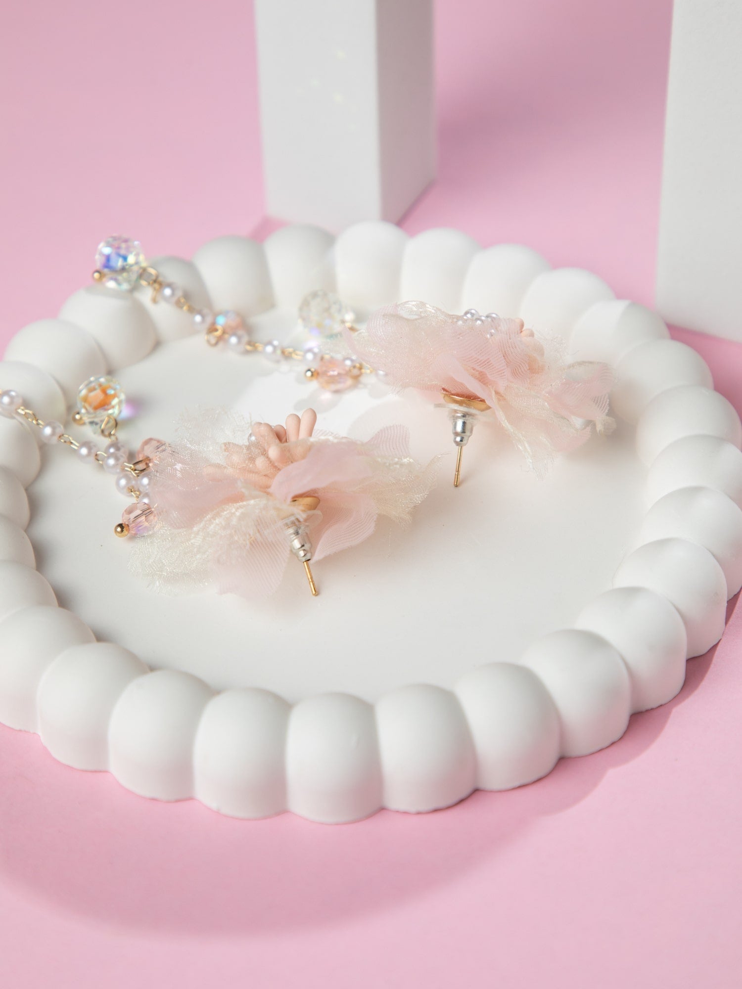 Pink Floral Long Earrings with Faux Pearls and Translucent Stones