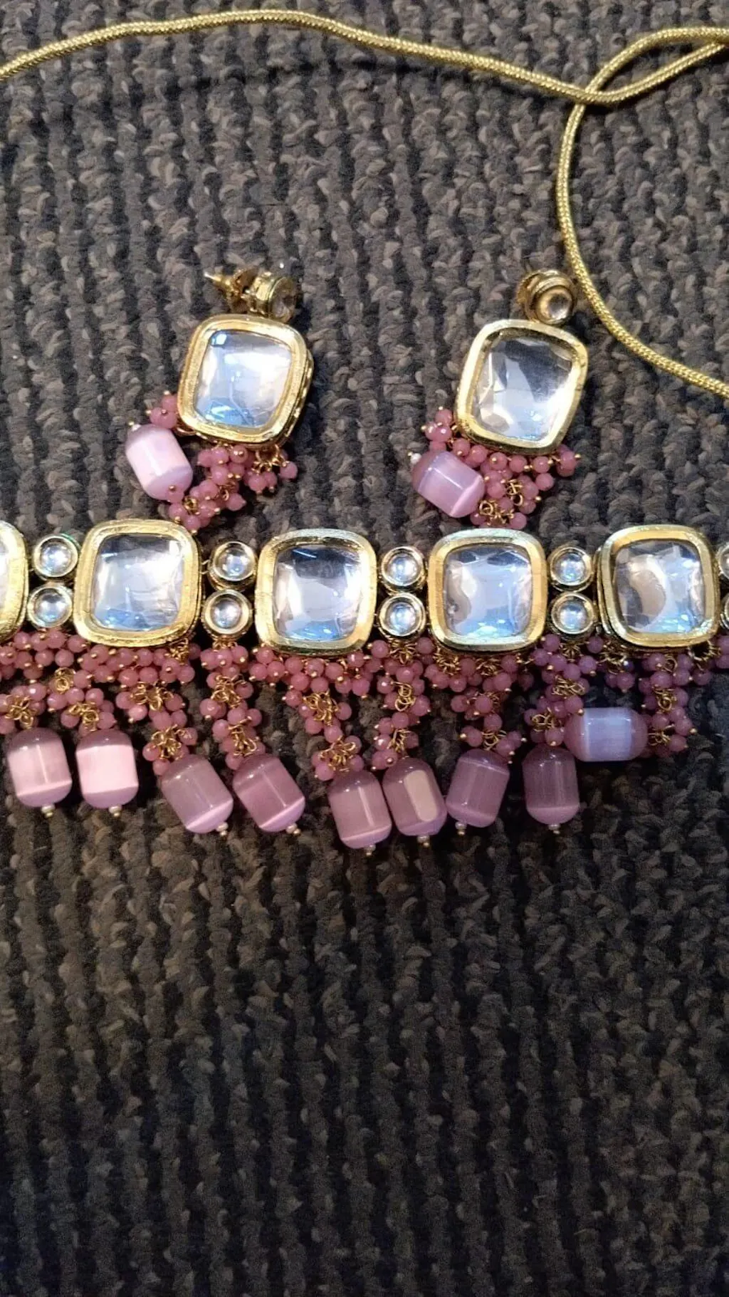 The base metal is an alloy with 24K Gold Plating. The Kundan Stones are encrusted on the 24k Gold Plated body. The baby pink colored tiny beads with cylindrical beads are hanging beneath beautifully. The Choker Necklace has an adjustable thread tie-up and Dangler Earrings with an easy secure push-back closure. Light in weight Jewellery Set and Choker fits perfectly well on your neck.