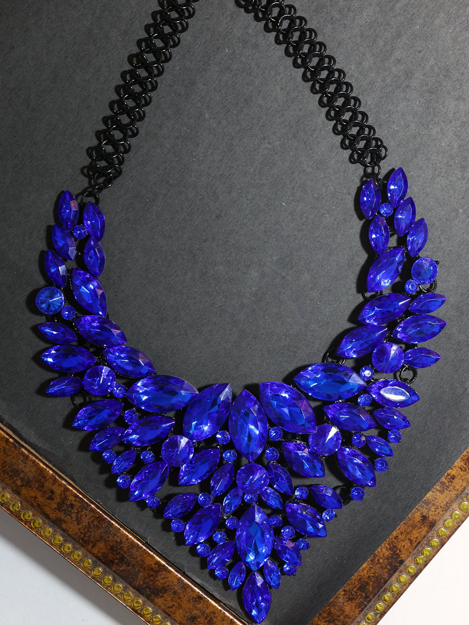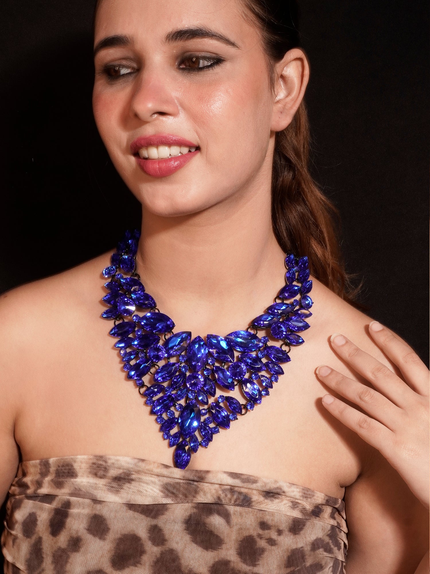 Pair this striking blue rhinestone and American diamond necklace with a classic black or navy saree to let its vibrant hues stand out beautifully. For a more contemporary look, wear it with a deep V-neck gown or an off-shoulder blouse to highlight its intricate design. Keep the rest of your jewelry minimal—opt for simple studs or matching earrings—and let this necklace take center stage. Finish with a sleek hairstyle to complete the polished and elegant vibe.