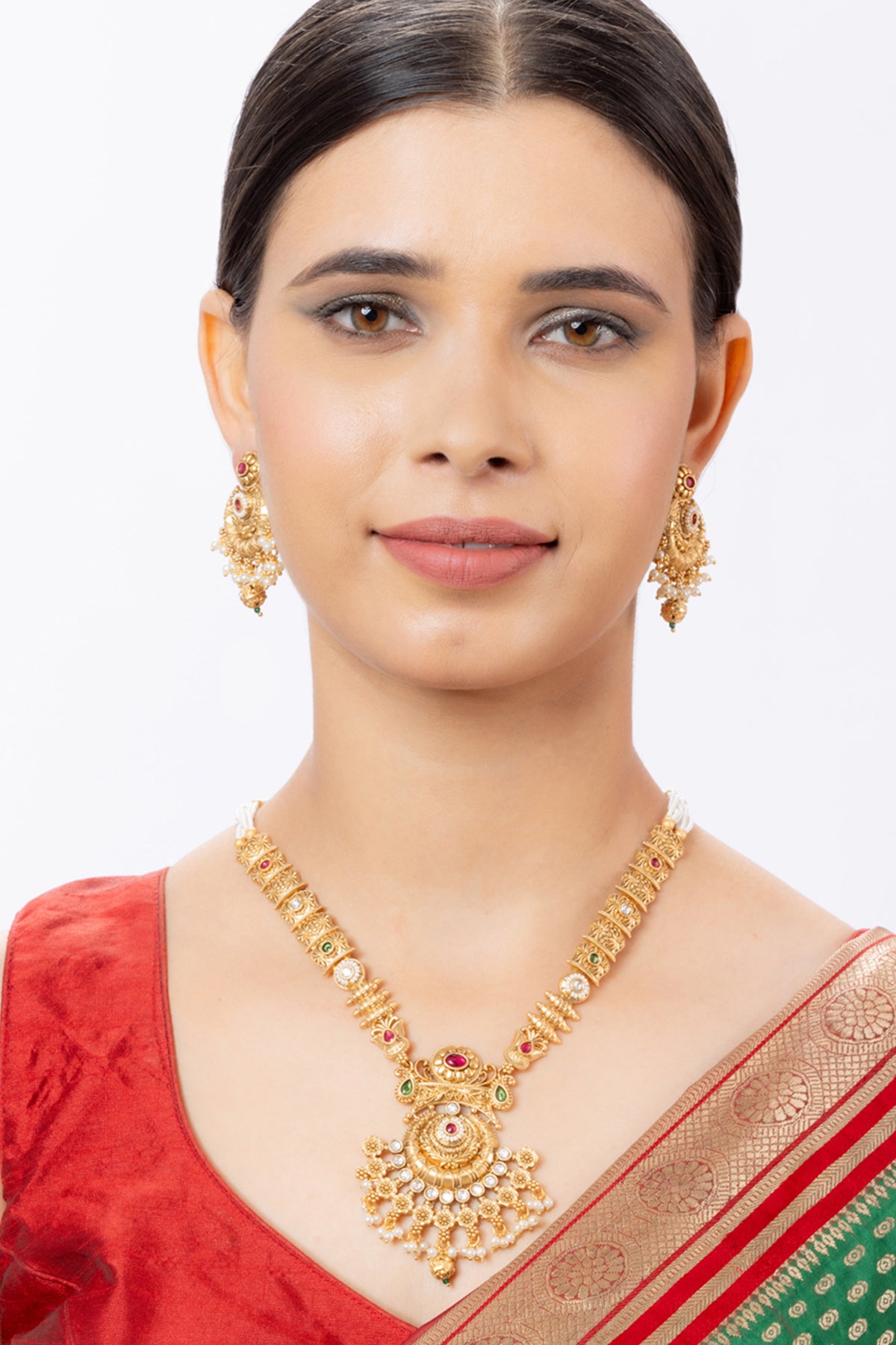 Feel like a queen with this stunning necklace set. This rani haar set is enough for your traditional saree or lehenga set to get the royal look.