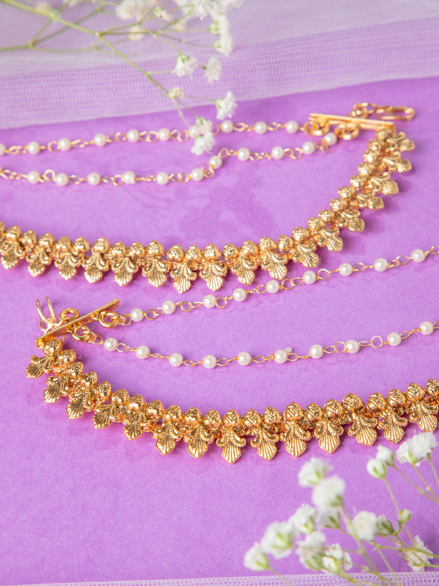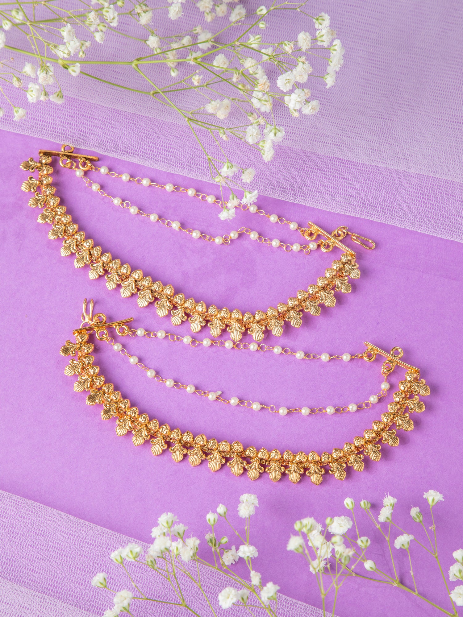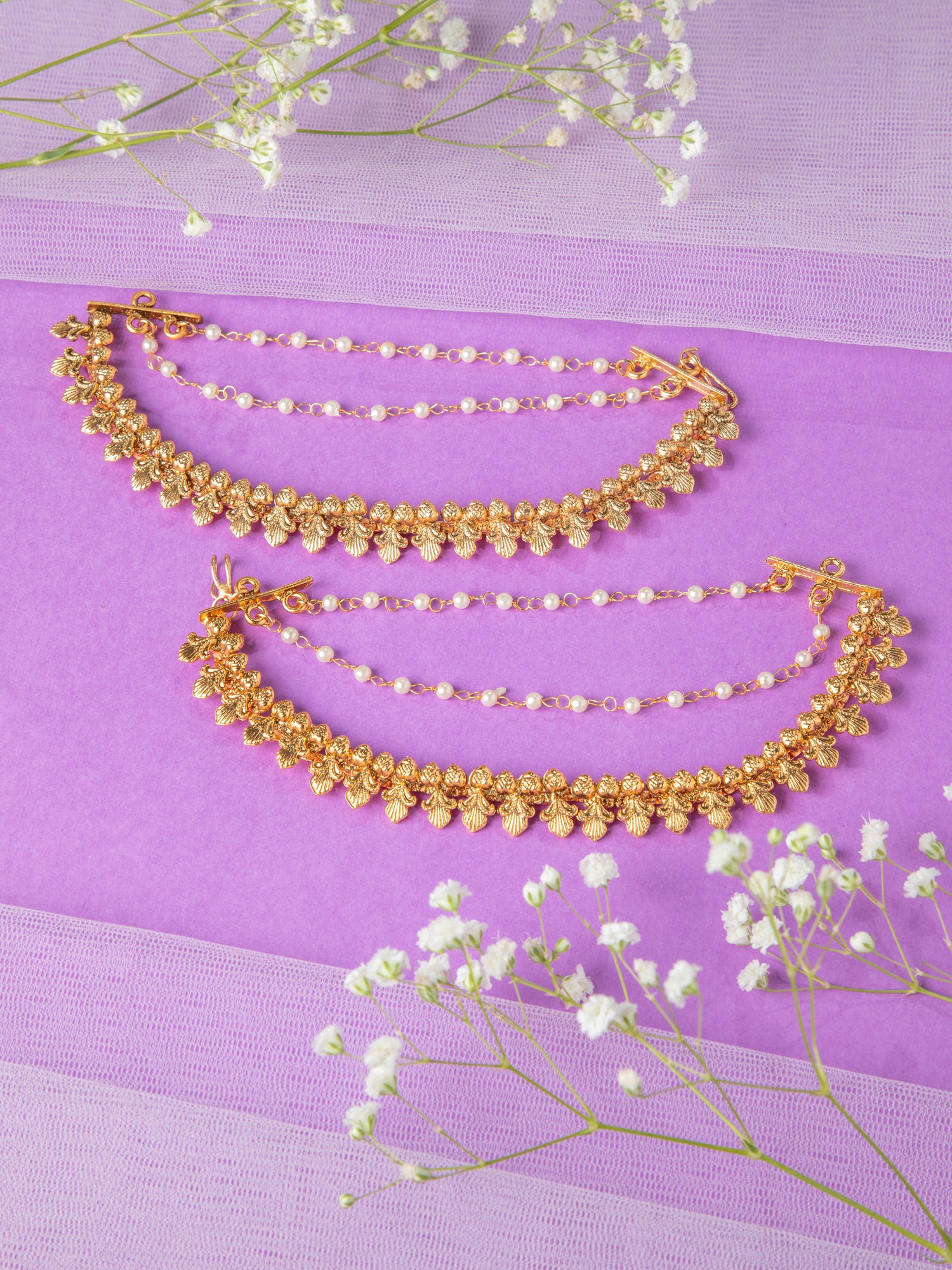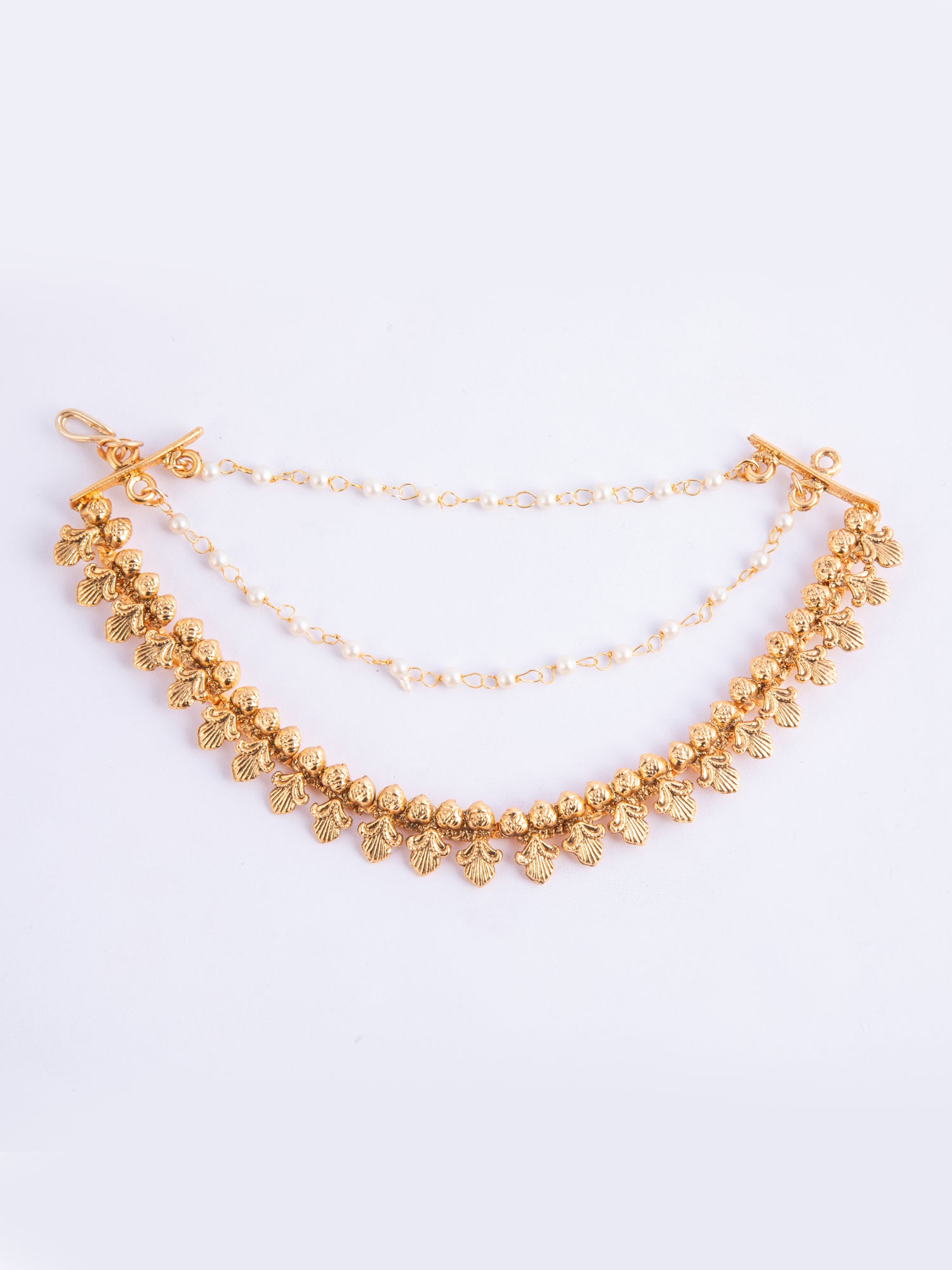 Embrace timeless charm with this 24K gold plated big ear chain, adorned with delicate white faux pearls. A stunning piece from the traditional antique collection, perfect for festivals, functions, or parties.