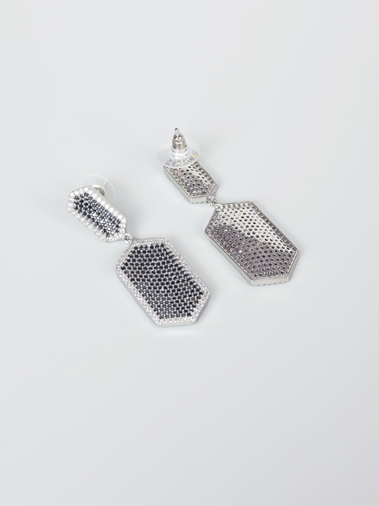 Adorn yourself with our Rhodium-Plated Black and White American Diamond Hexagon Earrings, featuring exquisite small black and white AD stones intricately arranged in a beautiful hexagon shape. Crafted with the latest design trends in mind, these earrings showcase modern style and skillful craftsmanship. Handmade by local artisans, they offer anti-allergic and anti-tarnish properties, ensuring lasting comfort. Perfect for functions, festivals, or party wear, these earrings add a touch of contemporary elegance to any ensemble.
