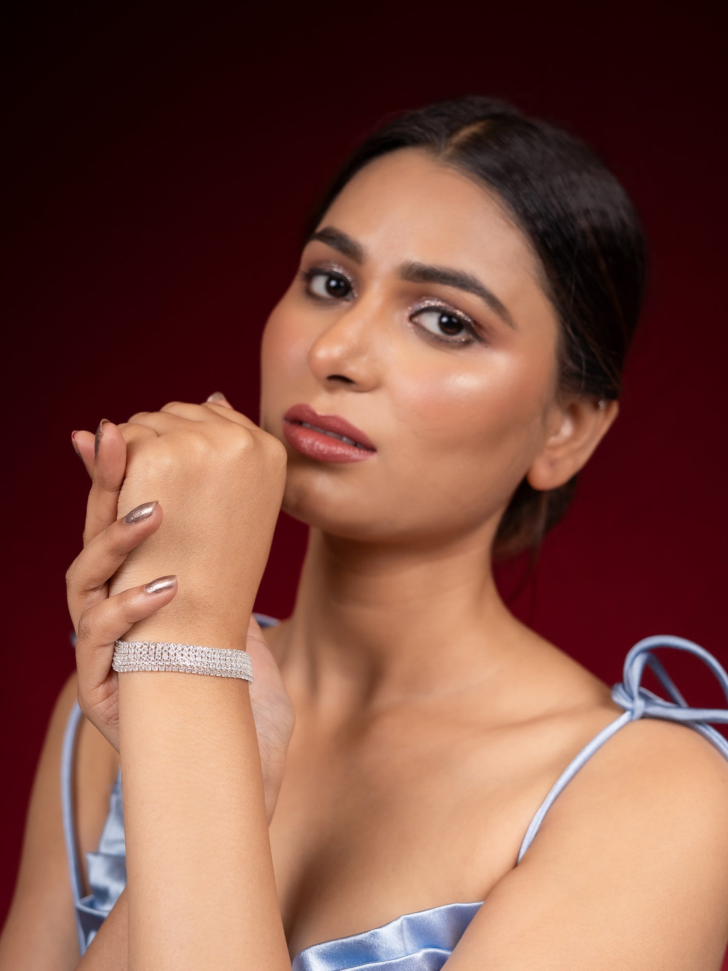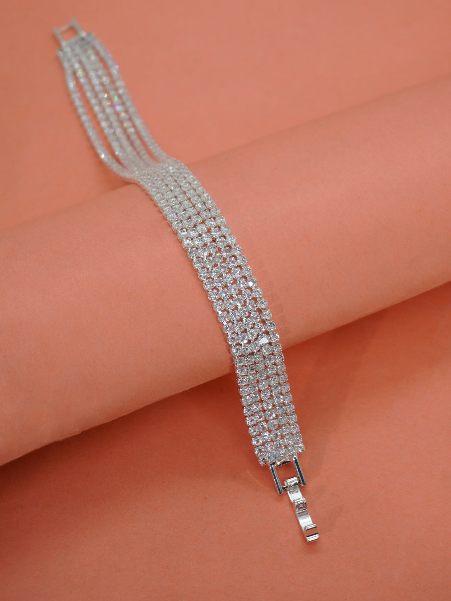 Pair this rhodium-plated bracelet with a sleek black dress or a tailored suit for a sophisticated evening look. For a more casual yet chic style, wear it with a crisp white blouse and denim jeans to add a touch of sparkle that elevates your everyday ensemble.