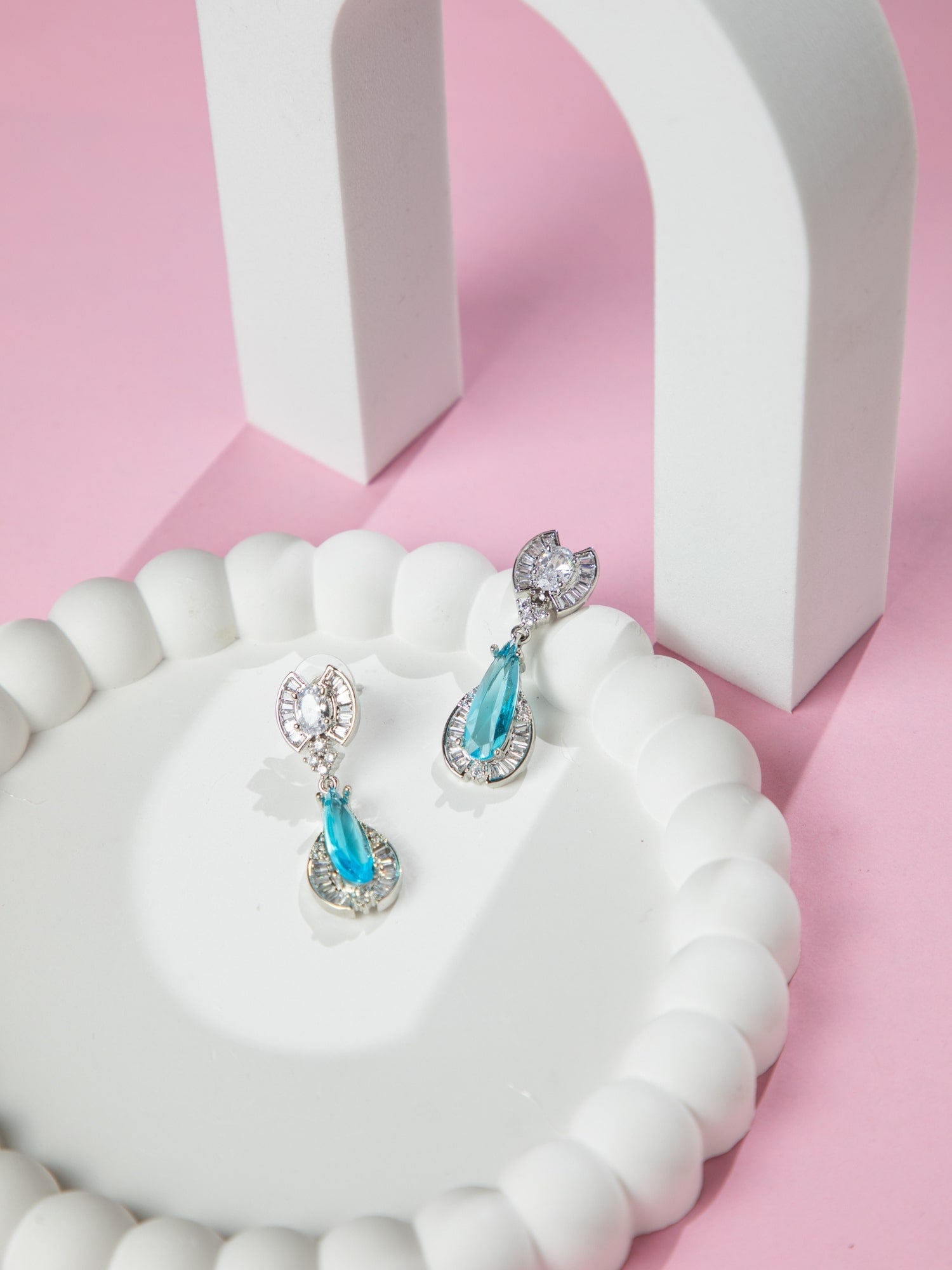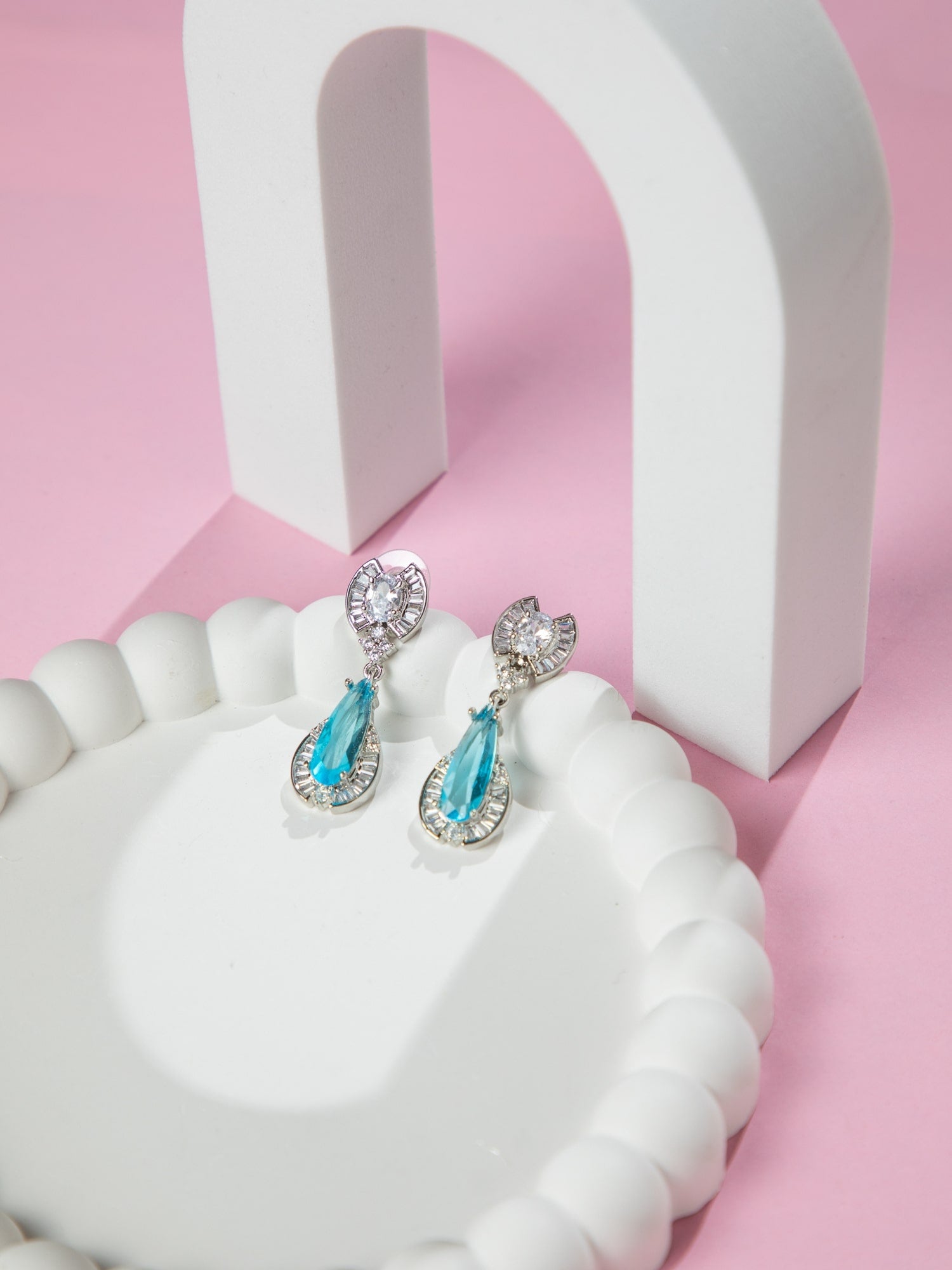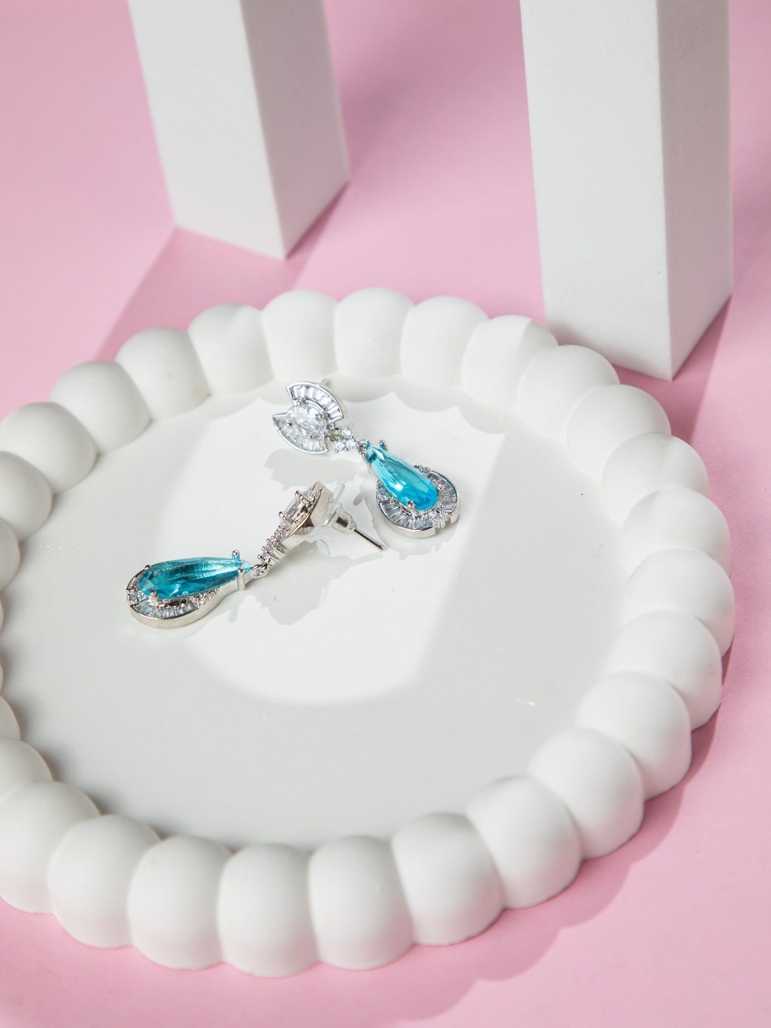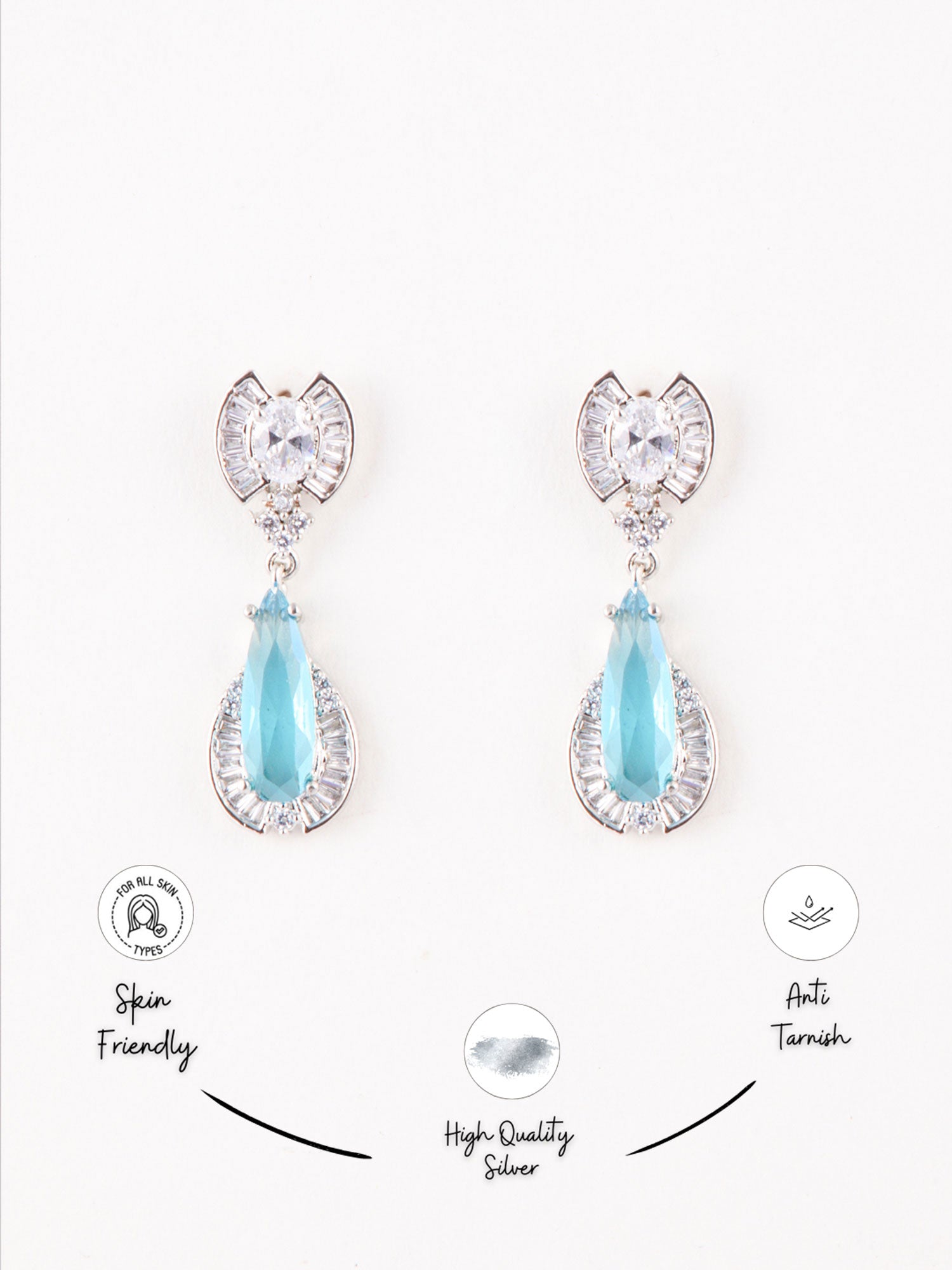 Rhodium Plated Earrings with Sky Blue and White American Diamond Stones