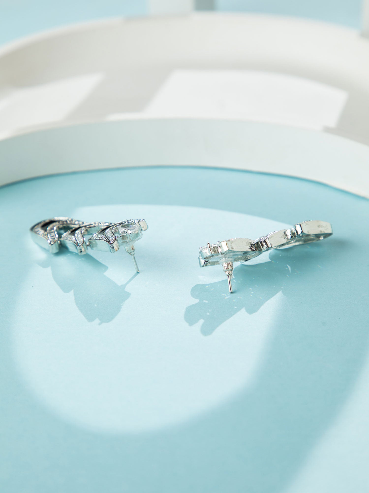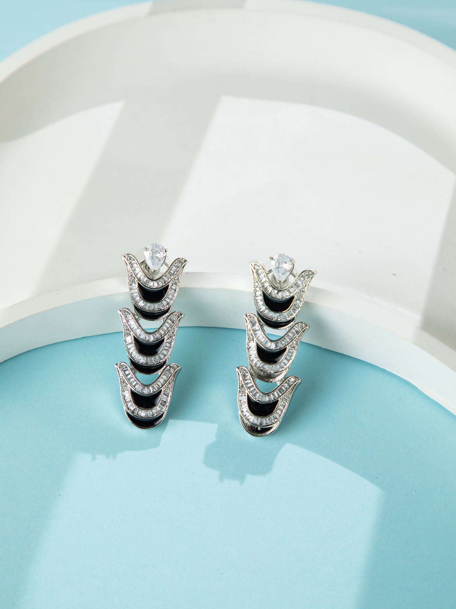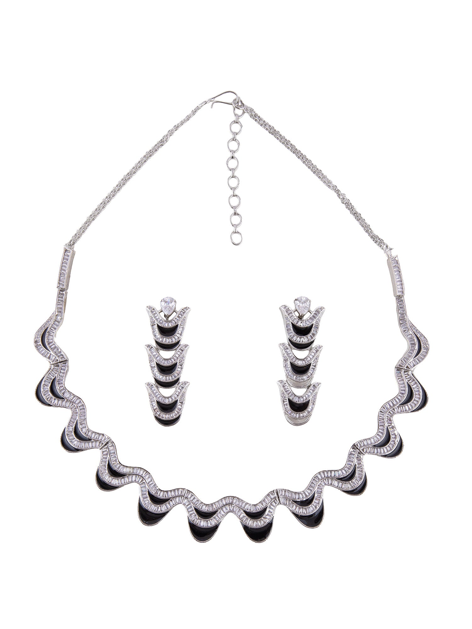 Rhodium Plated Wave Design Necklace with Black Meenakari and Matching Long Earrings