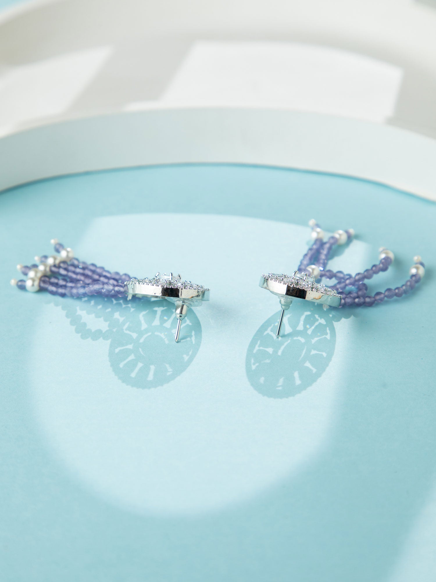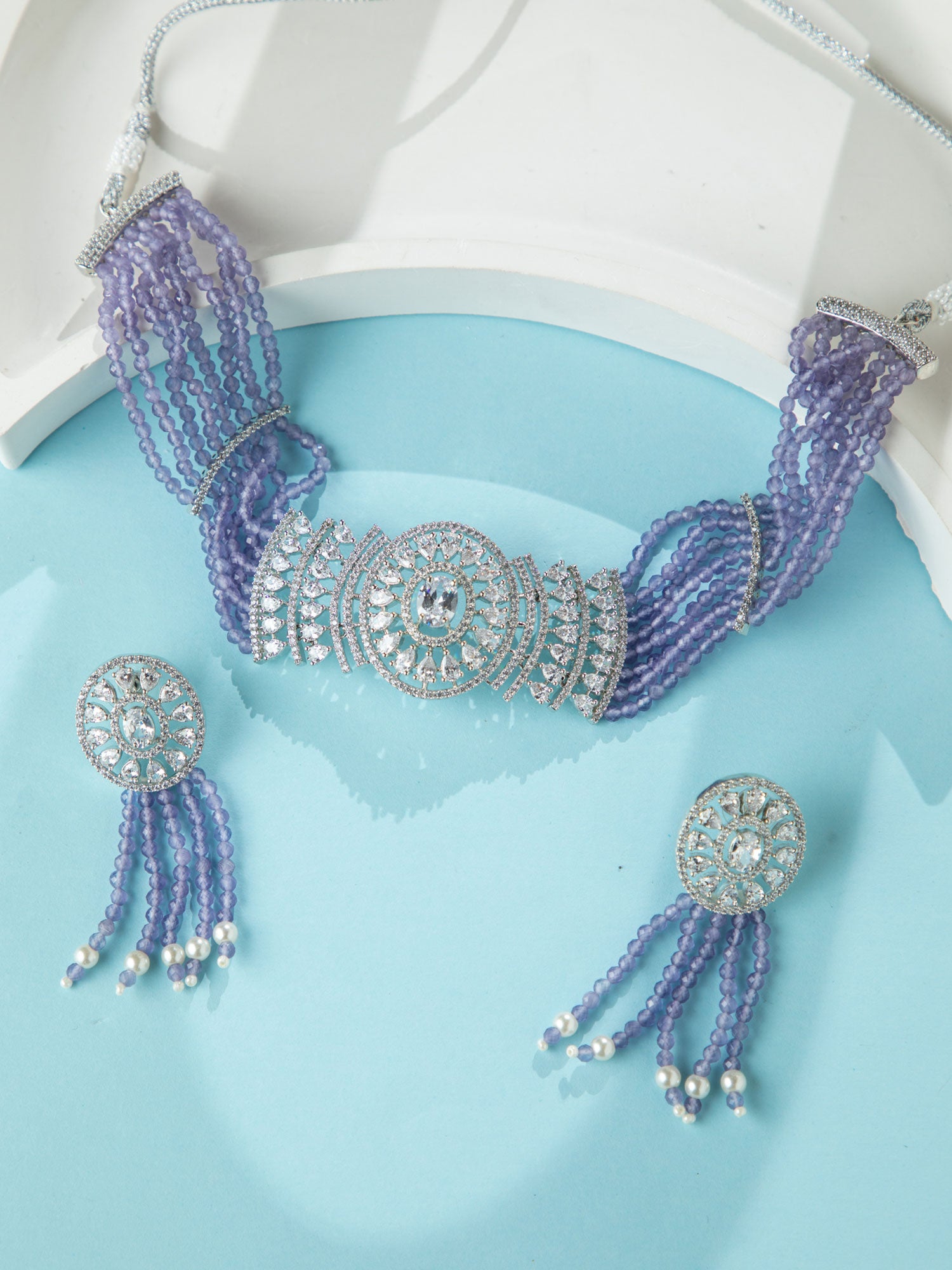 Rhodium Plated White American Diamond Choker with Multi Layer Purple Stone Necklace and Dangler Earrings