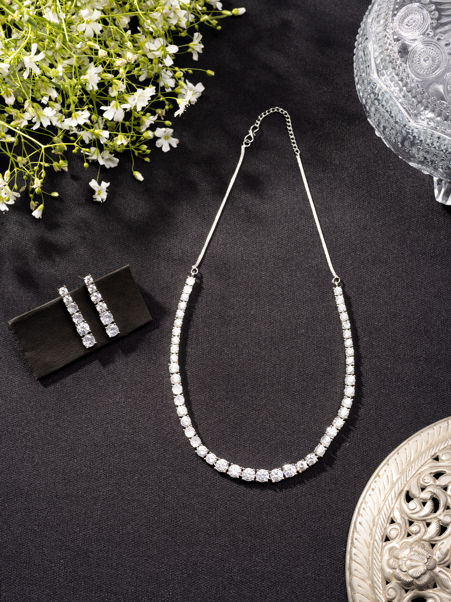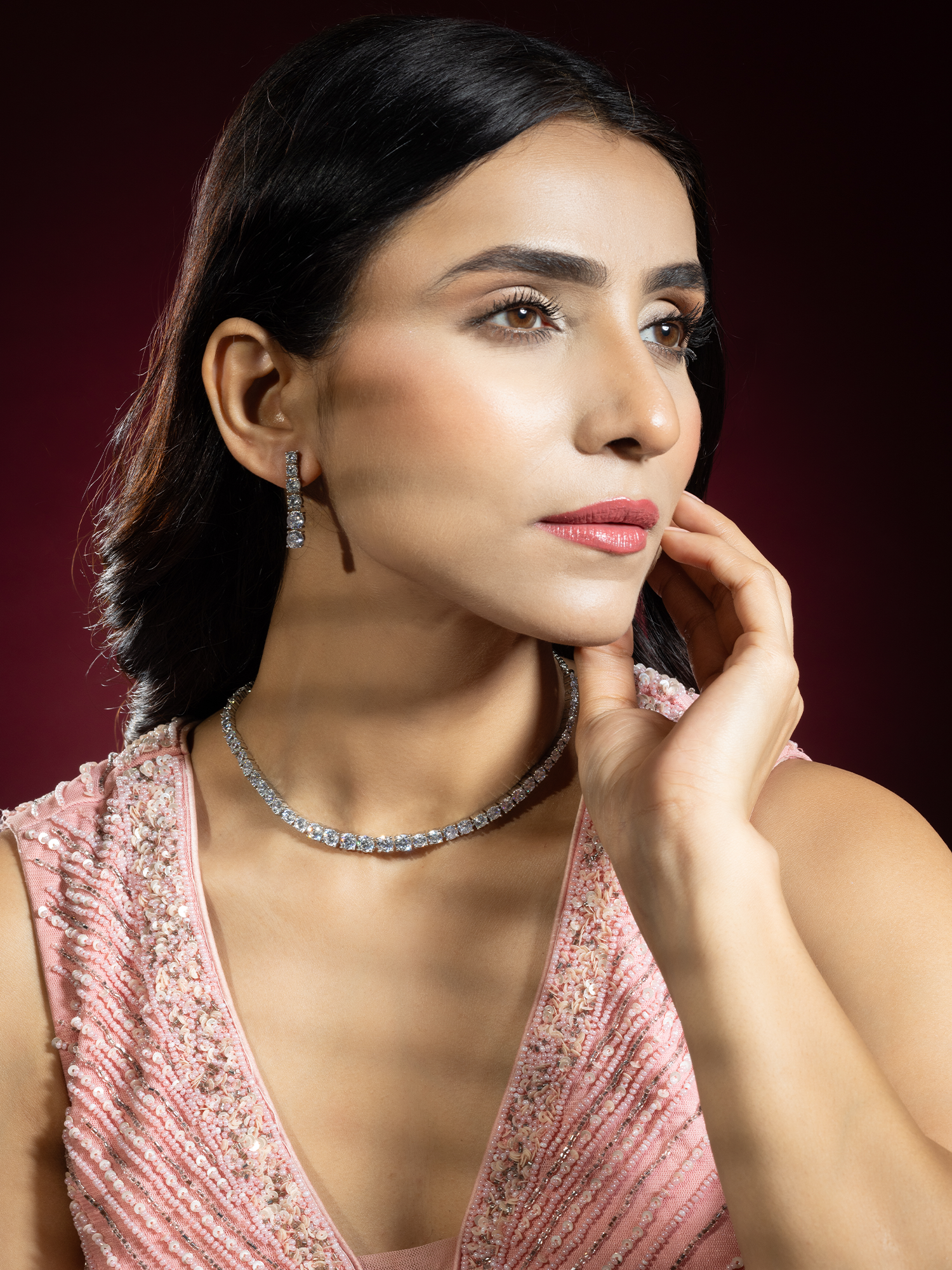 Pair this Rhodium Plated White American Diamond Tennis Necklace Set with Earrings with a sleek black evening gown for a classic and elegant look. Opt for a chic updo to showcase the dazzling jewelry.
