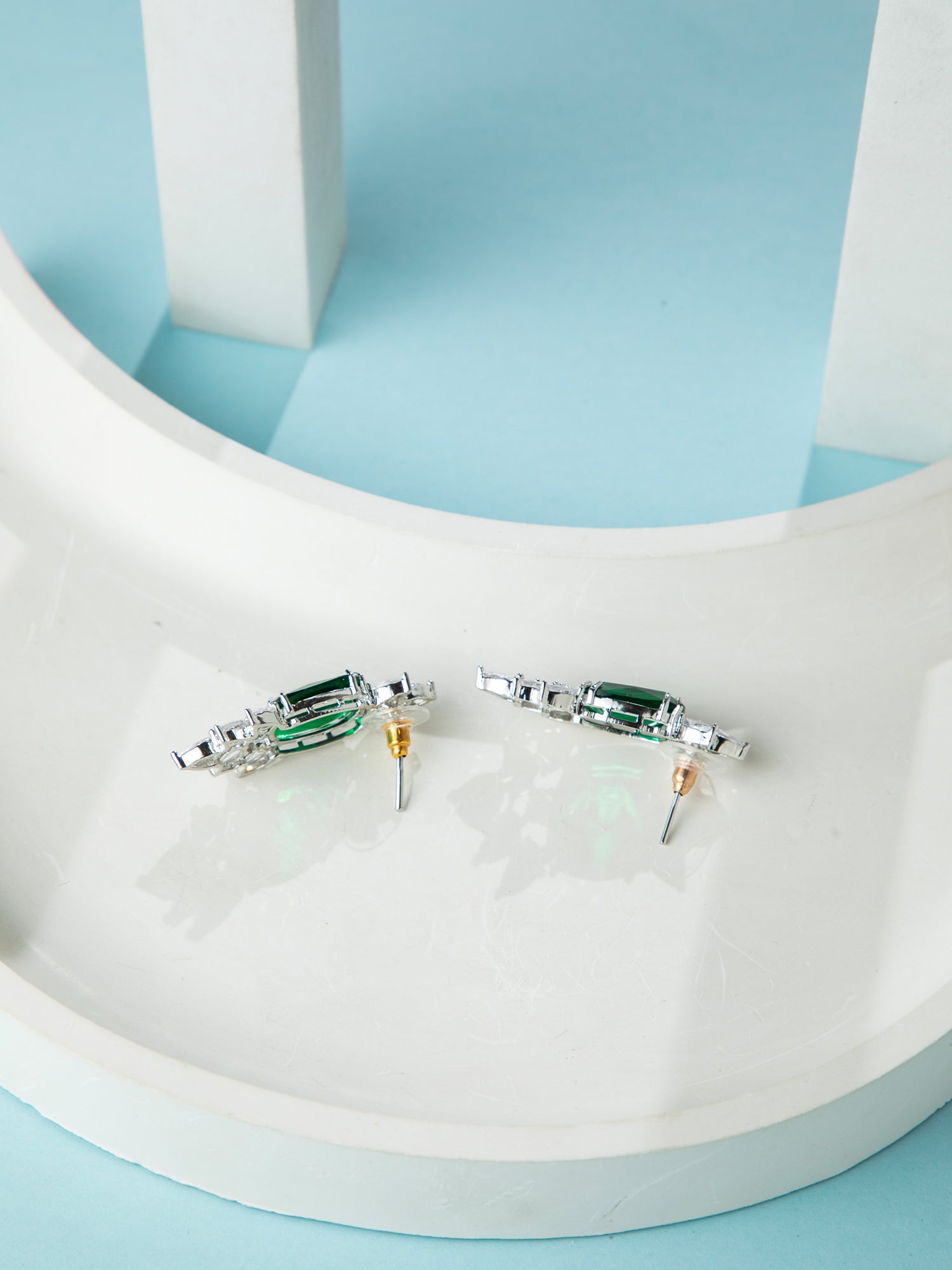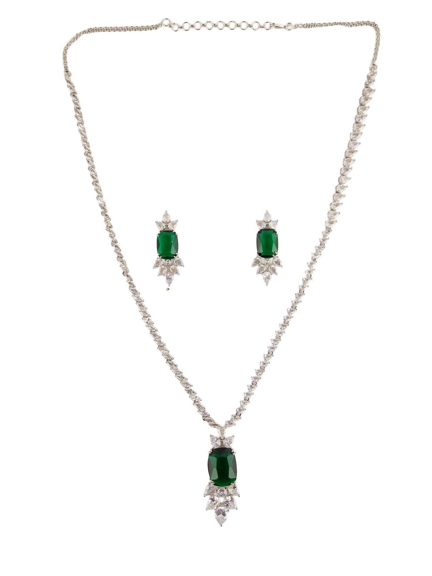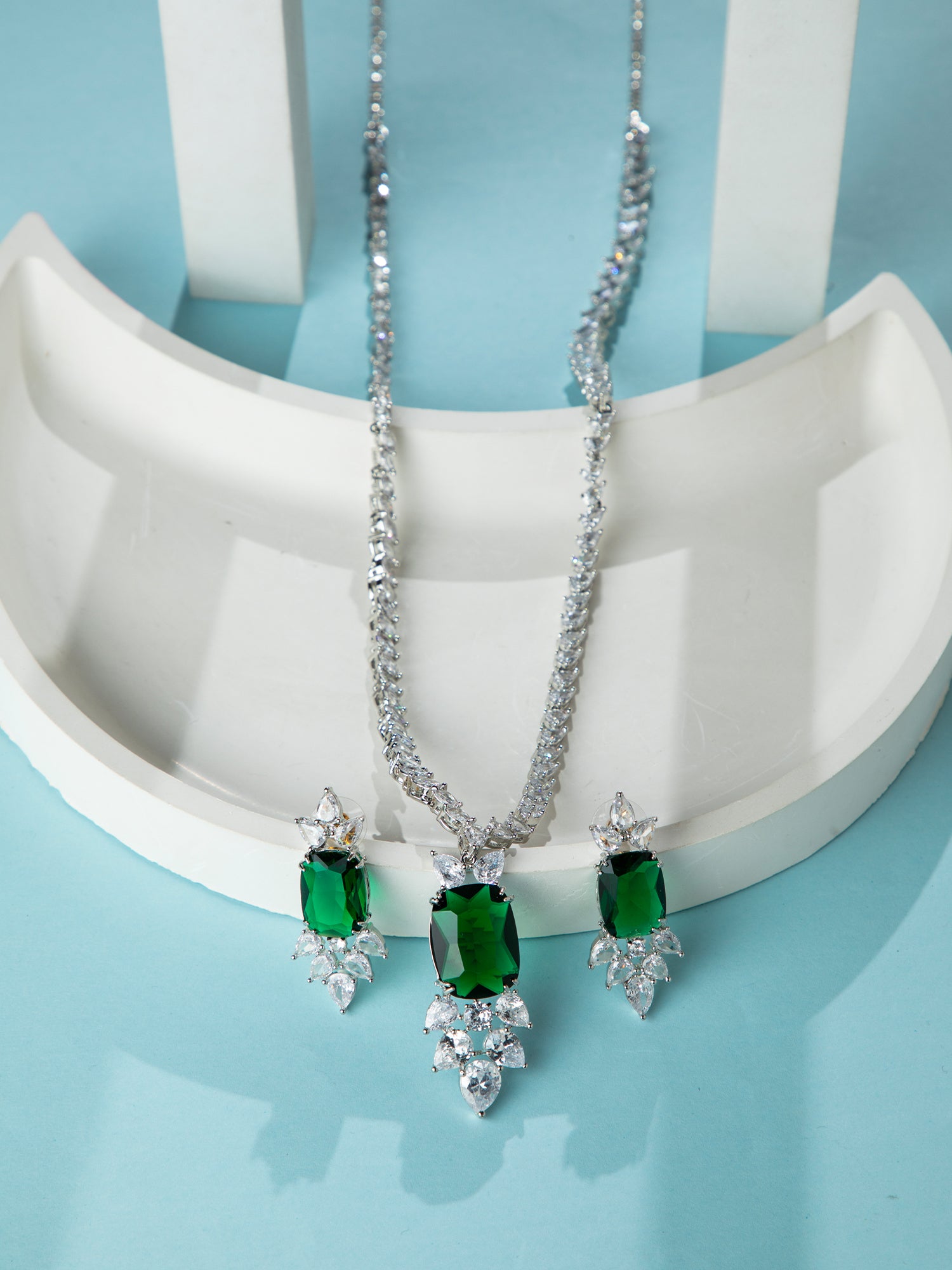 Rhodium Plated White and Green AD Emerald Statement Necklace Set