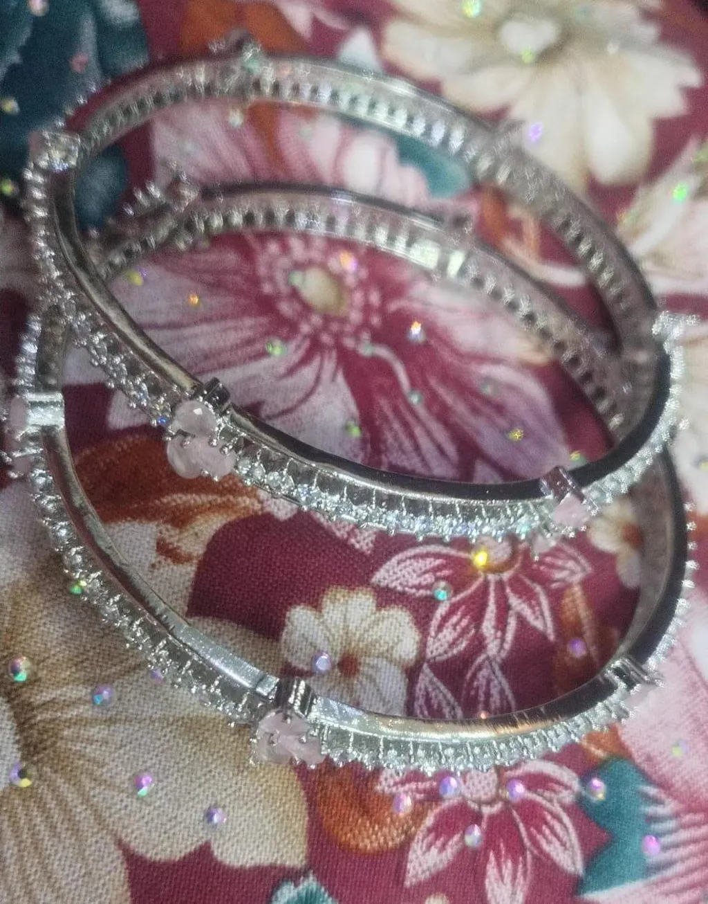 Introducing our exquisite Rhodium Plated White and Pink AD Bangles, a set of two adorned with beautiful American diamond stones. Meticulously crafted by local artisans, these bangles feature a trendy and fascinating new design that seamlessly blends elegance with modern flair. With anti-tarnish and anti-allergic properties, they are suitable for both function and party wear, ensuring enduring beauty and comfort. Elevate your ensemble with these versatile bangles, perfect for adding a touch of glamour to any occasion.