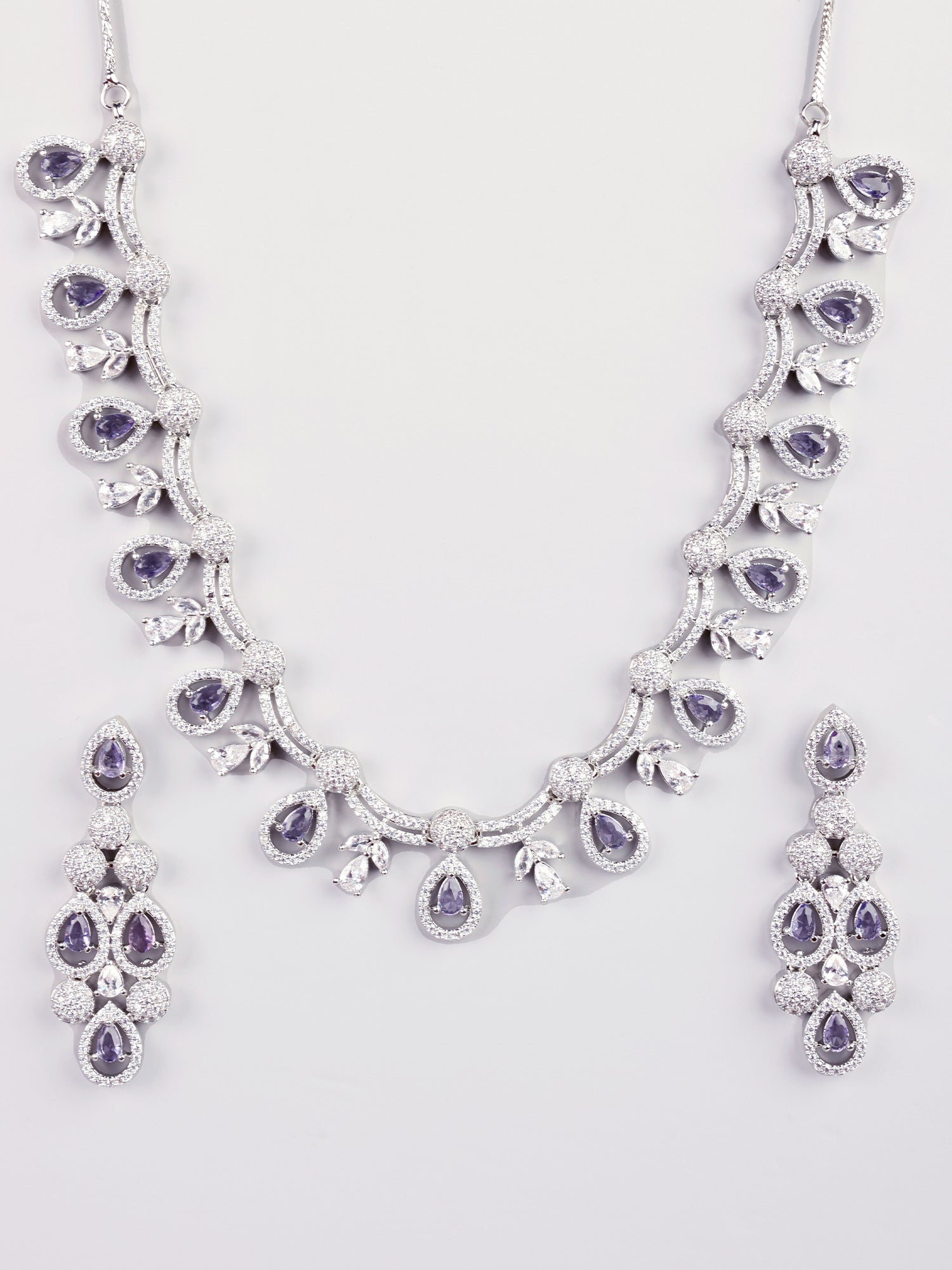 For an elegant look, wear the Rhodium Plated White and Purple AD Necklace set with Earrings with a deep purple evening gown, allowing the sparkling stones to complement your attire and add a touch of sophistication.
