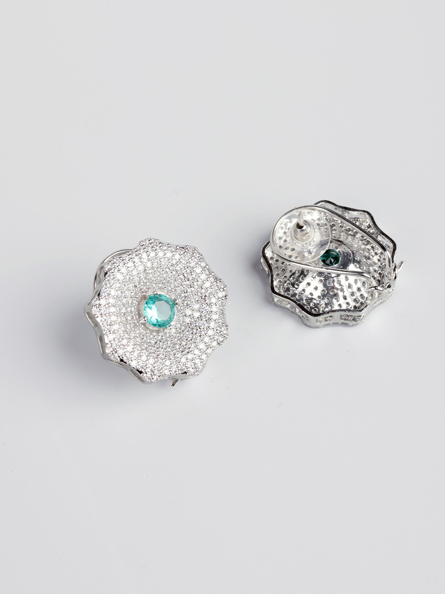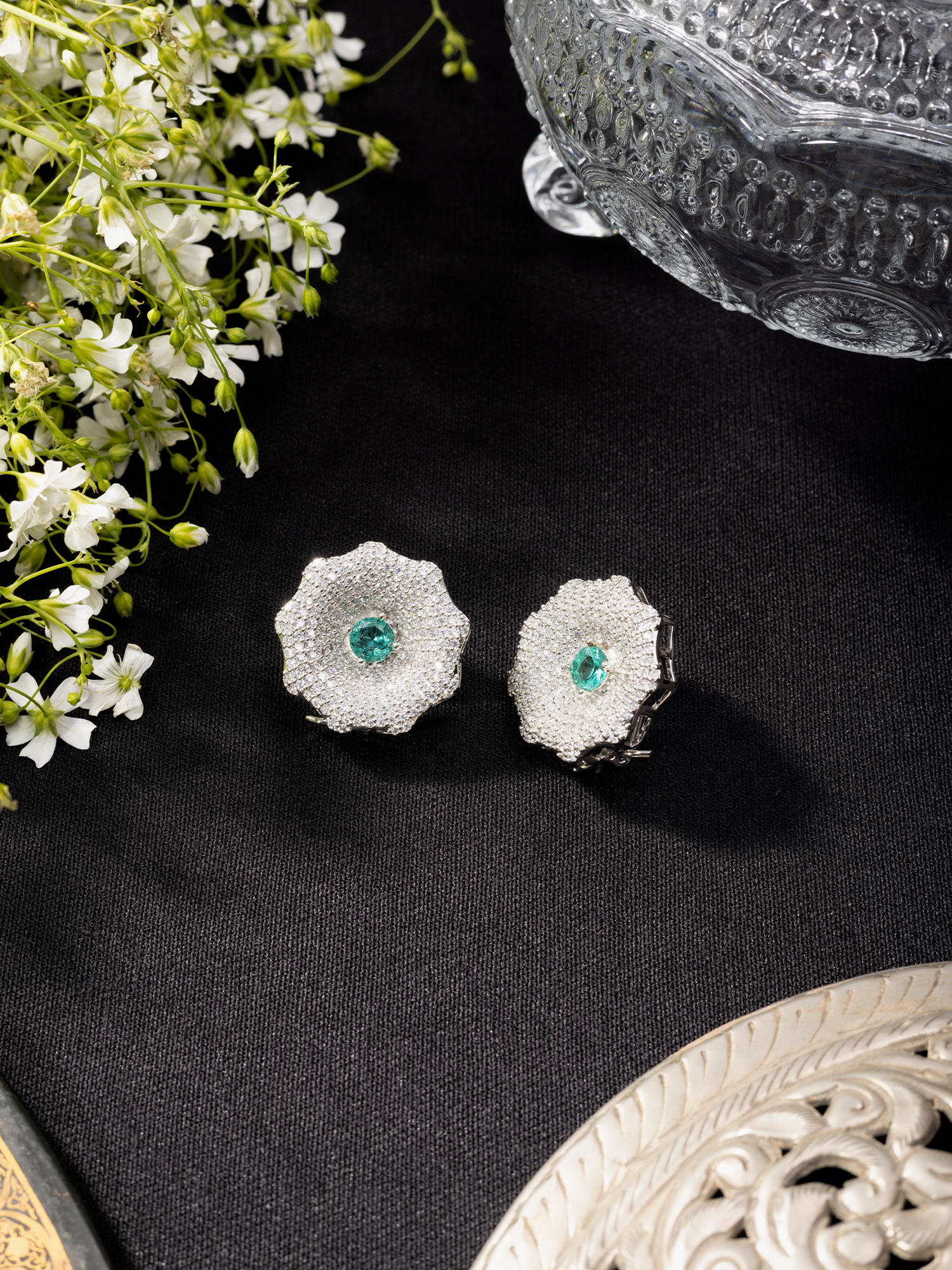Introducing our dazzling Rhodium Plated White and Aqua Green American Diamond Earrings, adorned with sparkling white American diamond stones intricately arranged in a captivating design. A stunning aqua green CZ stone in the middle adds a touch of elegance. Handcrafted by local artisans, these earrings feature a trendy and fascinating new design. Crafted with anti-tarnish and anti-allergic properties, they are perfect for both function and party wear, ensuring enduring beauty and comfort for any occasion.
