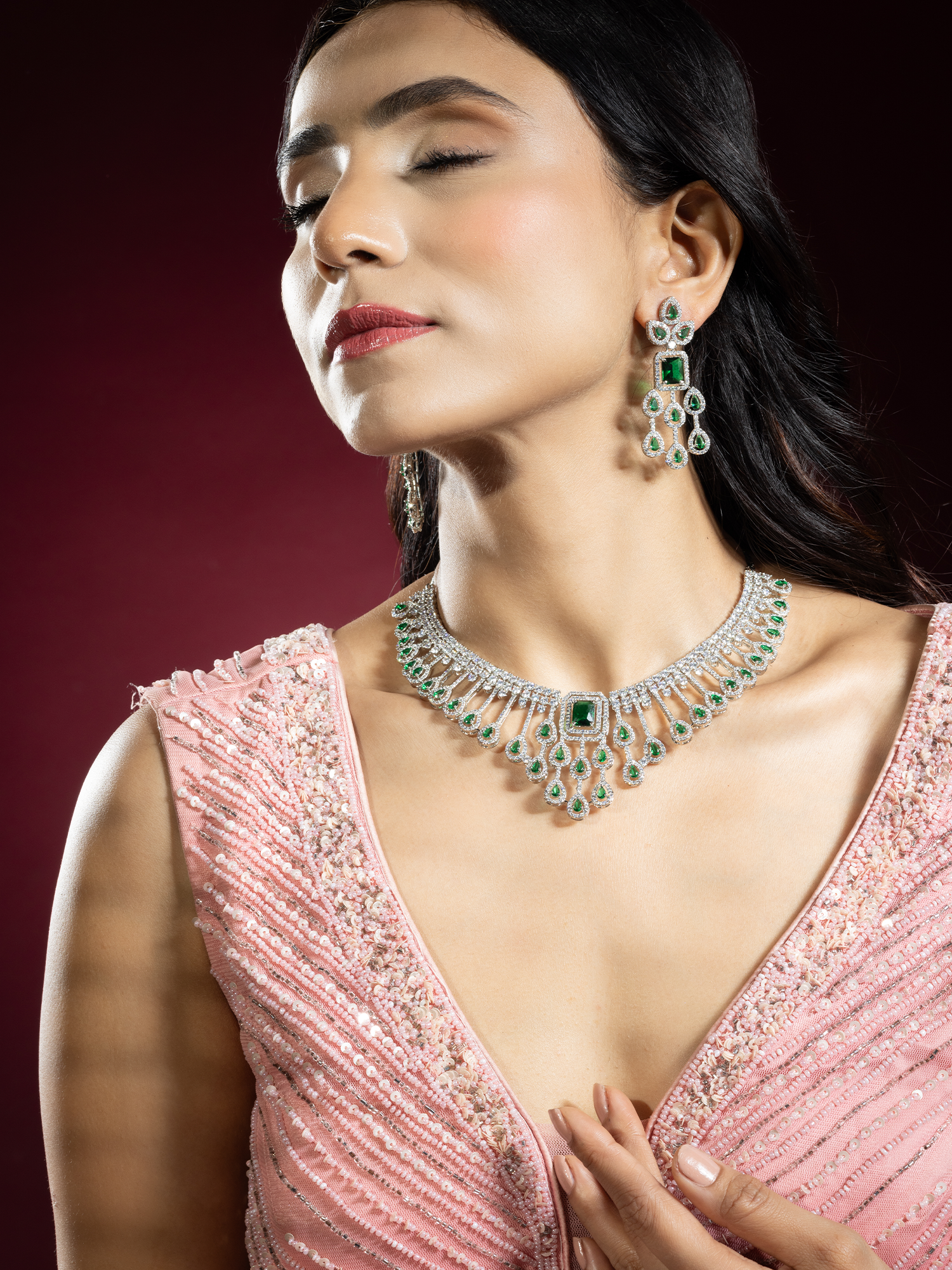 For a sophisticated look, pair the Rhodium Plated White and Emerald American Diamond Necklace Set with a sleek bun and a deep green or white evening gown, allowing the stunning stones to shine as the focal point of your ensemble.