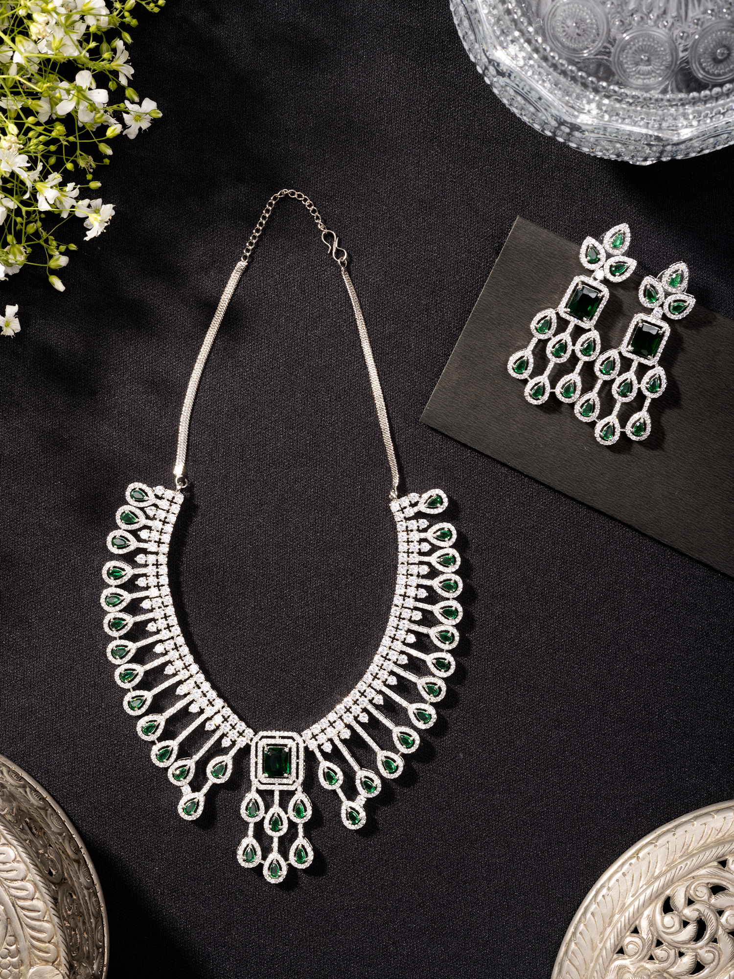Introducing our enchanting Rhodium Plated White and Emerald American Diamond Necklace Set with matching earrings, adorned with sparkling white American diamond stones in a captivating design. Beautiful green CZ stones add a touch of elegance to this must-wear accessory for any function. The set features big earrings embellished with emerald and white CZ stones, showcasing a trendy and fascinating new design. Handmade by local artisans, this set is crafted with anti-tarnish and anti-allergic properties, perfect for both function and party wear.