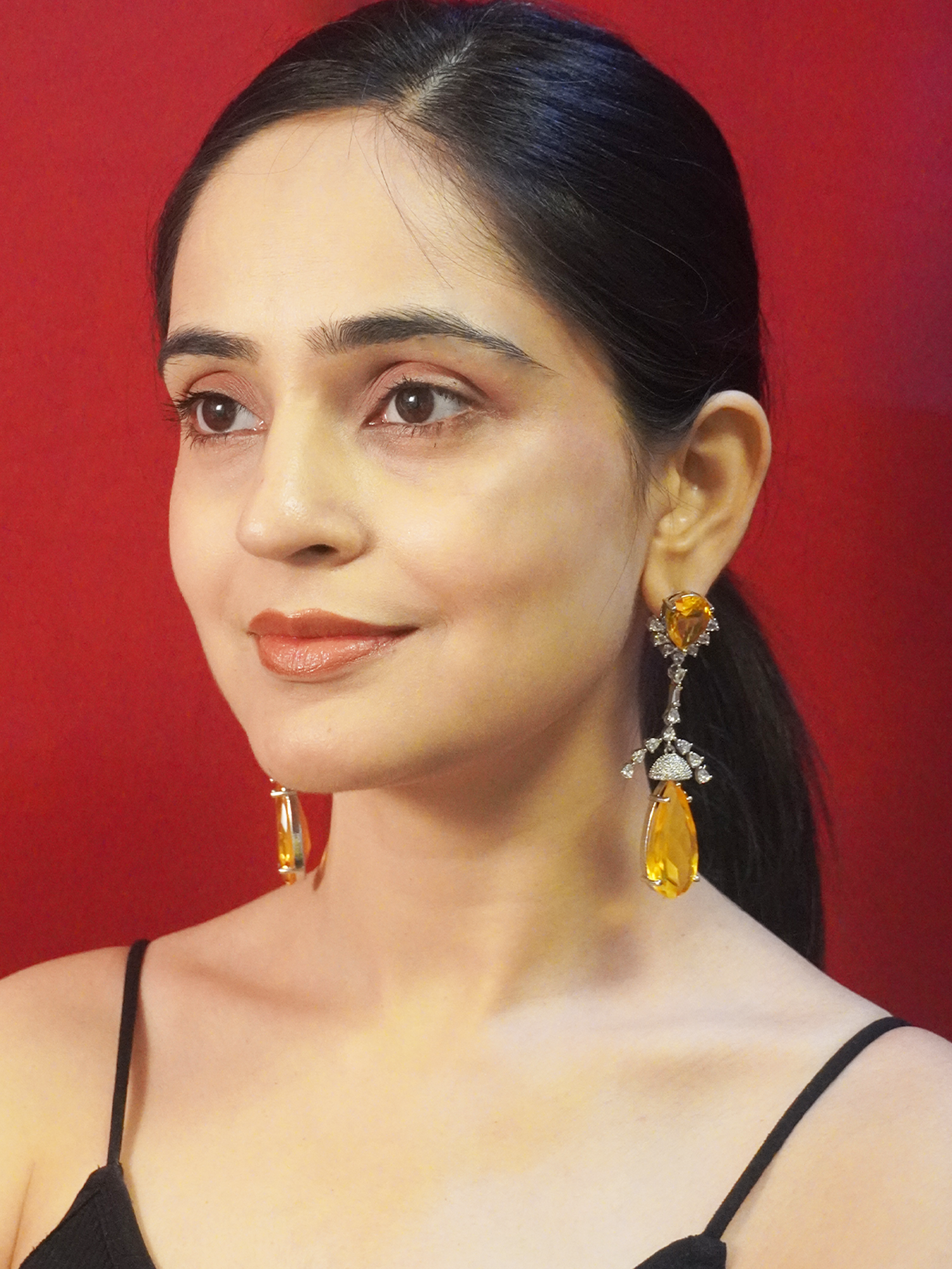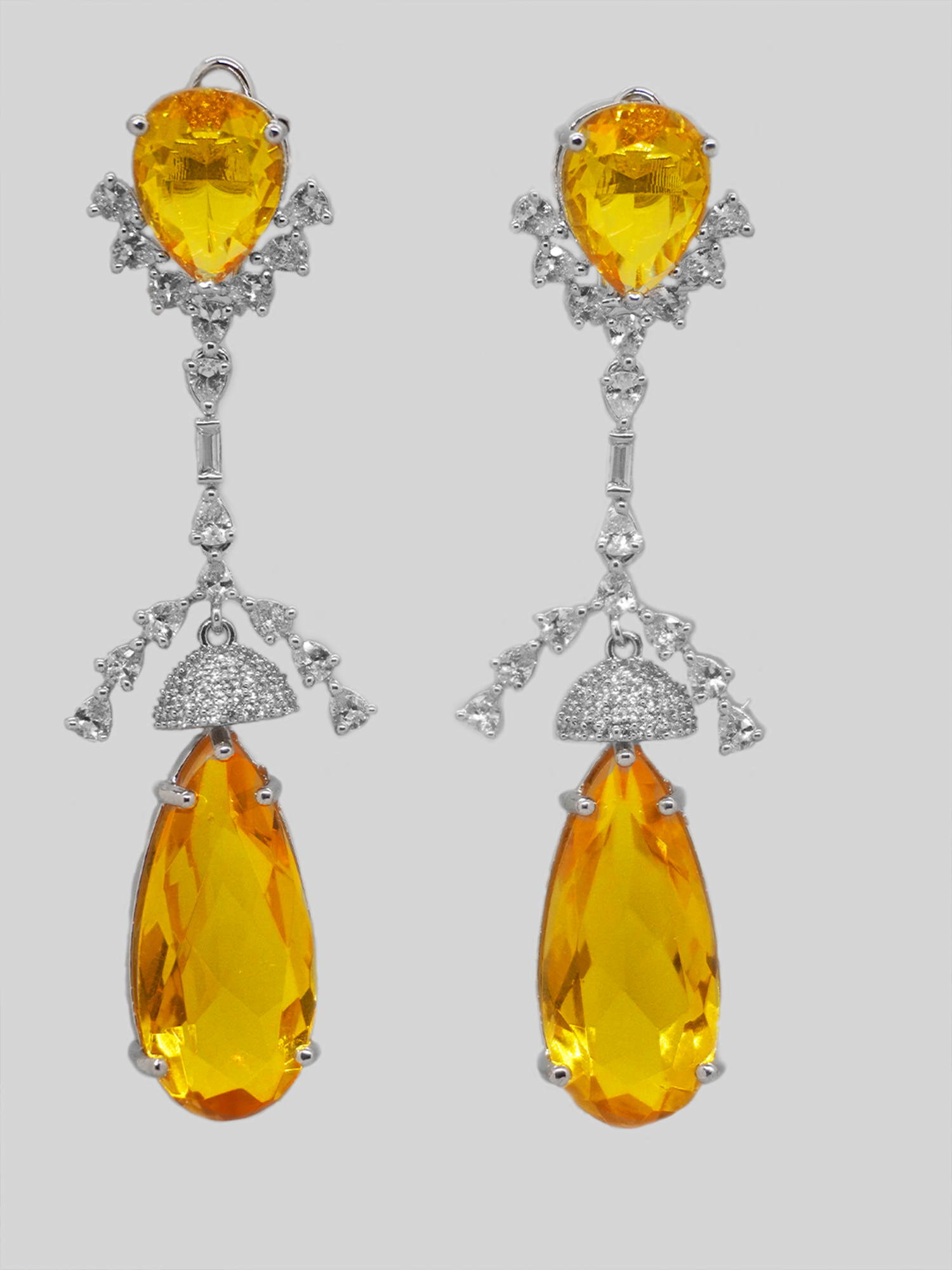 Pair these elegant earrings with a mustard yellow or ivory evening gown to highlight the yellow stones. Opt for a chic updo or loose curls and add subtle yellow accessories for a coordinated and sophisticated look.