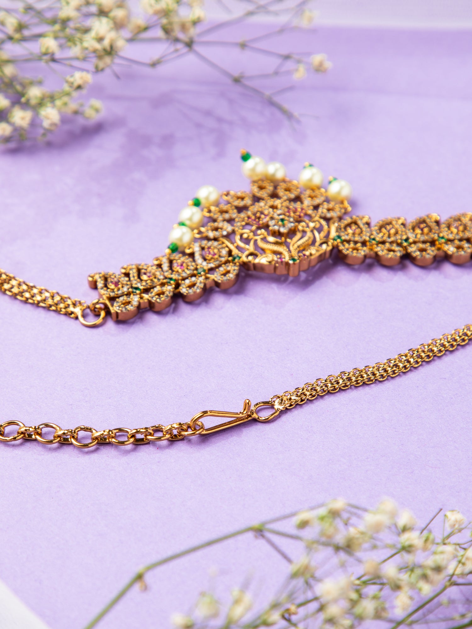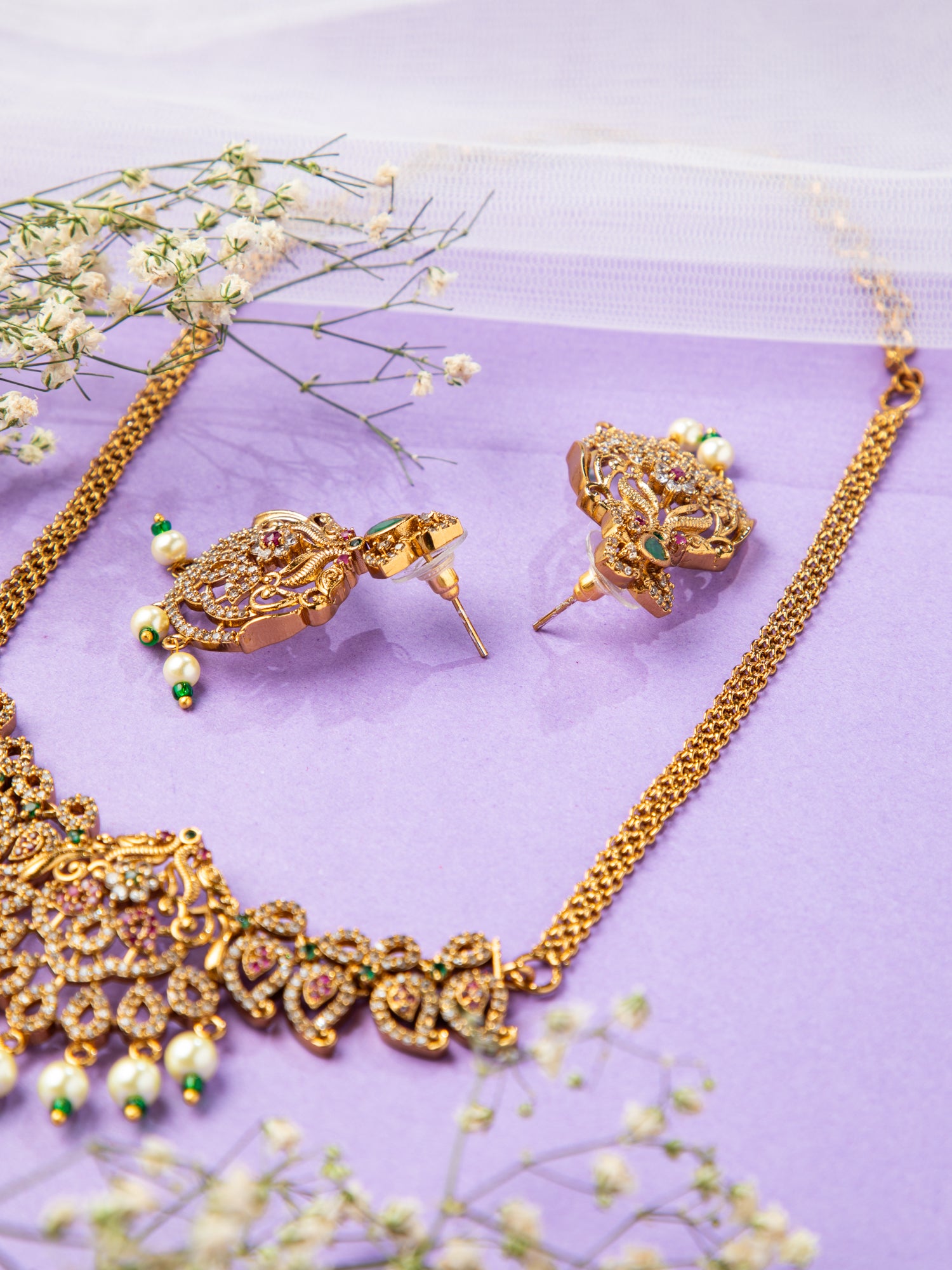Step into timeless tradition with the Riwaayat Necklace Set — a majestic piece crafted in a rich gold-plated finish, adorned with sparkling American Diamonds and accented with vibrant pink and green stones. The intricate peacock-inspired detailing, floral motifs, and delicate pearl drops evoke a regal, heritage charm. Paired with coordinating earrings, this set is perfect for weddings, cultural festivities, and grand celebrations.