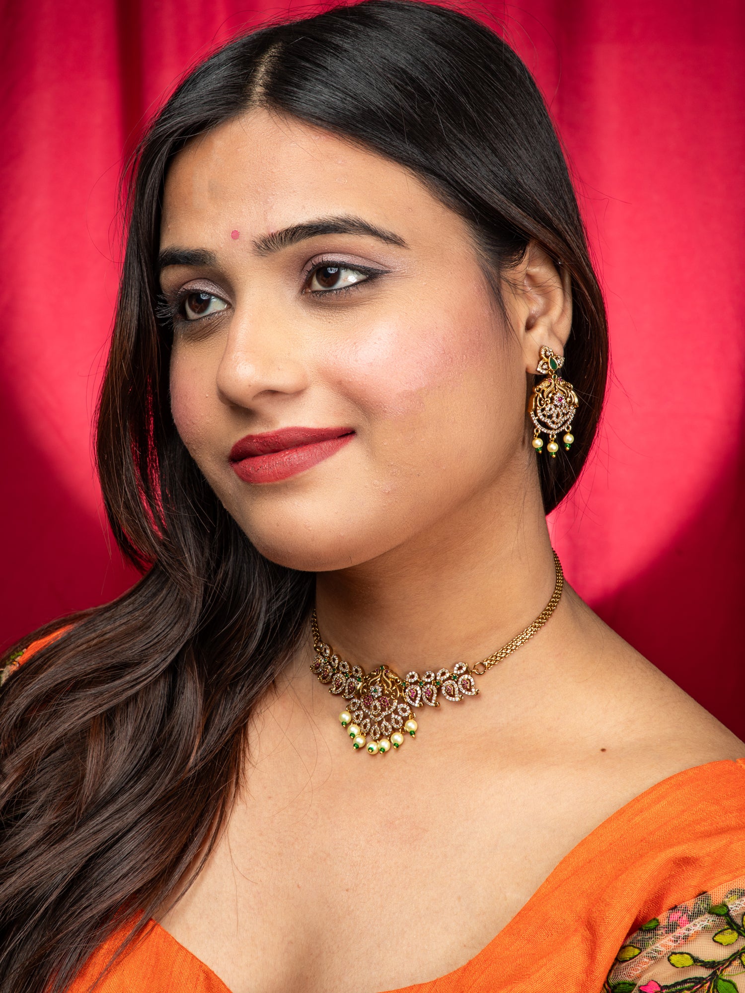 Style this set with silk sarees, Kanjeevarams, or heavily embroidered lehengas for a truly royal look. Opt for a center-parted bun or braided updo to highlight the necklace and earrings. Complete the ensemble with gold bangles and a bindi to embrace the full elegance of traditional Indian glamour.