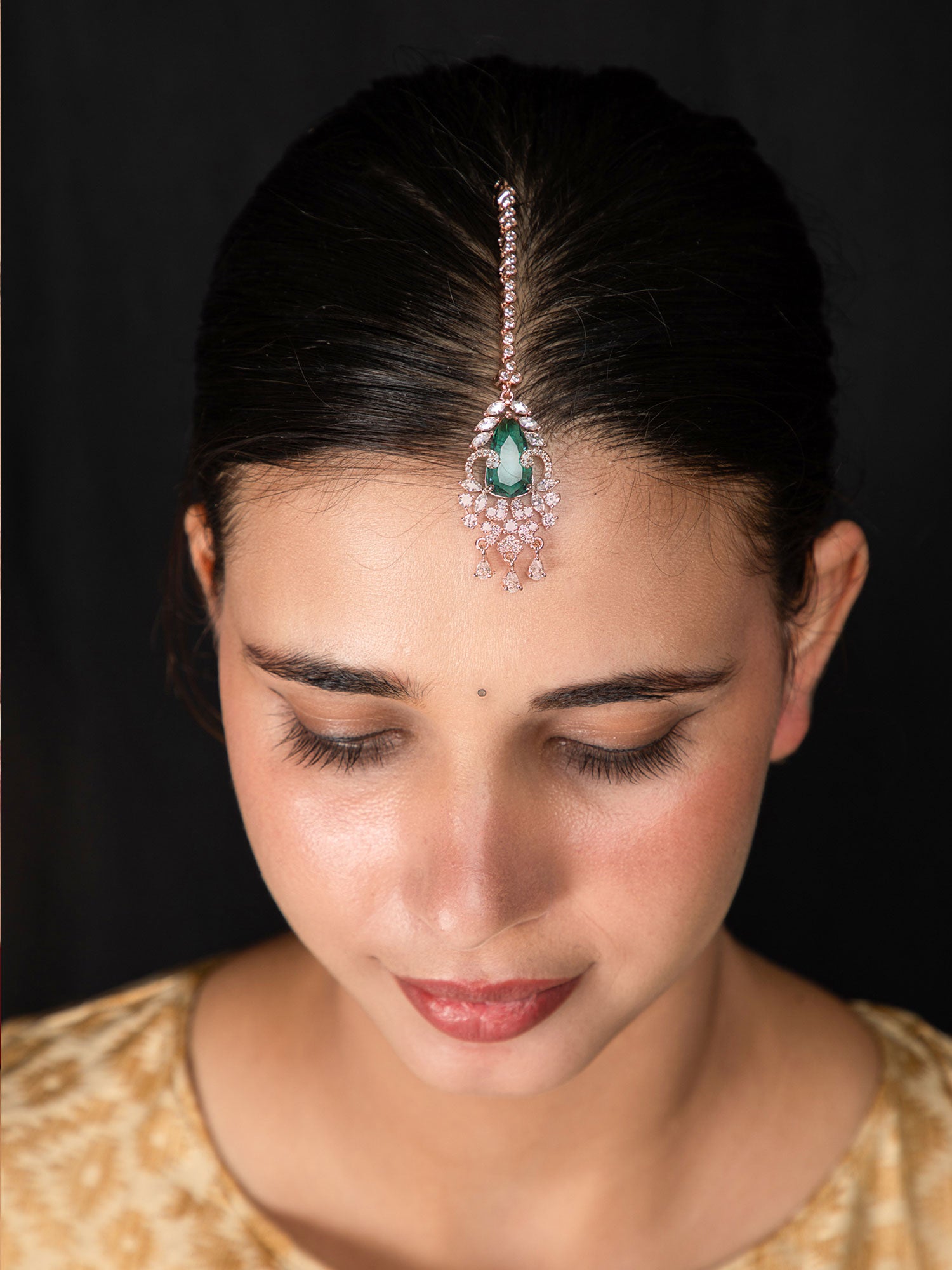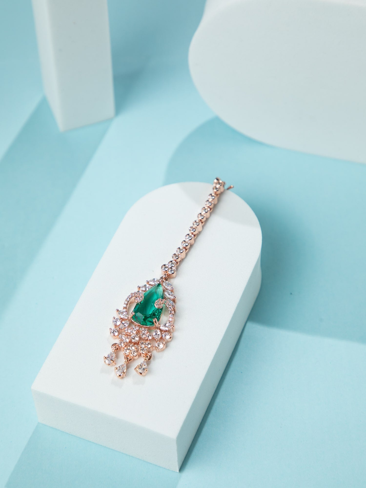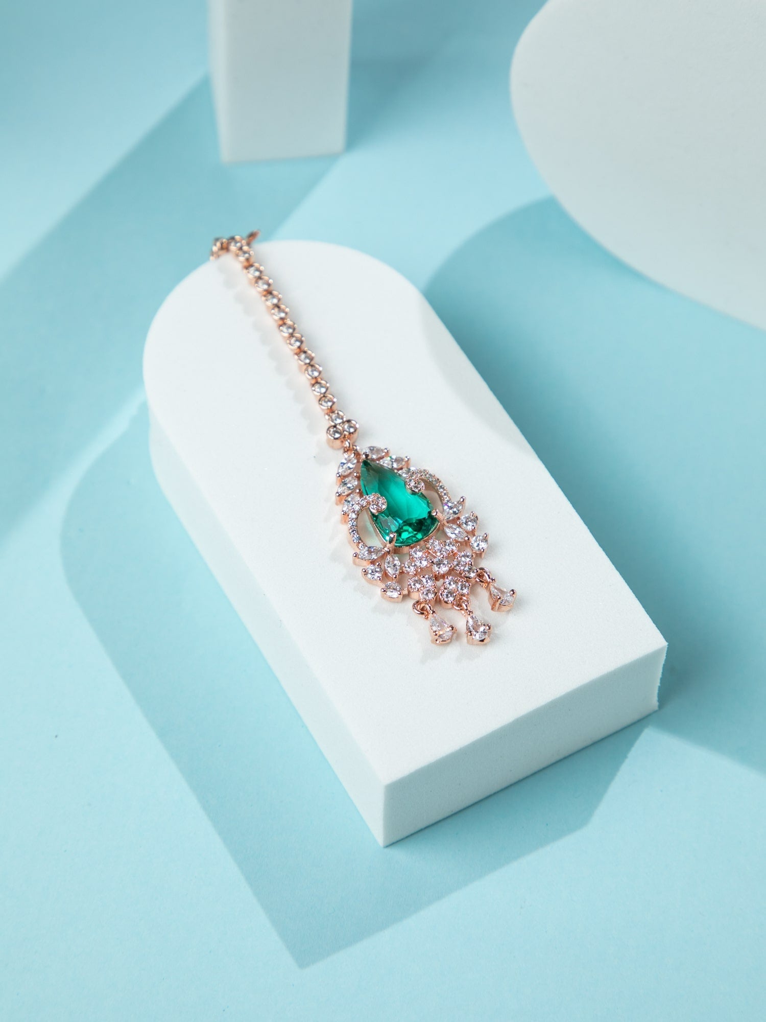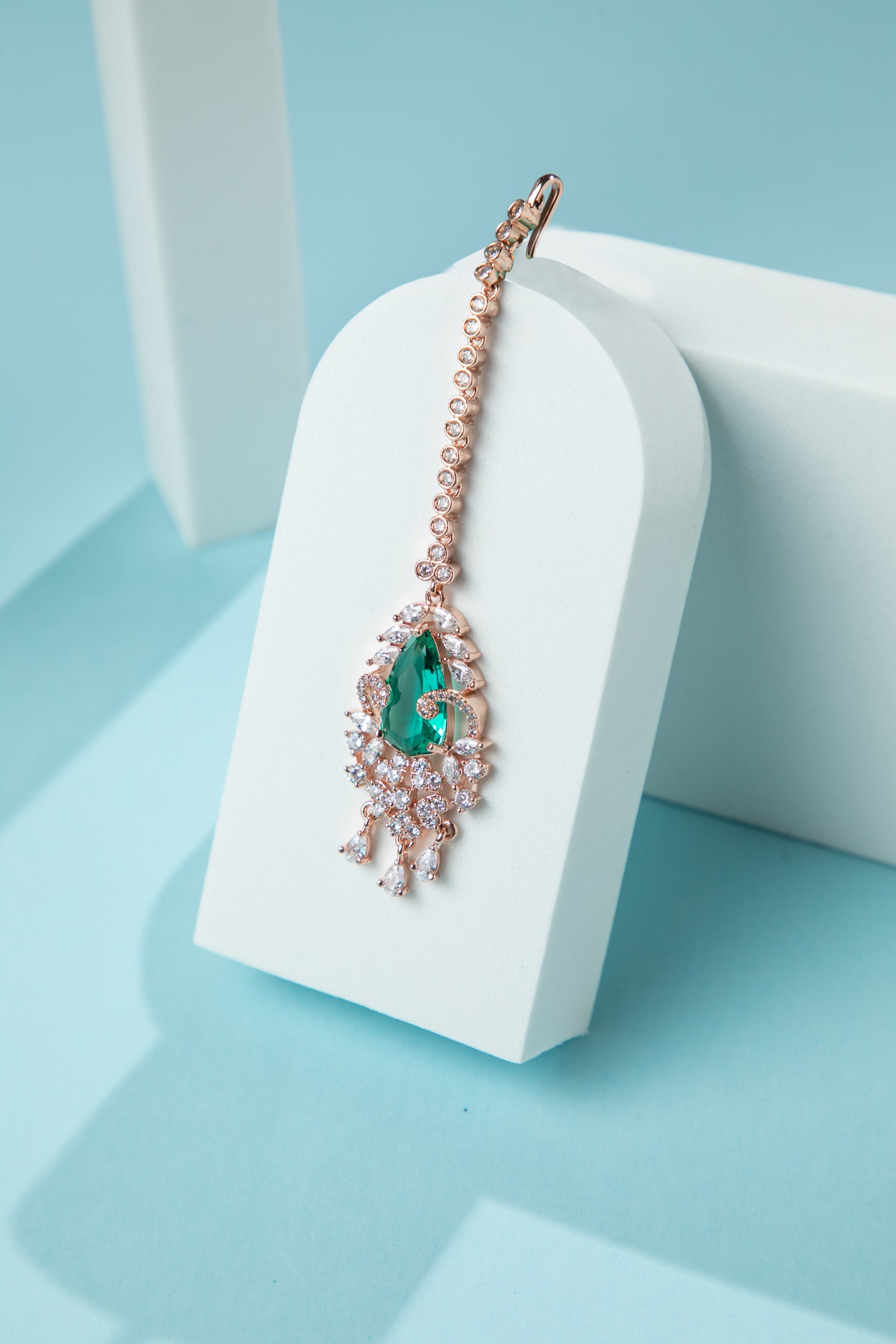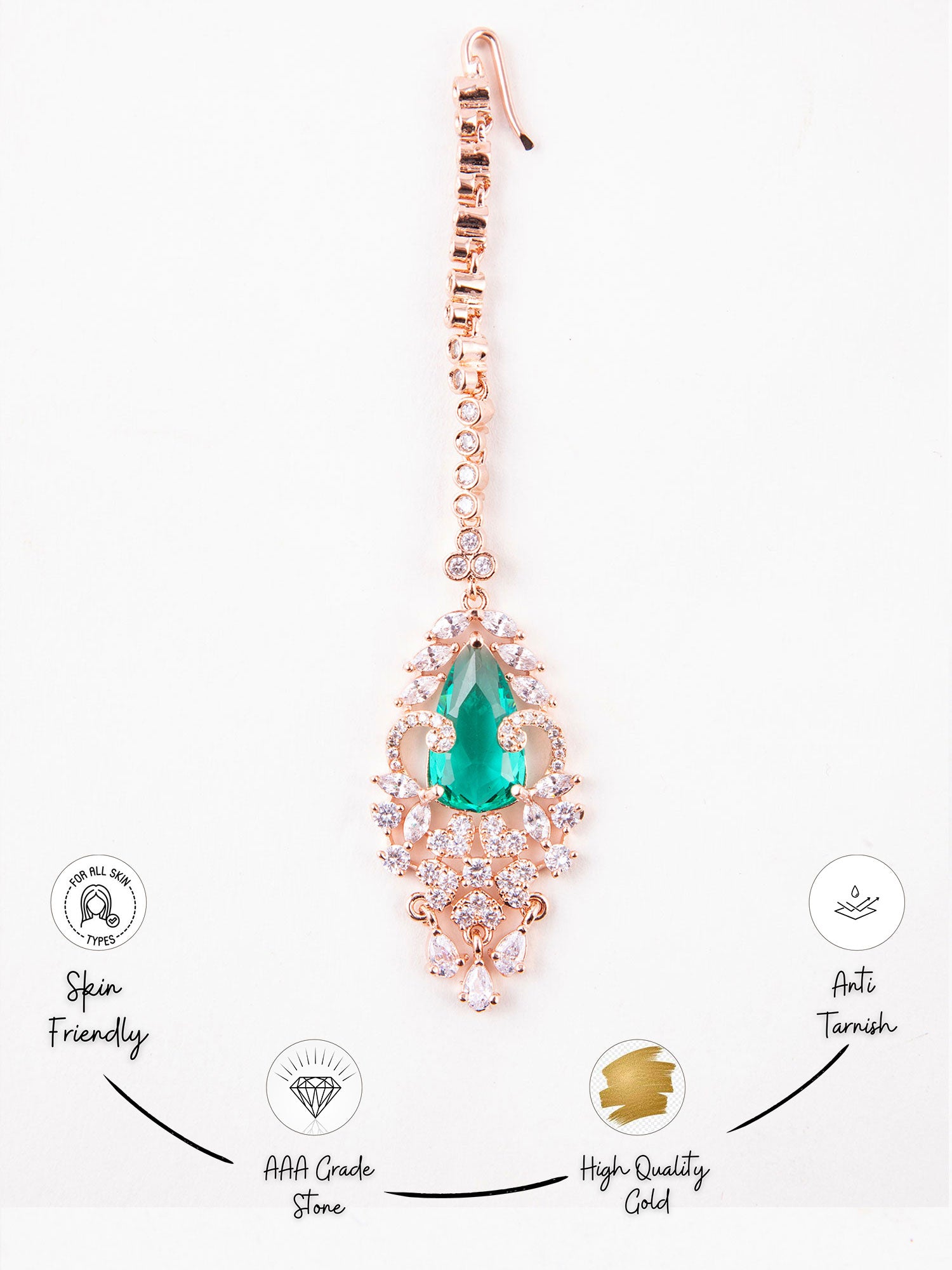 Rose Gold Plated American Diamond Maang Tika with White and Green Stone