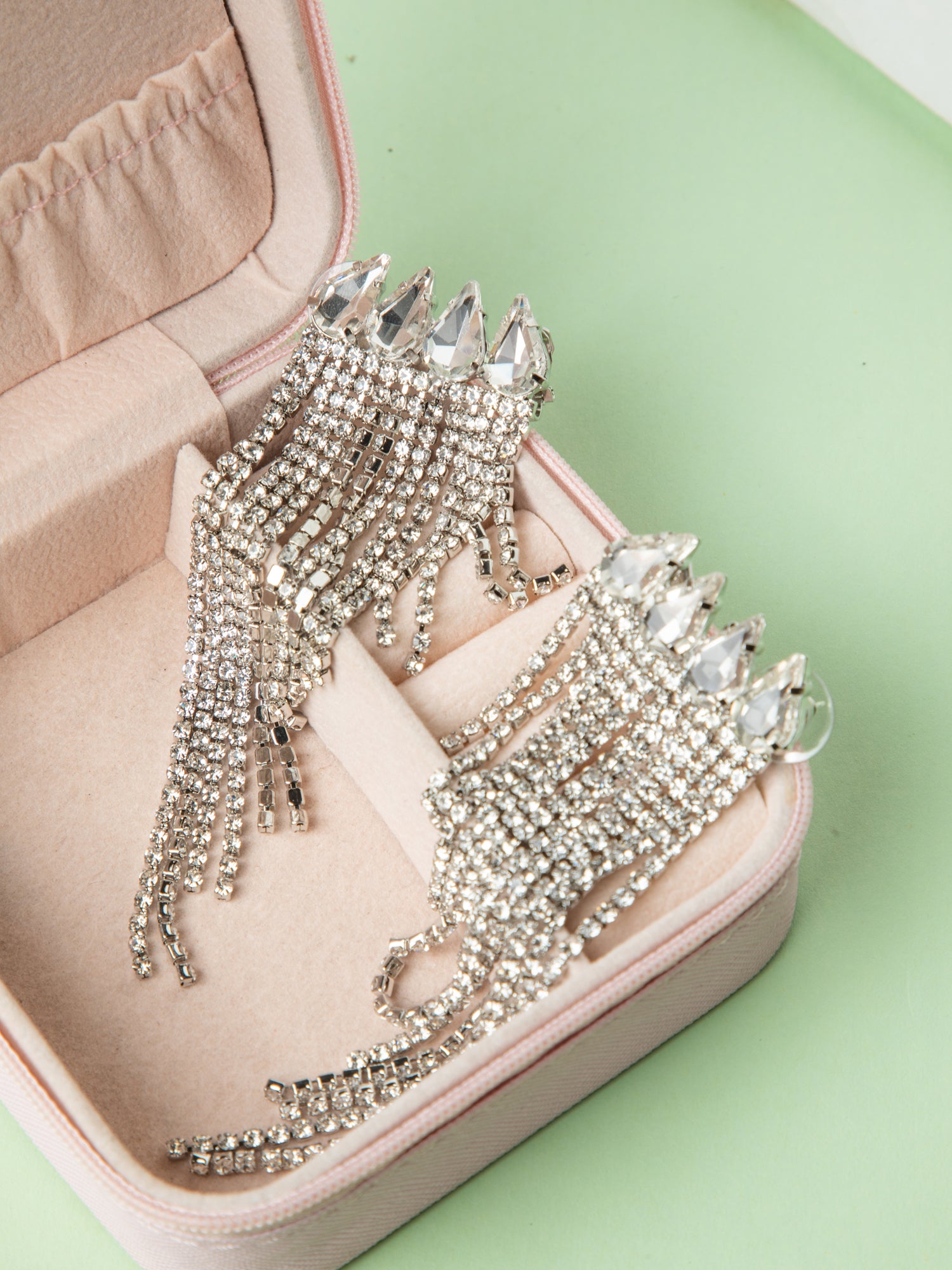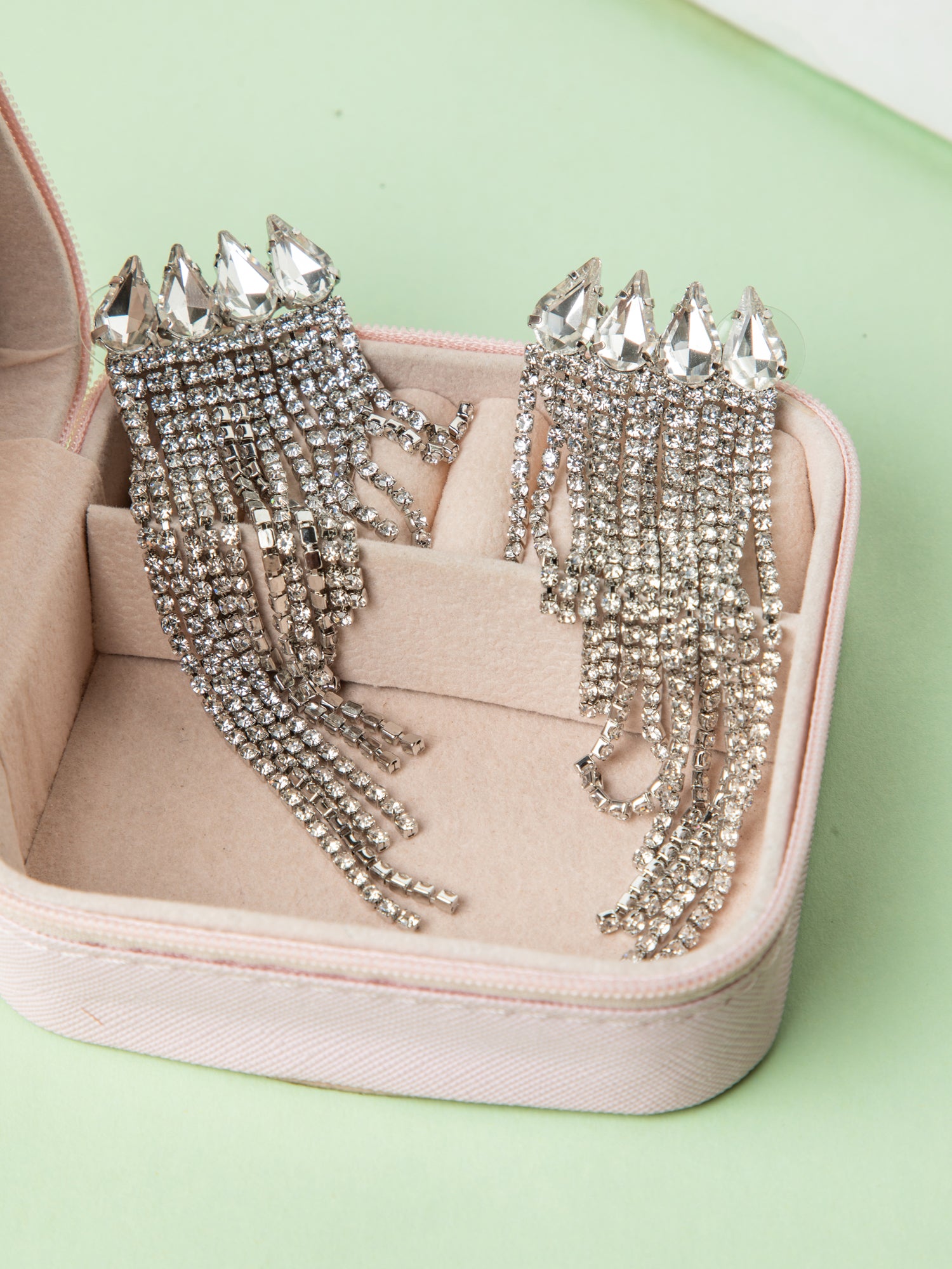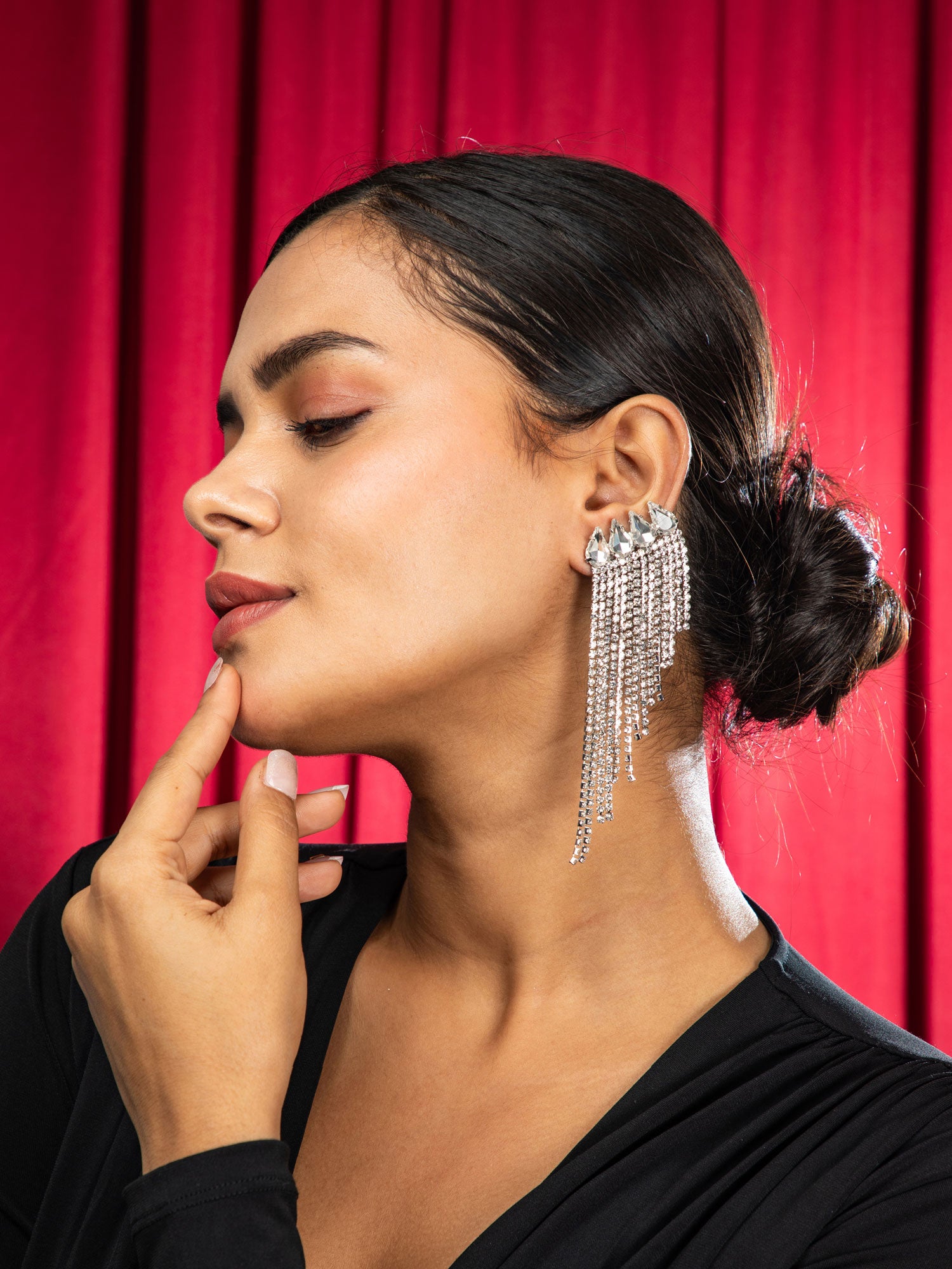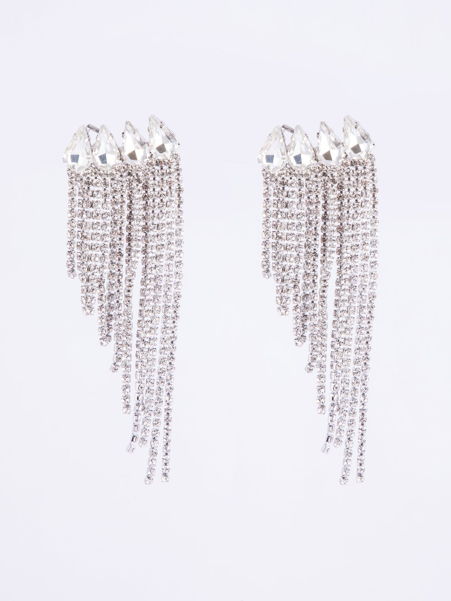 Add a touch of glamour with these rhodium plated silver earrings, featuring elegant multi layered chain hangings and sparkling white CZ stones. Perfect for festivals, functions, or party wear.
