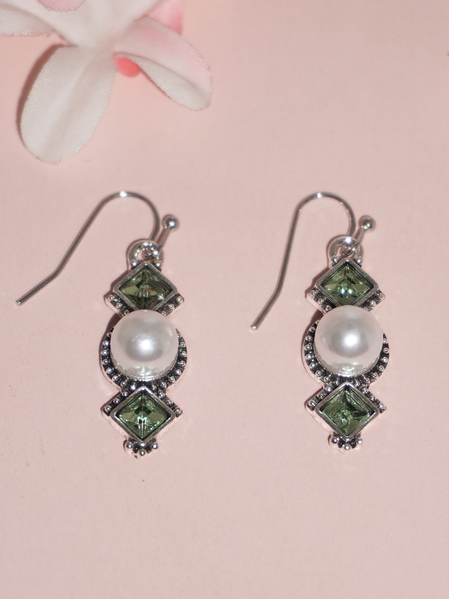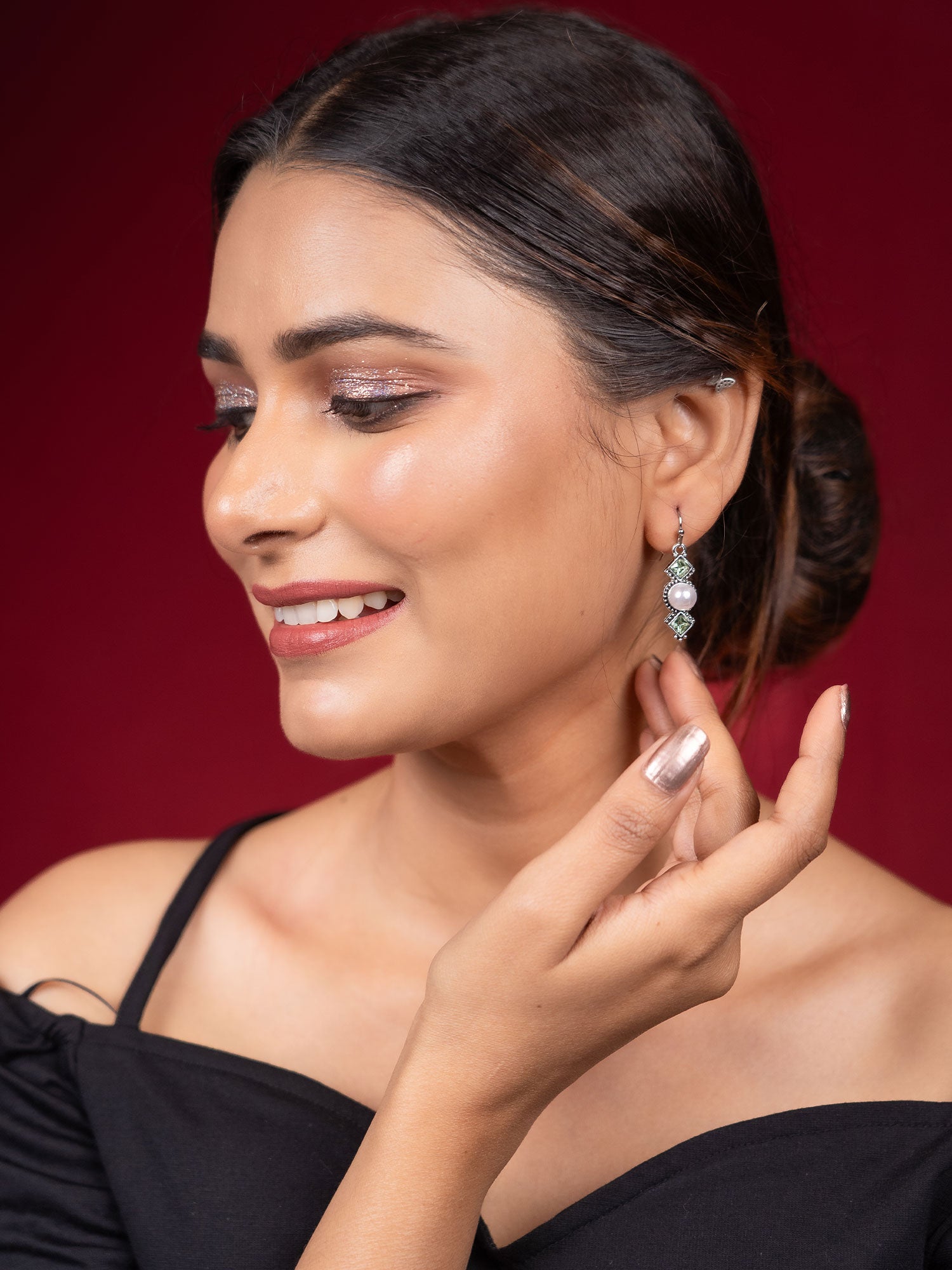 These elegant sterling silver earrings feature a stunning combination of pearls and green drops, creating a perfect balance of sophistication and charm. Adorned with sparkling zircon stones, the earrings offer a brilliant shimmer that catches the light with every movement. The lustrous pearls add a classic touch, while the green drop stones bring a pop of vibrant color to the design. Perfect for both formal and semi-formal occasions, these zircon-studded earrings add a refined touch of elegance and glamour to any ensemble. Whether you're dressing up for a wedding, dinner party, or special event, these earrings will make a beautiful statement.