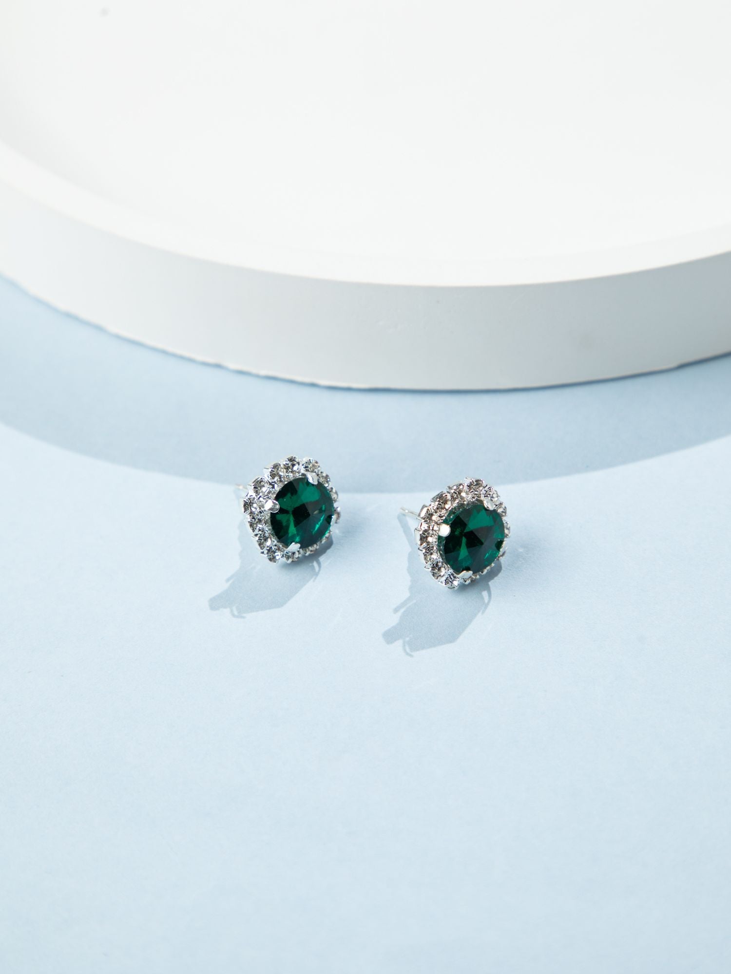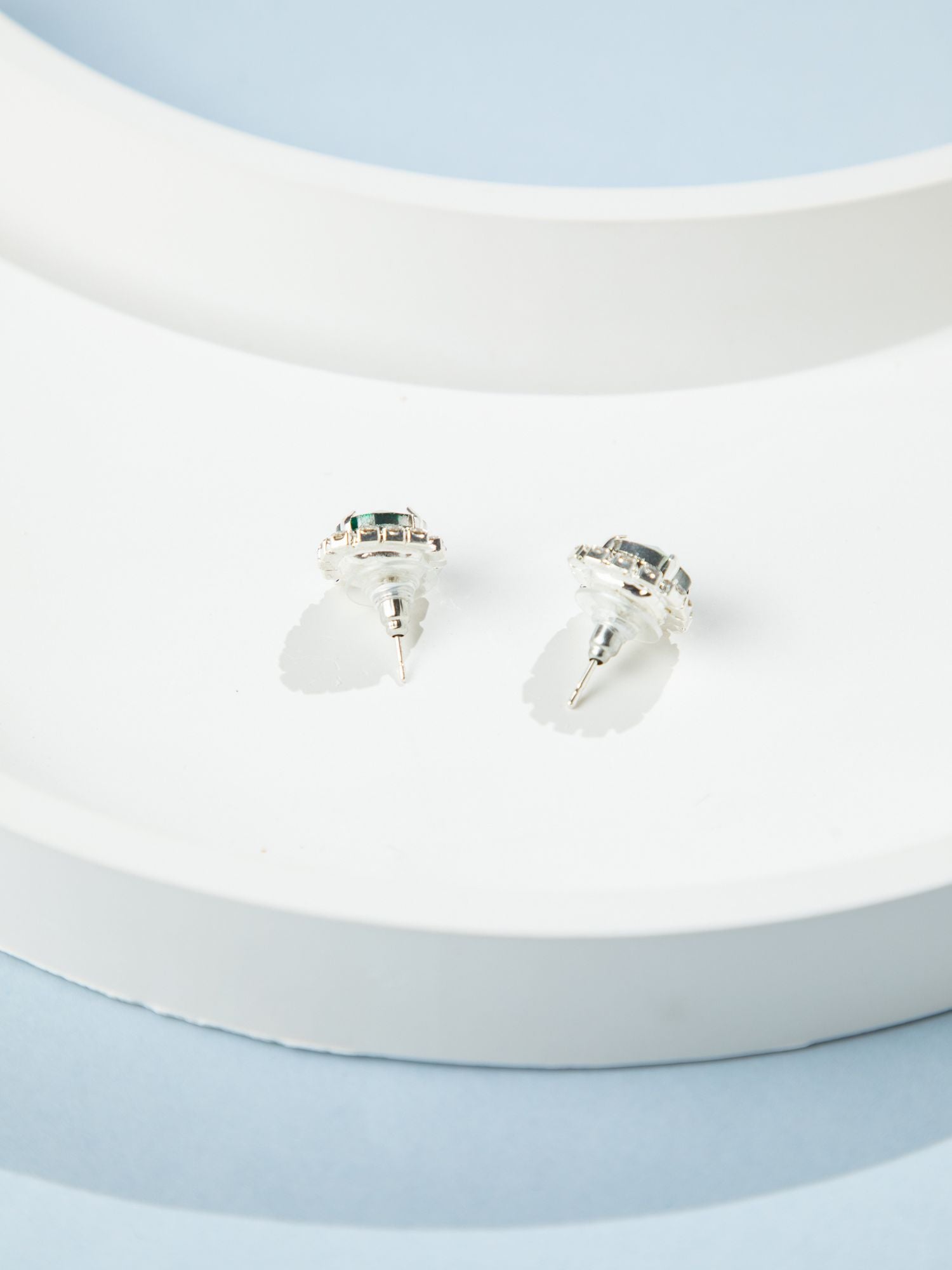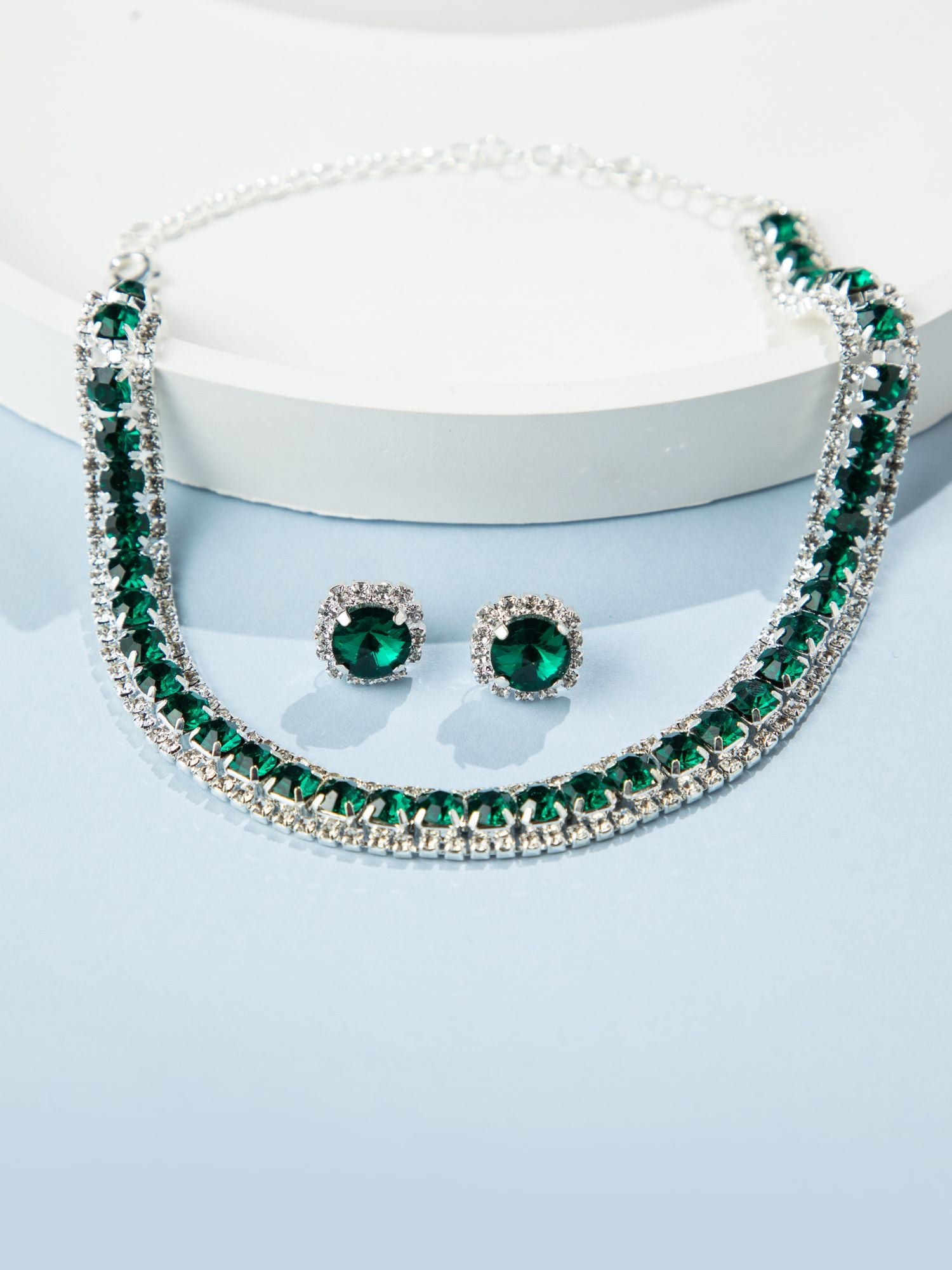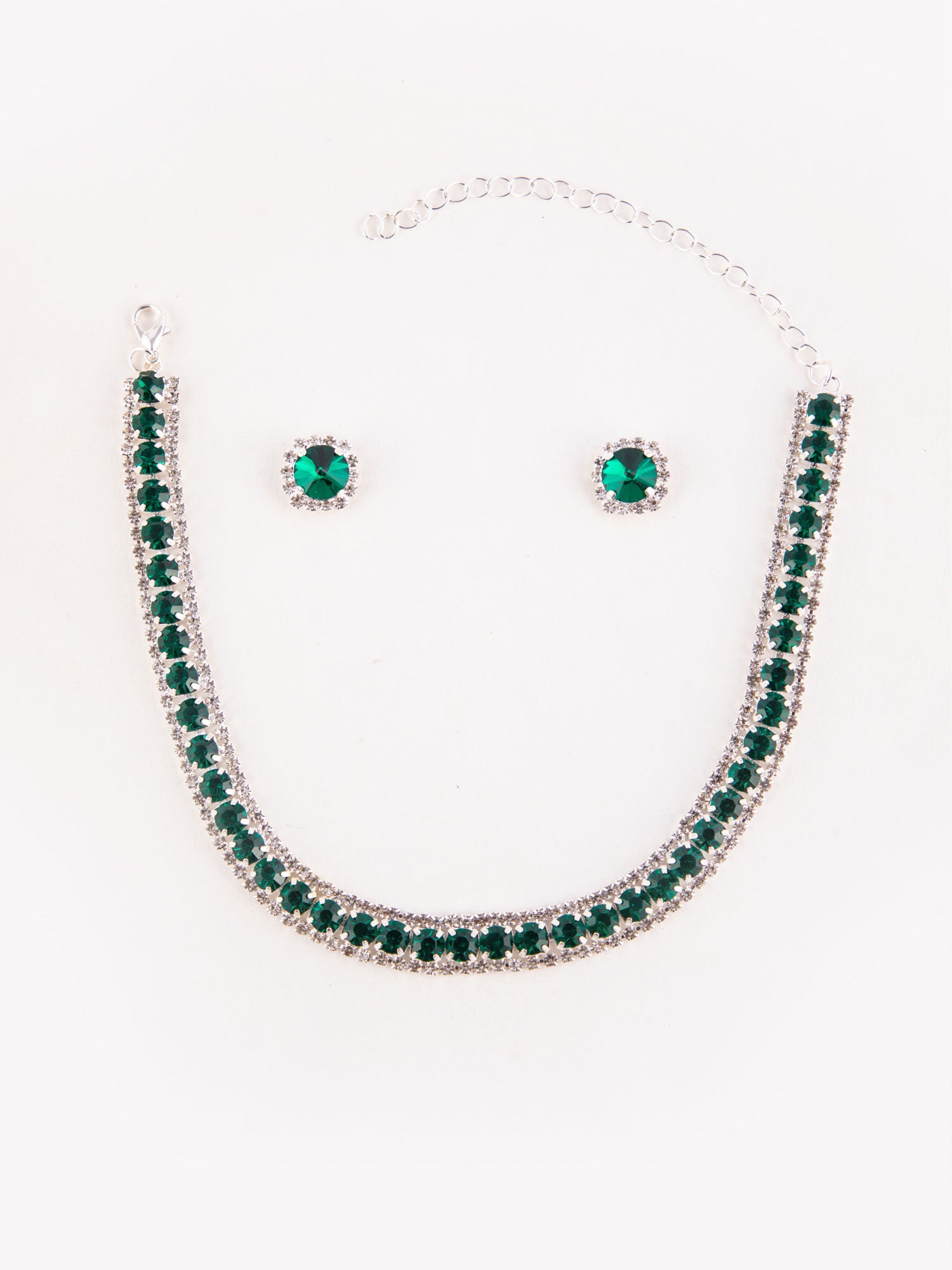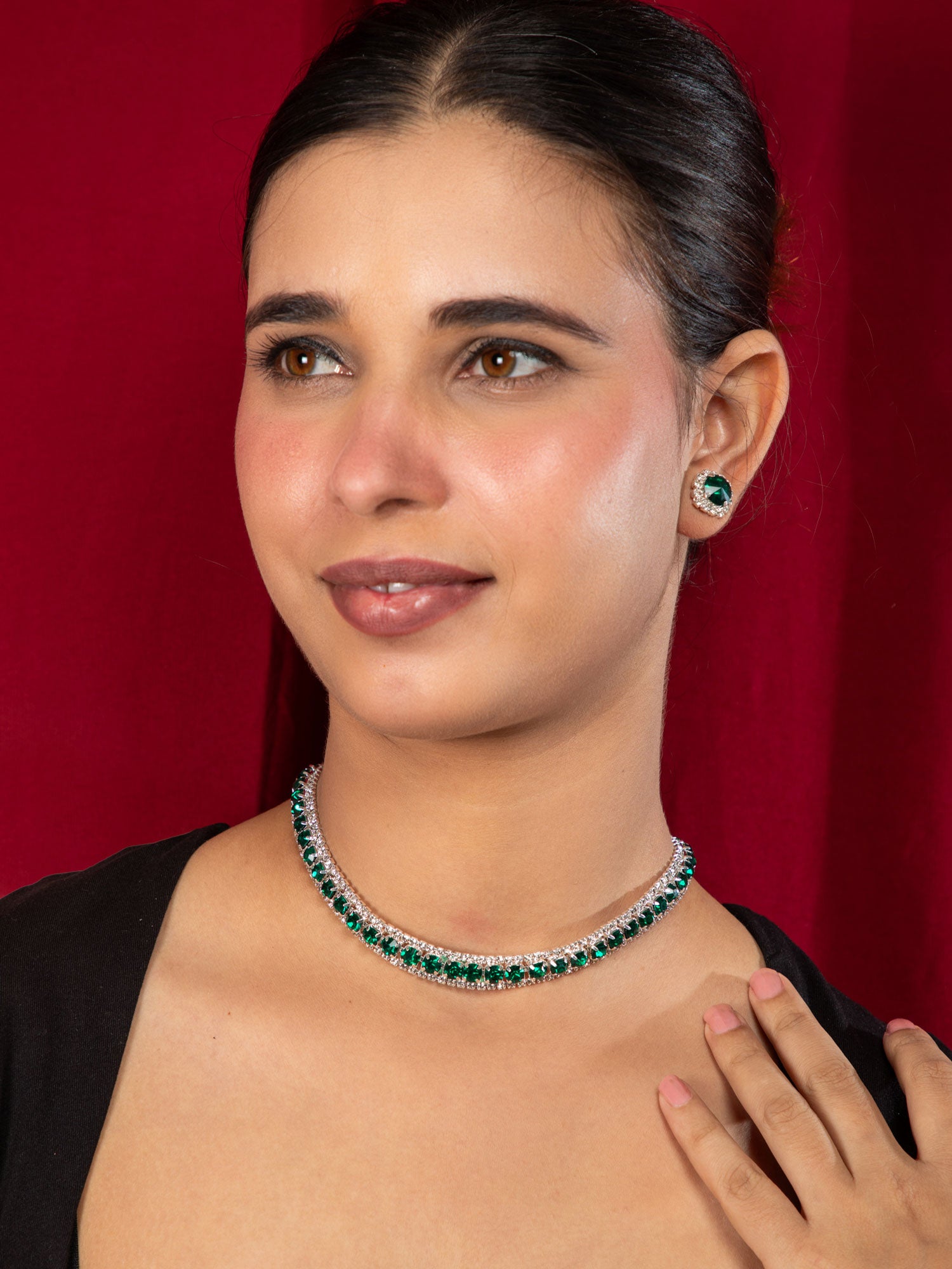 Silver Plated American Diamond Necklace and Earrings Set with White and Green Stones