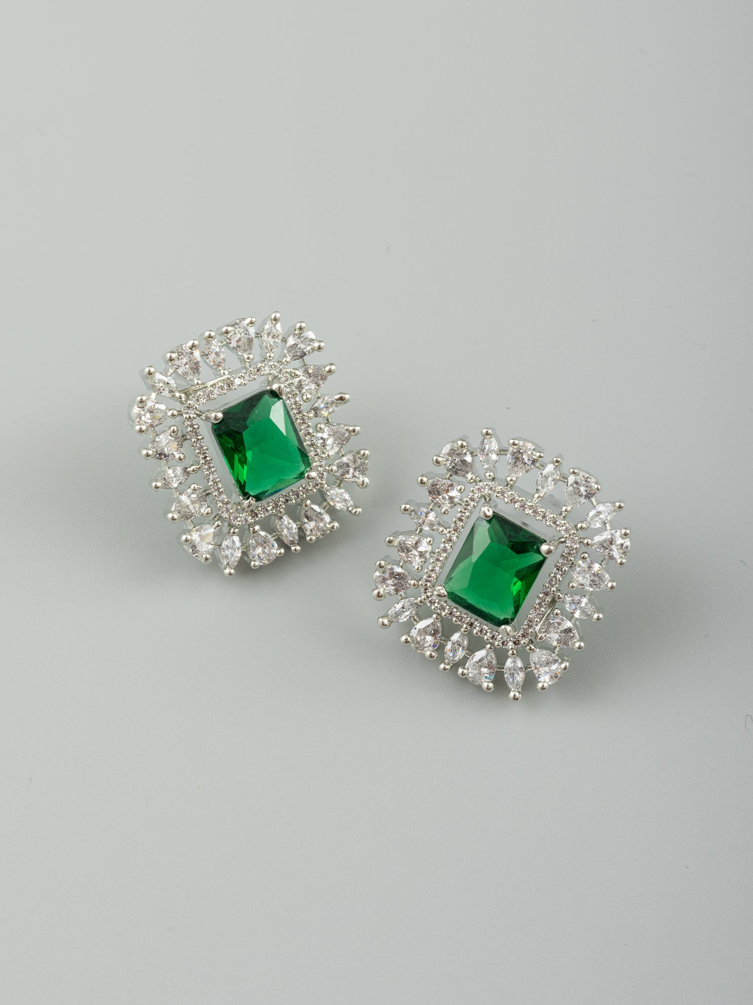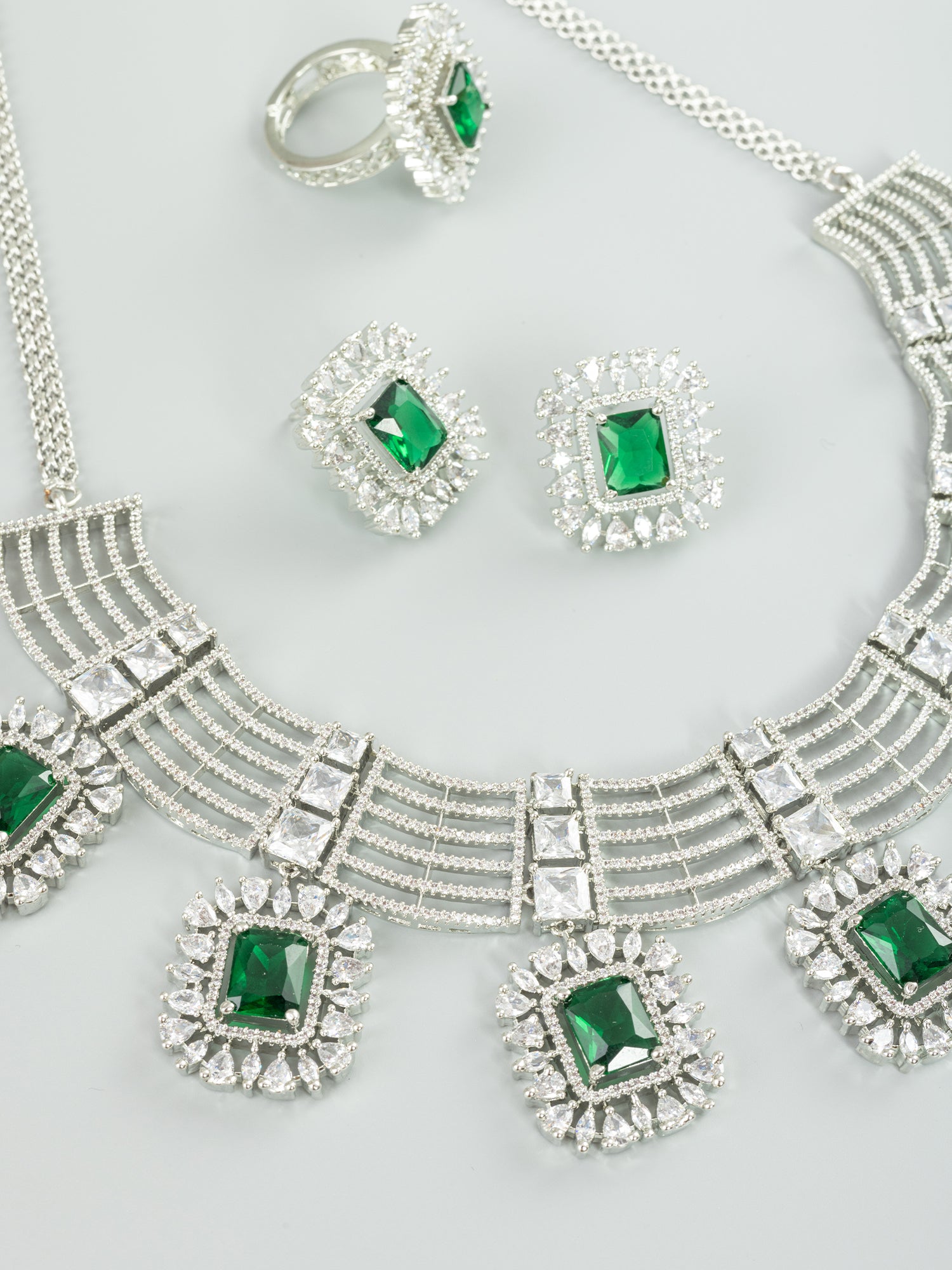 Discover the epitome of glamour with our Silver Plated American Diamond Necklace and Earrings—a captivating blend of the latest fashion trends and timeless allure. Meticulously crafted, this set boasts a silver polish with rhodium plating, enhancing the shining brilliance of AAA+ Grade Green Zircon Stones. Elevate your style effortlessly with this exquisite and fashionable jewelry ensemble, making a bold statement that seamlessly enhances your chic and glamorous look. Infuse sophistication into your ensemble by pairing the Silver Plated American Diamond Necklace and Earrings with a classic black dress. Opt for a sleek hairstyle to accentuate the jewelry's elegance, allowing the AAA+ Grade Green Zircon Stones to shine. Keep additional accessories minimal to let this glamorous ensemble take center stage, ensuring you radiate confidence and make a lasting impression at any upscale event or special occasion.