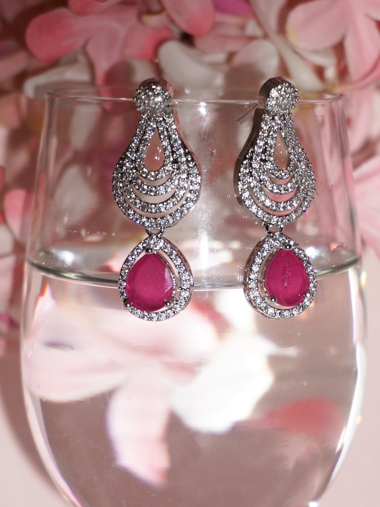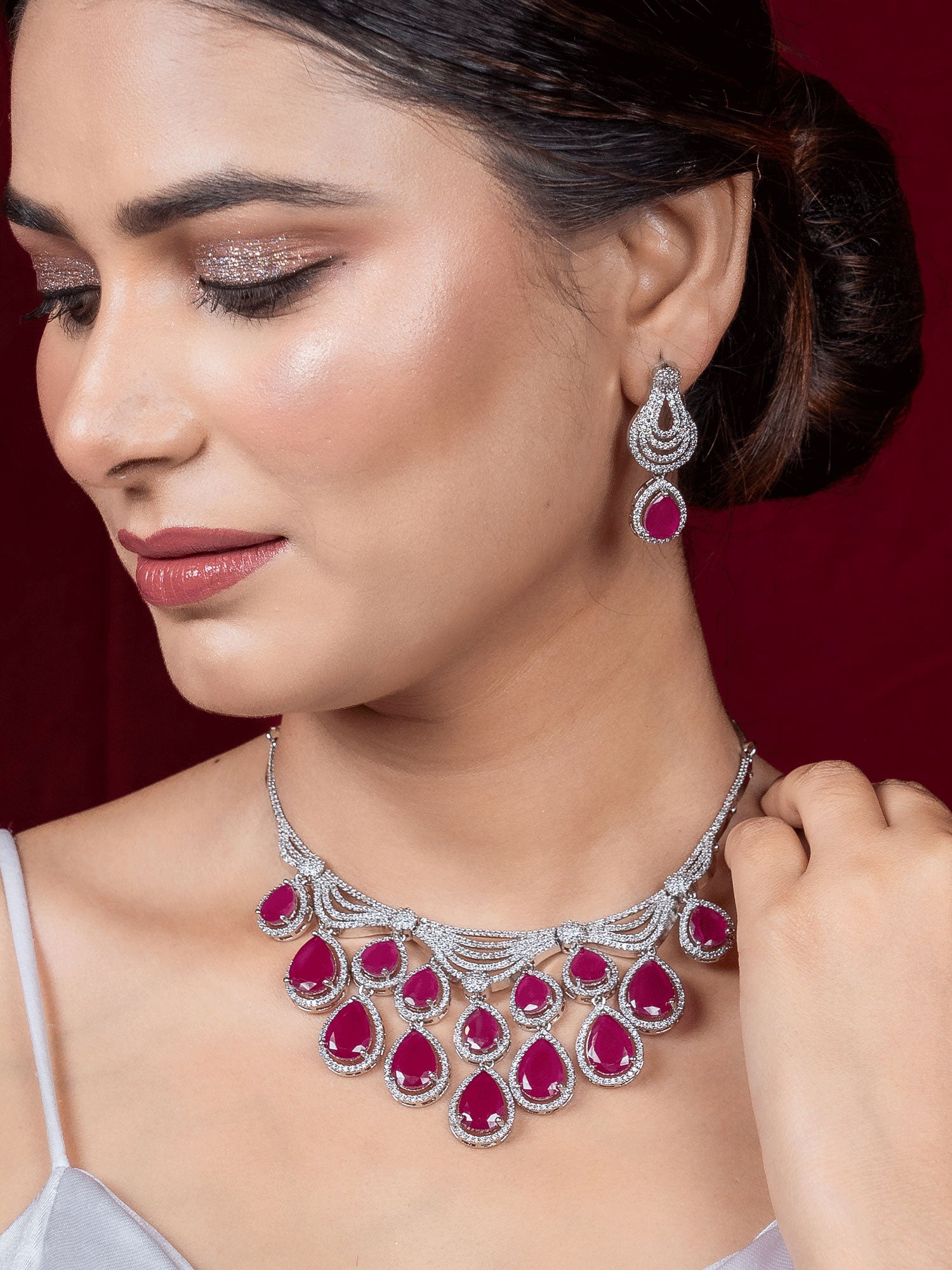 Step into elegance with this ruby red and American diamond jewelry set, a perfect blend of tradition and modern glamour. Featuring radiant ruby-red gemstones accented with brilliant American diamonds, this set exudes sophistication and charm. The sparkling stones create a mesmerizing contrast, making it an ideal choice for weddings, festive occasions, and grand celebrations.