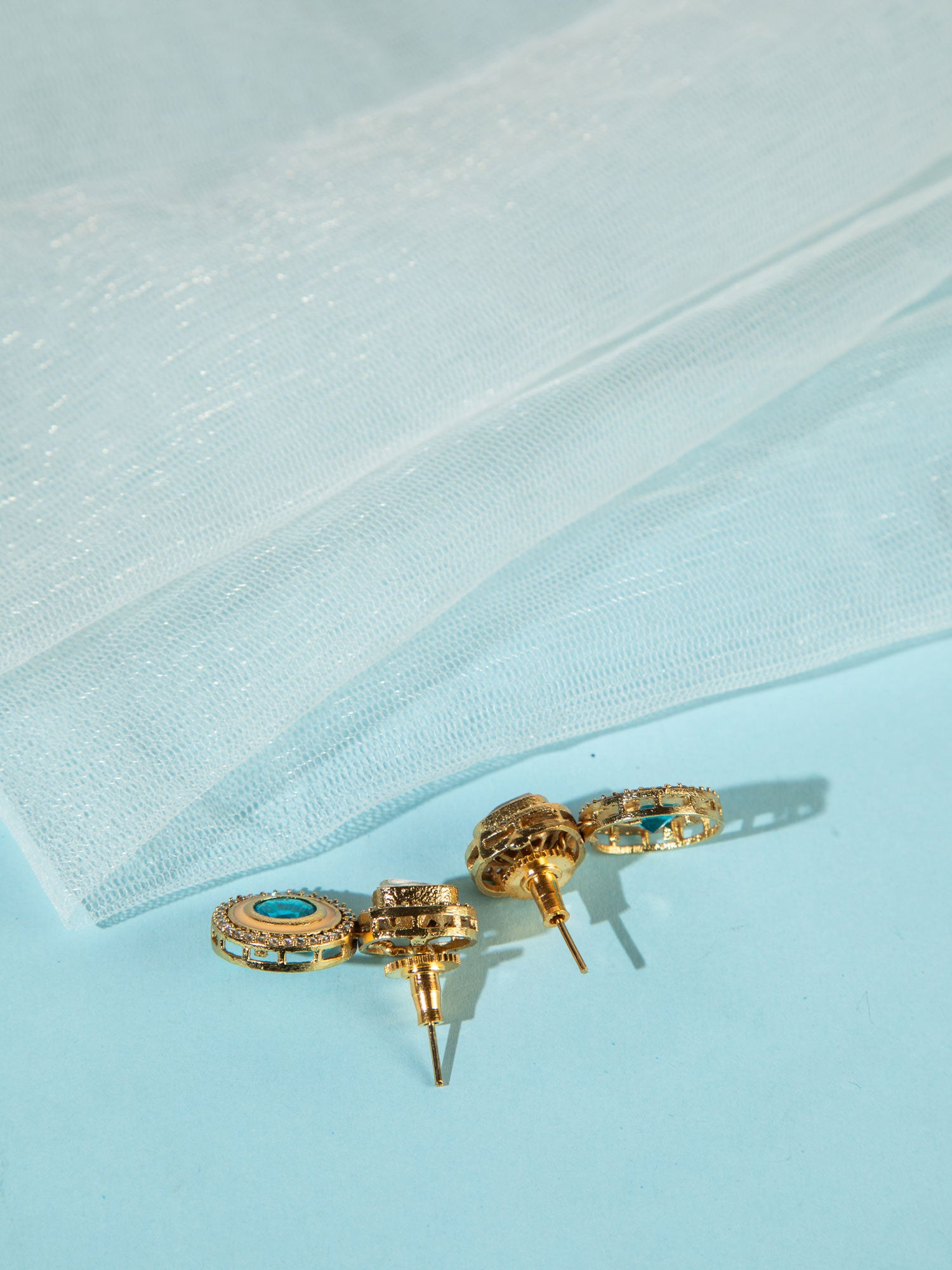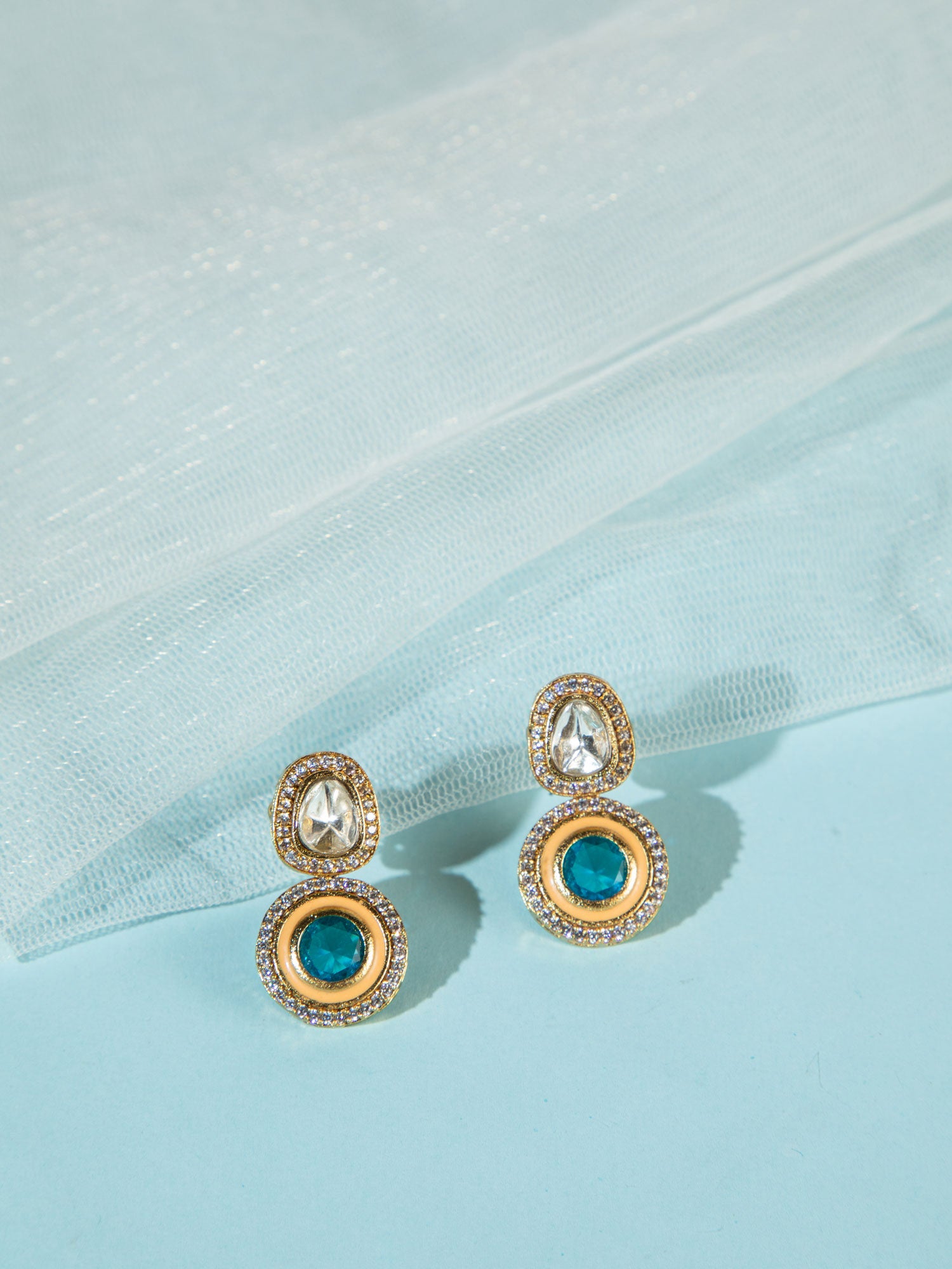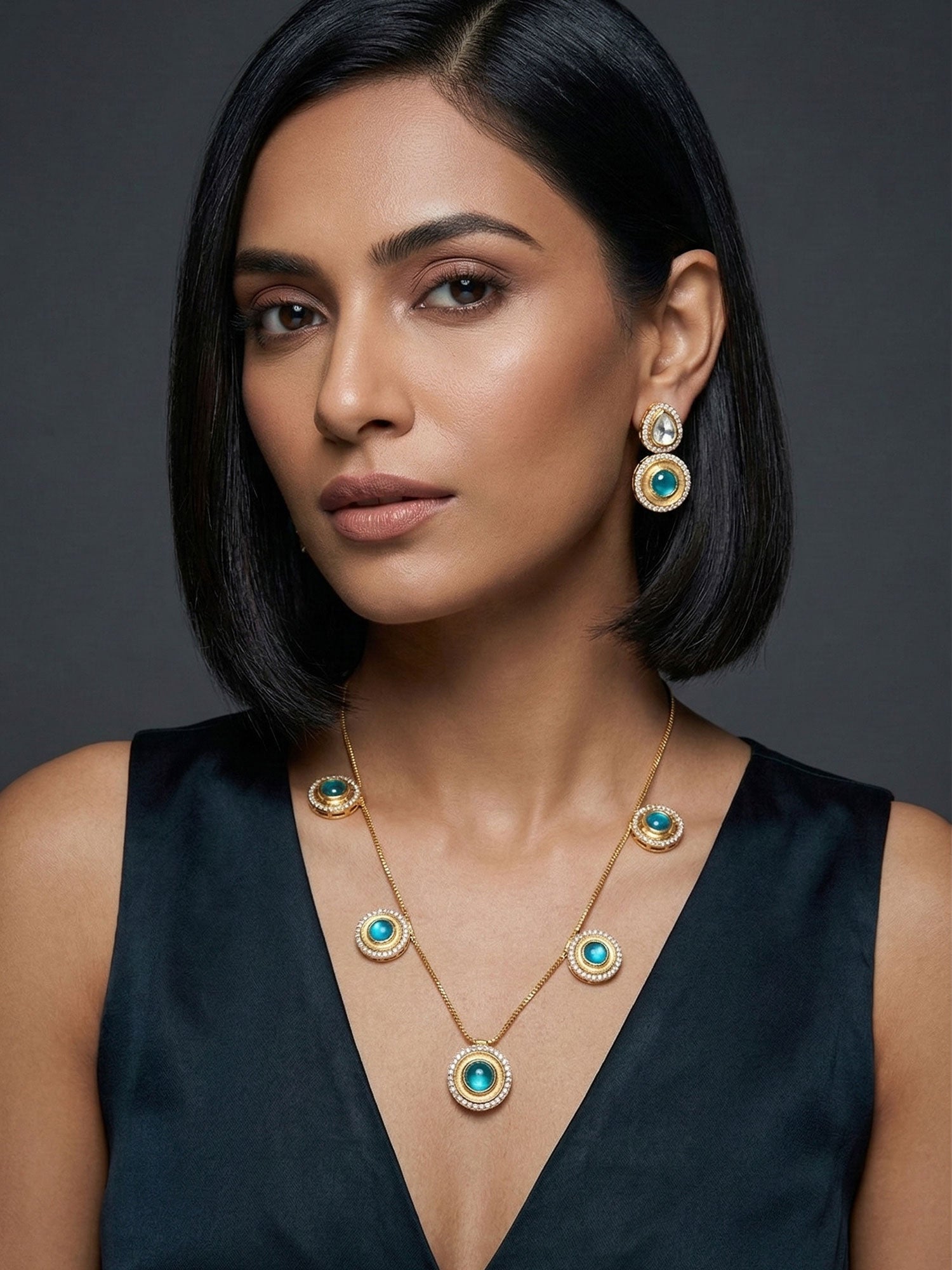 Enhance your look with this graceful gold-plated necklace set, adorned with sparkling CZ (Cubic Zirconia) stones in soothing sky blue and classic white tones. The refined color combination offers a fresh and sophisticated appeal, while the gold plating adds a touch of warmth and luxury. Perfect for festive occasions, parties, or elegant gatherings, this set beautifully balances modern sparkle with timeless charm.
