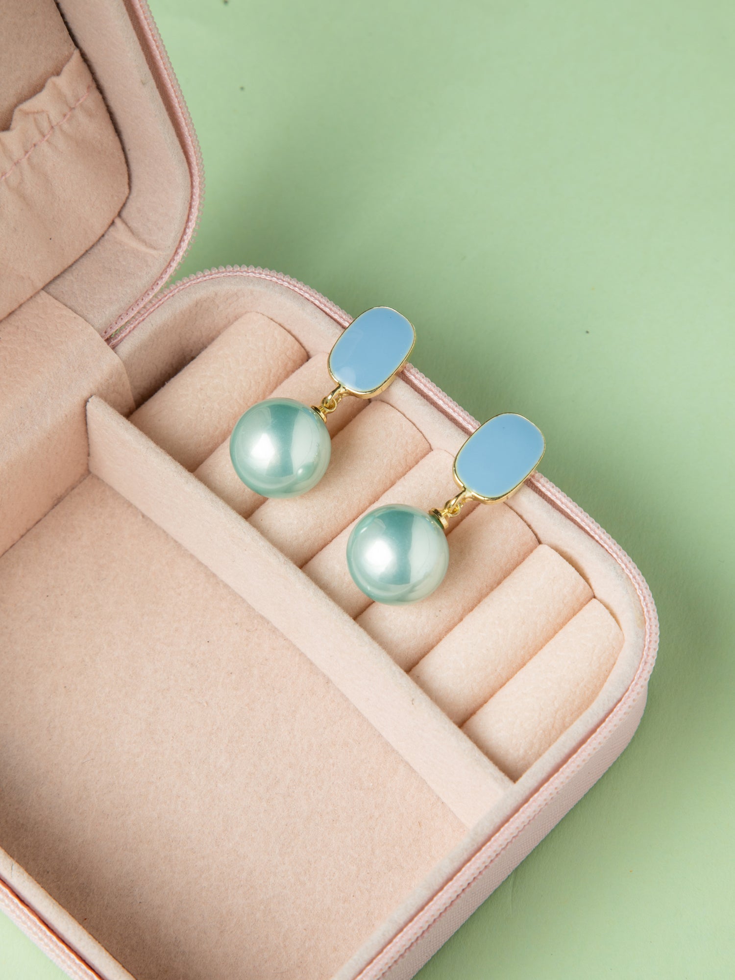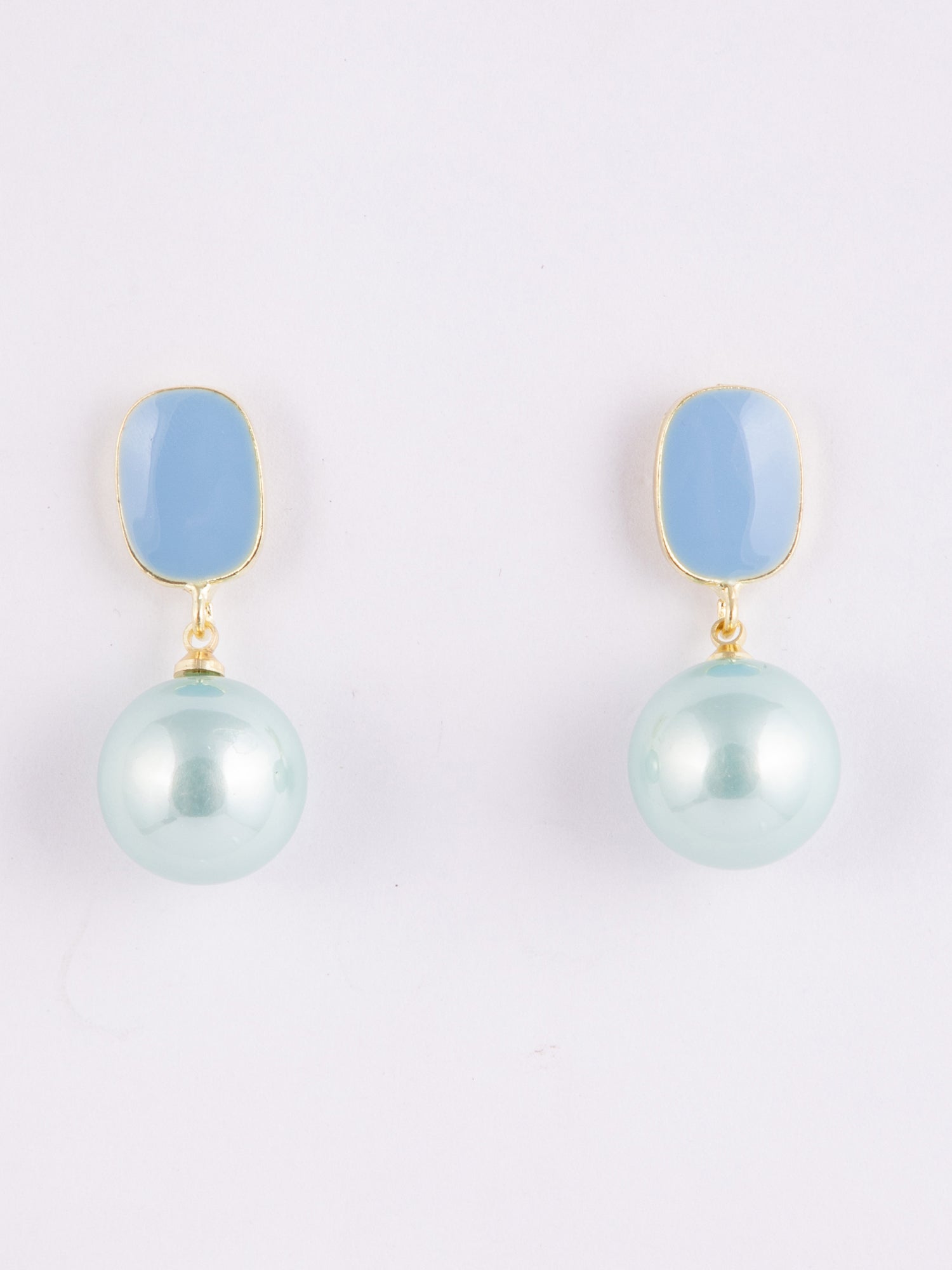 Glow with elegance in these gold-plated earrings featuring a beautiful sun design, a big blue faux pearl drop, and a sparkling blue stone at the top. Perfect for festivals and parties.