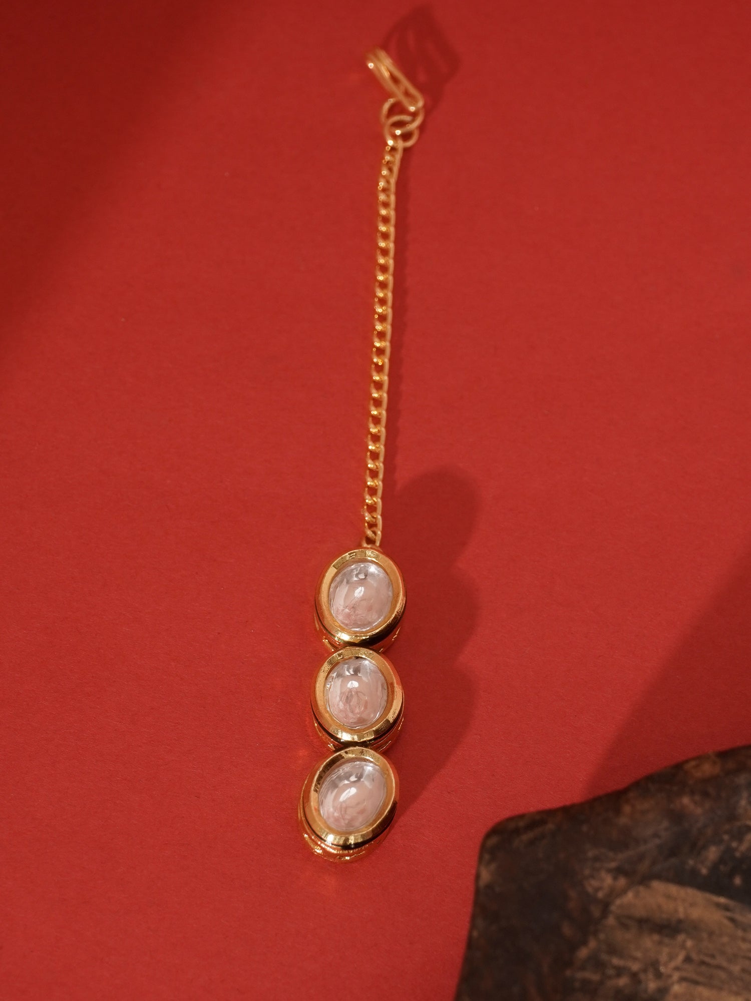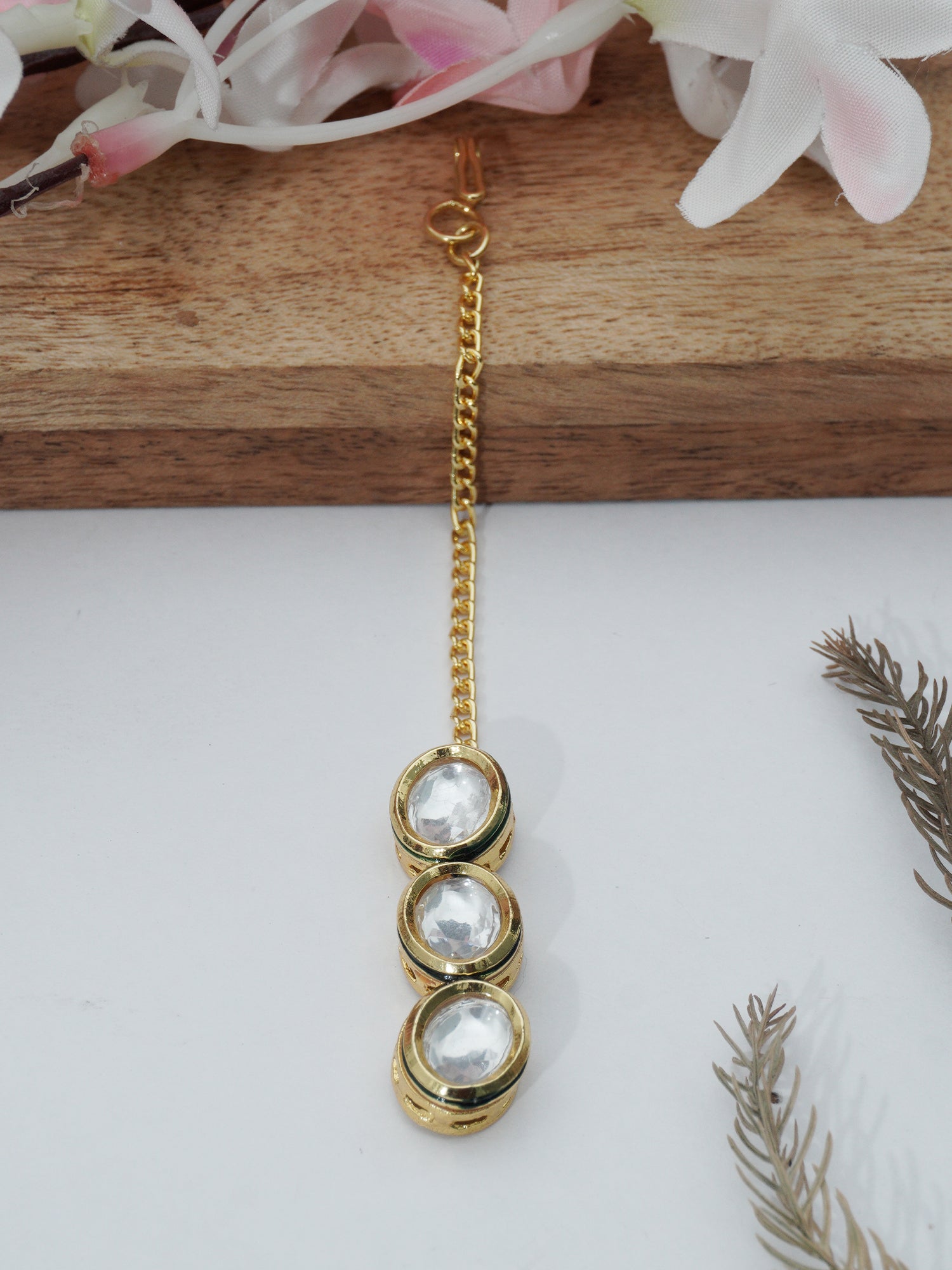 Enhance your ethnic charm with this exquisite gold-plated Kundan maangtikka, a perfect blend of tradition and elegance. Featuring intricate Kundan detailing, this maangtikka is designed to add a regal touch to your festive or bridal look.