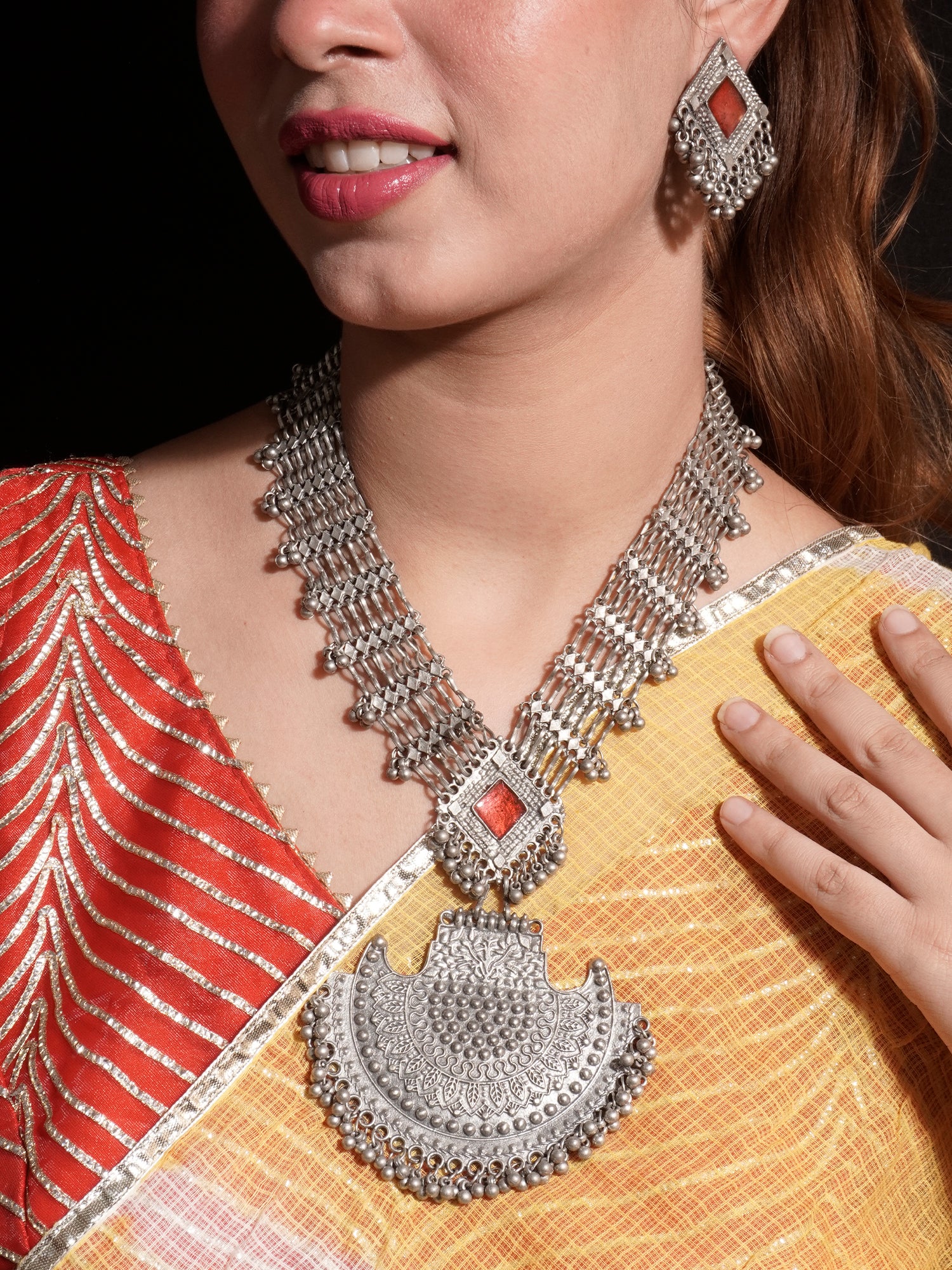 Pair this long oxidized haar set with a rich, traditional saree or lehenga in deep hues like maroon, gold, or dark green. Style your hair in a traditional braid or a low bun adorned with fresh flowers to enhance the classic appeal. Finish with minimal makeup that highlights your eyes and a soft red lip to complement the red accents in the jewelry.