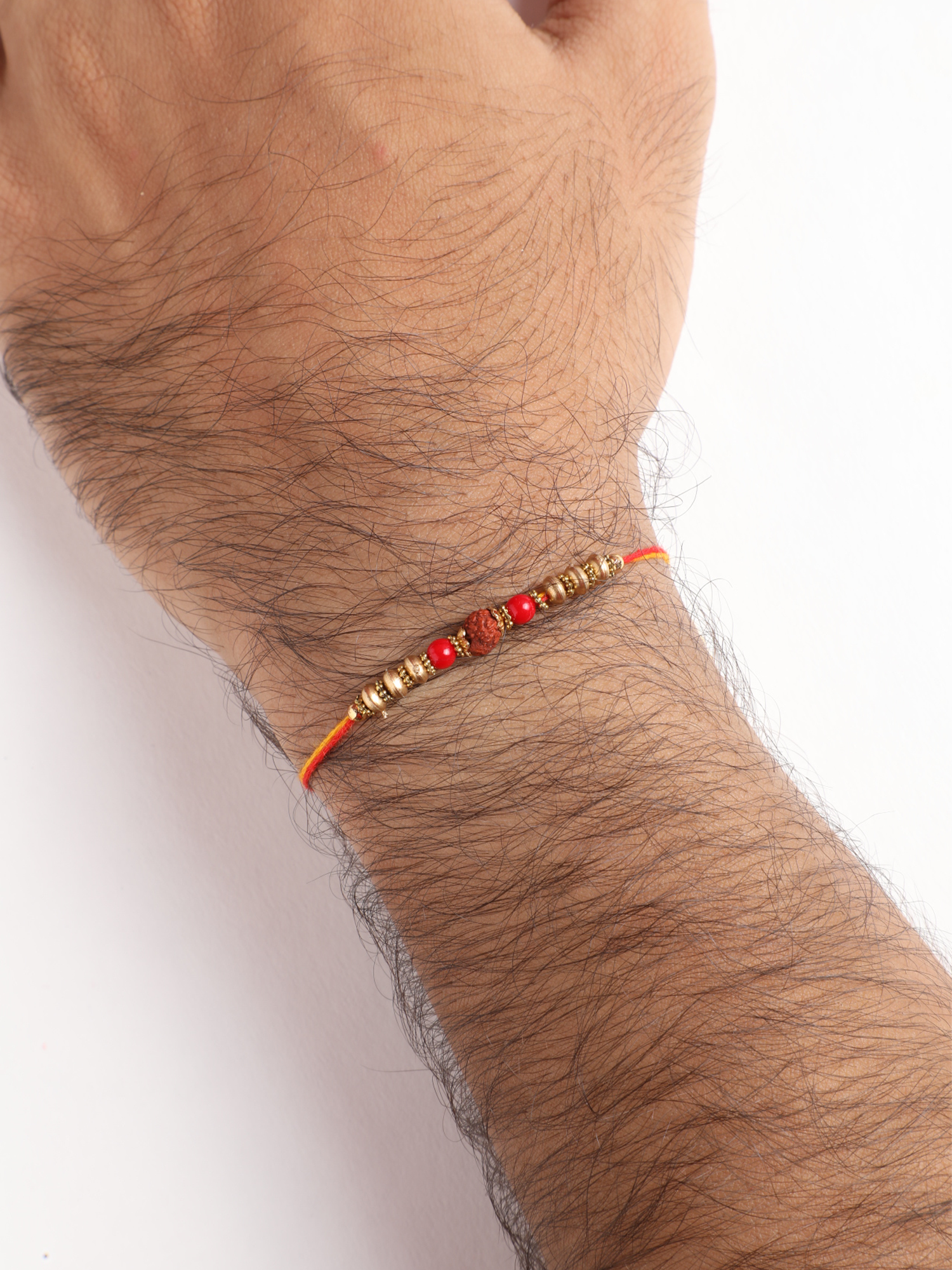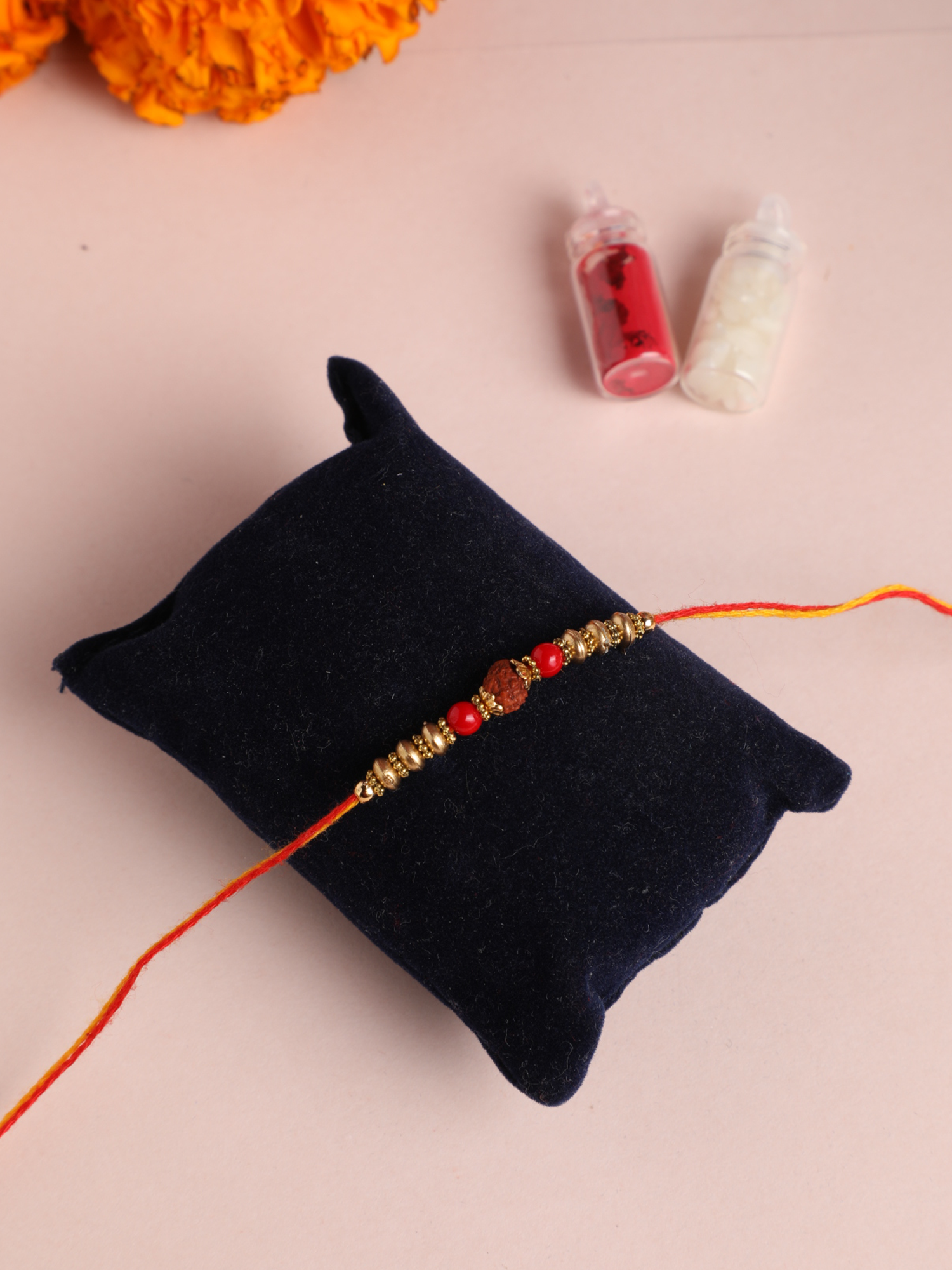 Rakshabandhan is a beautiful festival which is celebrated all over India with lots of joy and happiness. This is the time for a get together celebration with your siblings and close once. Let’s celebrate this unbreakable bond with Niscka Rakhi. This is a very beautifully designed rudraksha and golden balls studded thread rakhi. Your siblings will surely love the design and quality. Includes- Designer Rakhi, Roli and rice.
