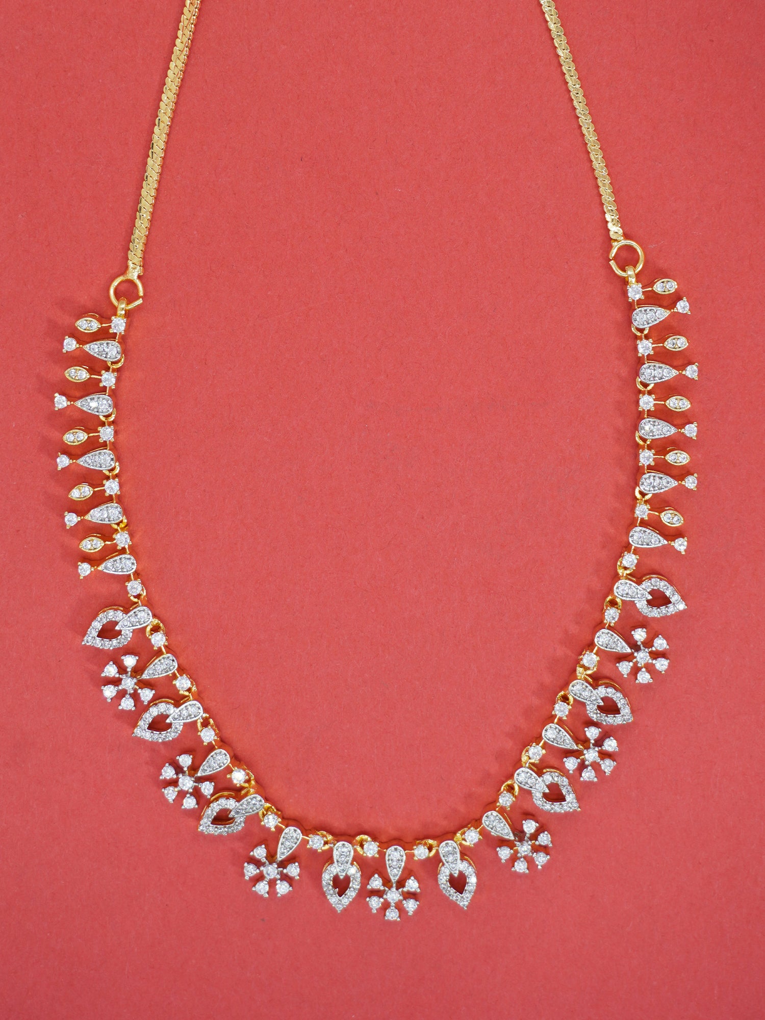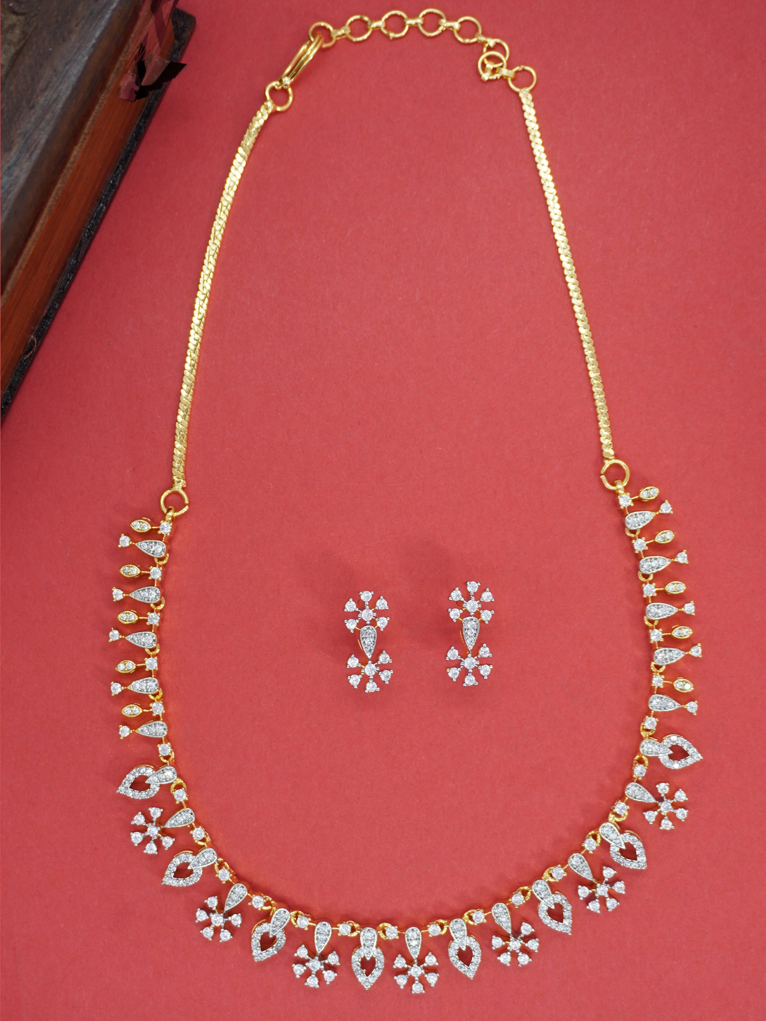 Enhance your elegance with this stunning traditional jewellery set, featuring radiant American diamonds and shimmering zircon stones. The intricate craftsmanship is highlighted by a sleek rhodium-plated finish, ensuring timeless brilliance and durability.