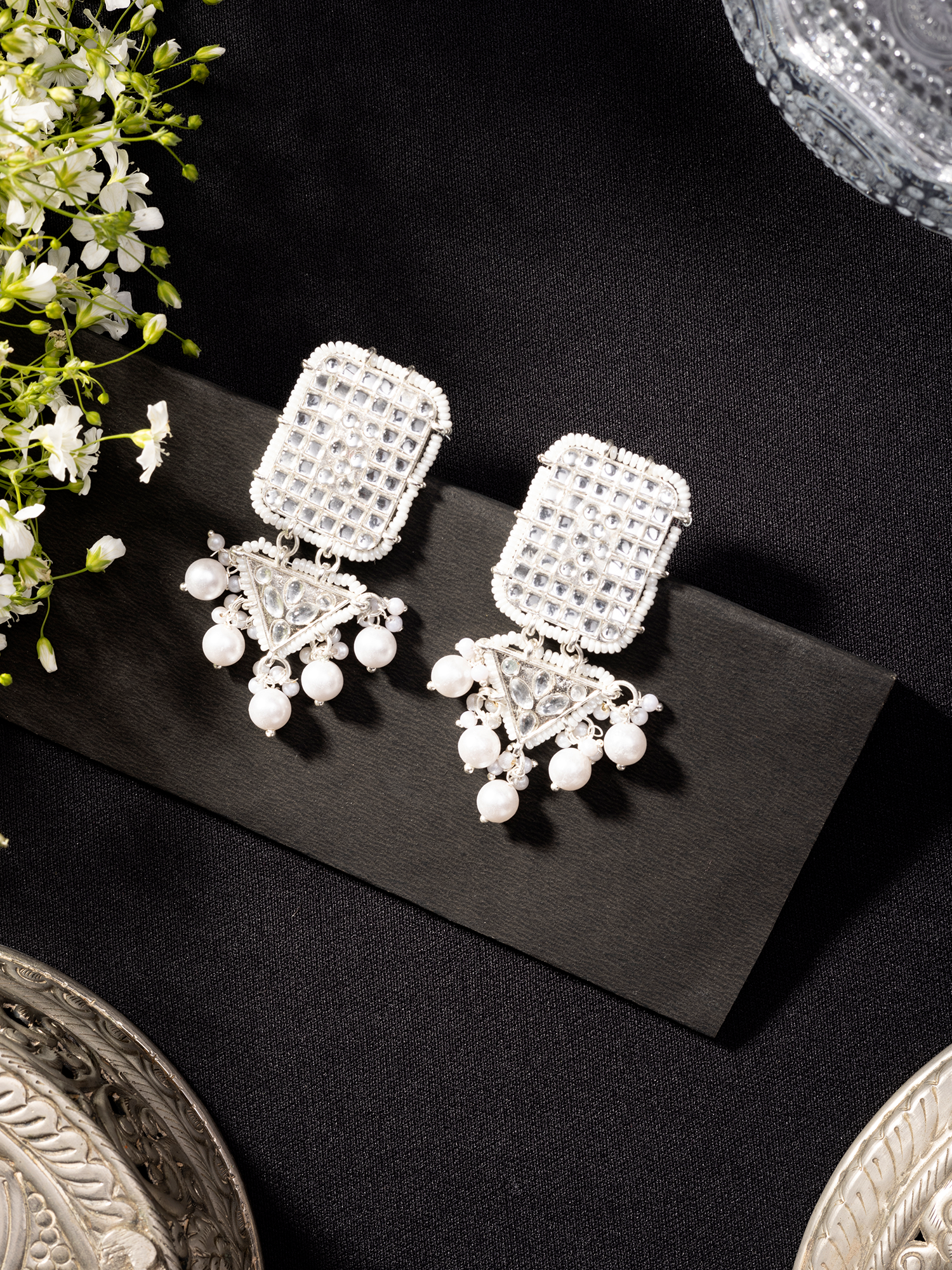 Pair these Traditional White Pearl and Kundan Earrings with a vibrant Anarkali suit for a regal look. Sweep your hair into an elegant updo to showcase the intricate design, and add a matching kundan tikka for extra flair.