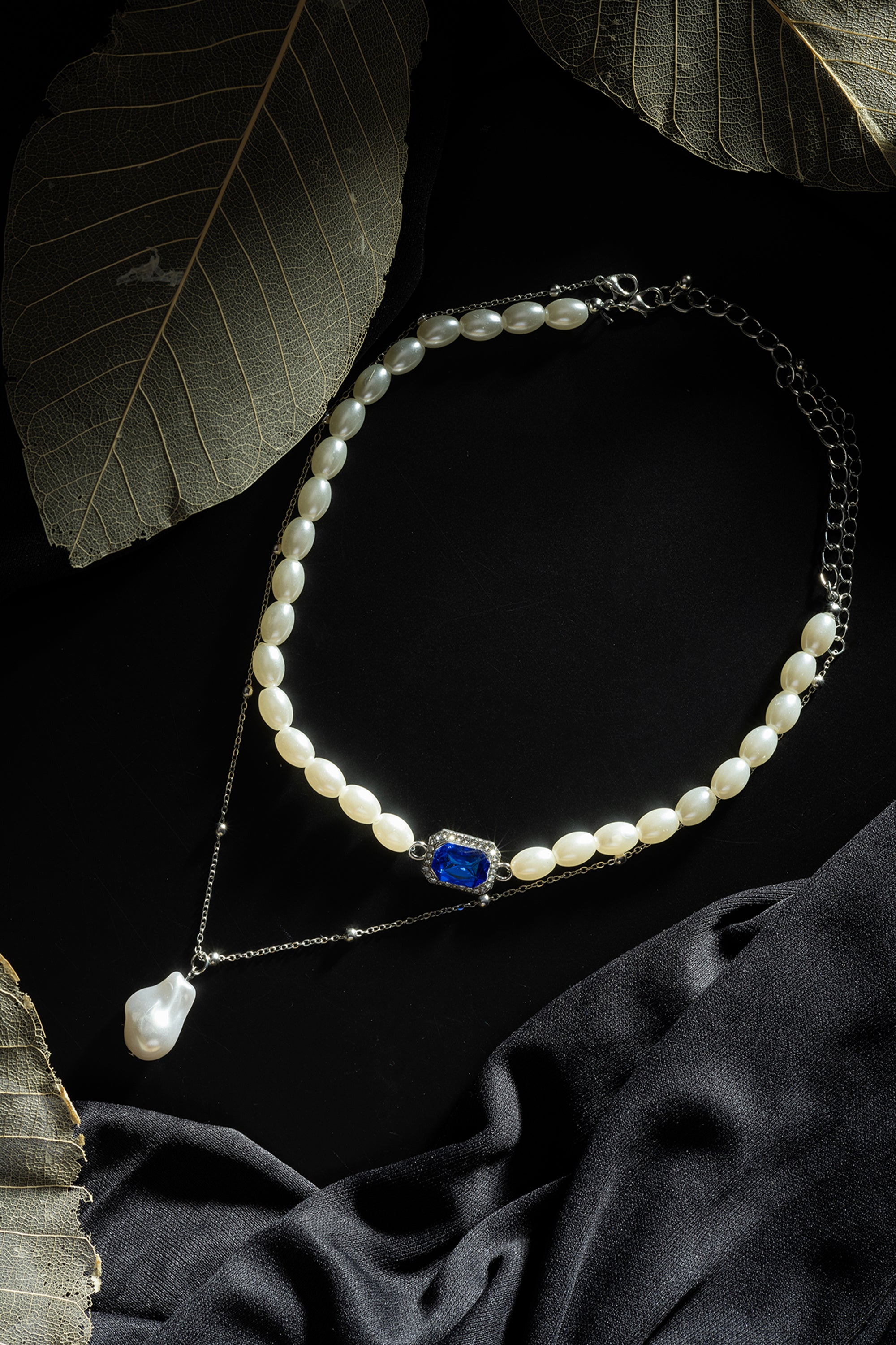 Luxurious in every detail, our White Pearl with Royal Blue Crystal Necklace embodies classic elegance with a modern twist. Adorned with attractive White Oval oval-shaped pearls and AAA+ Grade Royal Blue Zircon Stones, each piece boasts a captivating appeal complemented by a lustrous gold polish. The lightweight and stylish design makes this necklace perfect for luxurious party wear, showcasing the latest fashion trends while ensuring an elegant presence. Elevate your style effortlessly with this high-quality and opulent necklace, where the timeless beauty of pearls meets the contemporary charm of royal blue crystals. Make a statement by pairing our luxurious White Pearl with the Royal Blue Crystal Necklace with a deep V-neck or off-shoulder ensemble. Let the captivating AAA+ Grade Royal Blue Zircon Stones and White Oval Shaped Pearls take center stage against your party wear. The lustrous gold polish adds a touch of sophistication, creating a harmonious balance between classic elegance and modern allure.