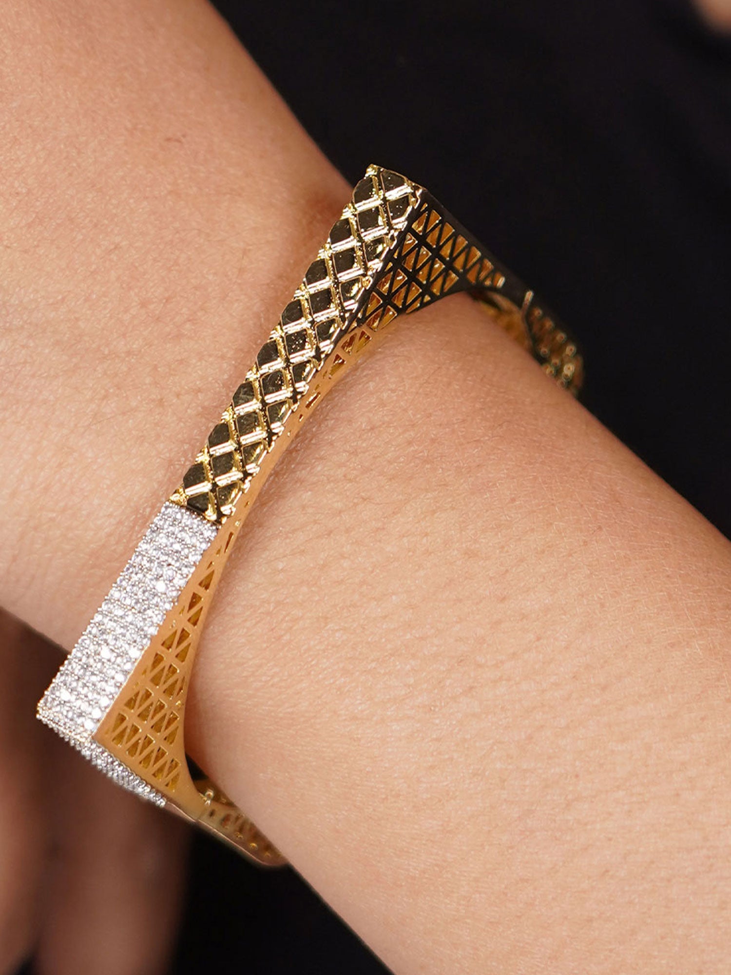 Pair this 18K gold-plated cubic fashion bangle with a chic evening dress or an elegant saree for a sophisticated look. Wear it solo for a sleek, minimalistic statement or stack it with other gold bangles for a layered effect. Complement the look with delicate gold earrings or a statement ring for a polished and refined ensemble.