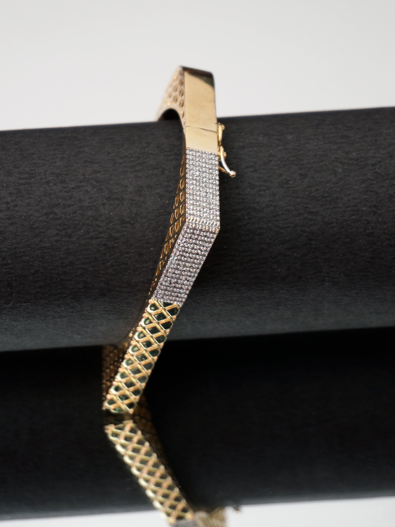 Add a touch of sophistication to your look with this 18K gold-plated cubic fashion bangle, designed for modern elegance. The sleek and stylish design makes it a versatile accessory, perfect for both casual and formal occasions. Its cubic-inspired pattern adds a contemporary edge, while the radiant gold-plated finish enhances its timeless appeal. Whether worn solo for a minimalist statement or stacked with other bangles for a bold look, this piece is a must-have in your jewelry collection.