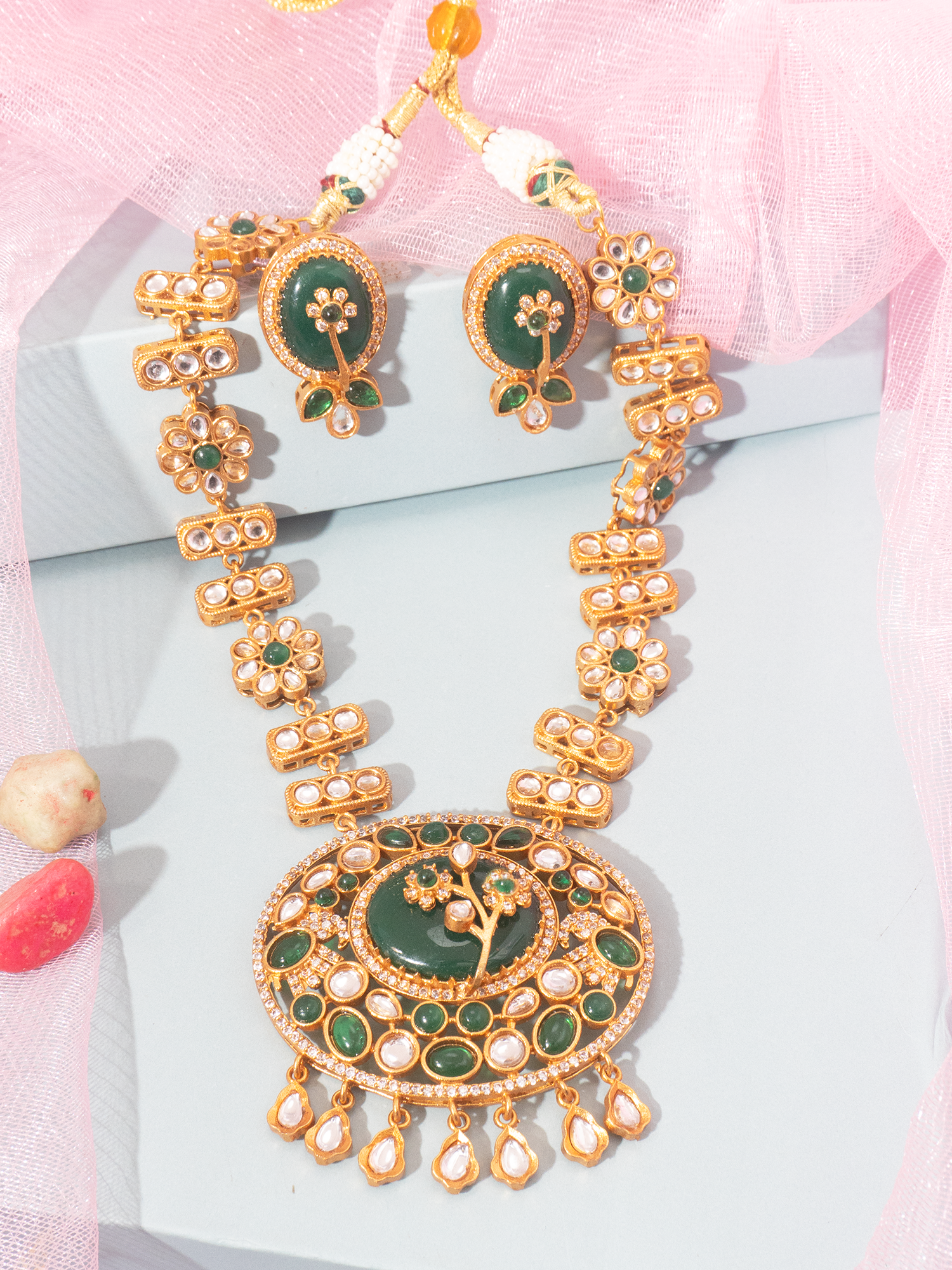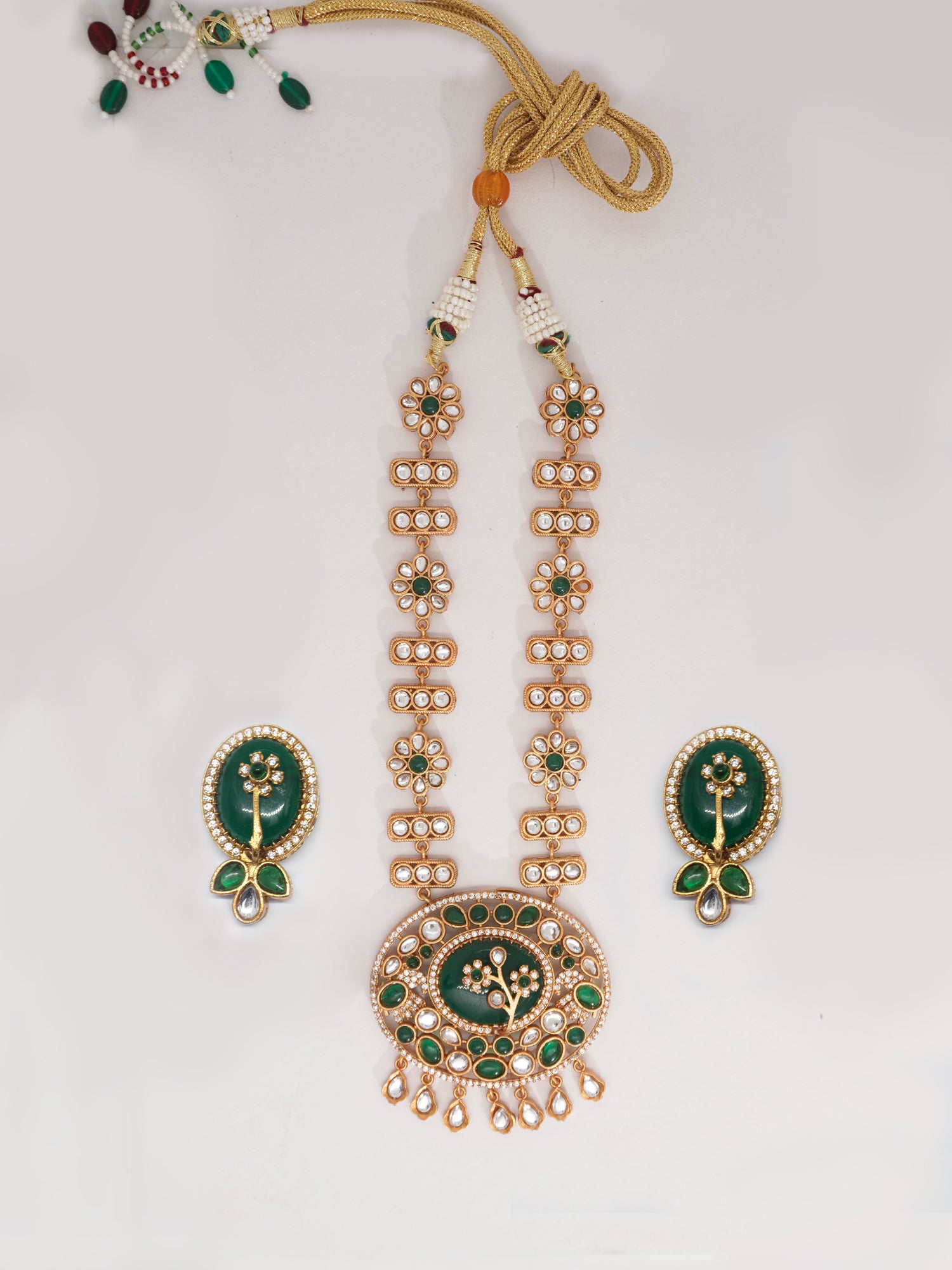 Add a touch of sophistication with Niscka's Green Kundan Flower Design Long Necklace Set. This elegant long necklace is adorned with kundan stones, intricately arranged in a beautiful flower motif. The combination of the green hue and detailed floral design creates a refined and graceful look. Perfect for special occasions or elevating your traditional wear, this necklace set seamlessly blends classic charm with modern elegance, making it a standout piece in any jewelry collection.