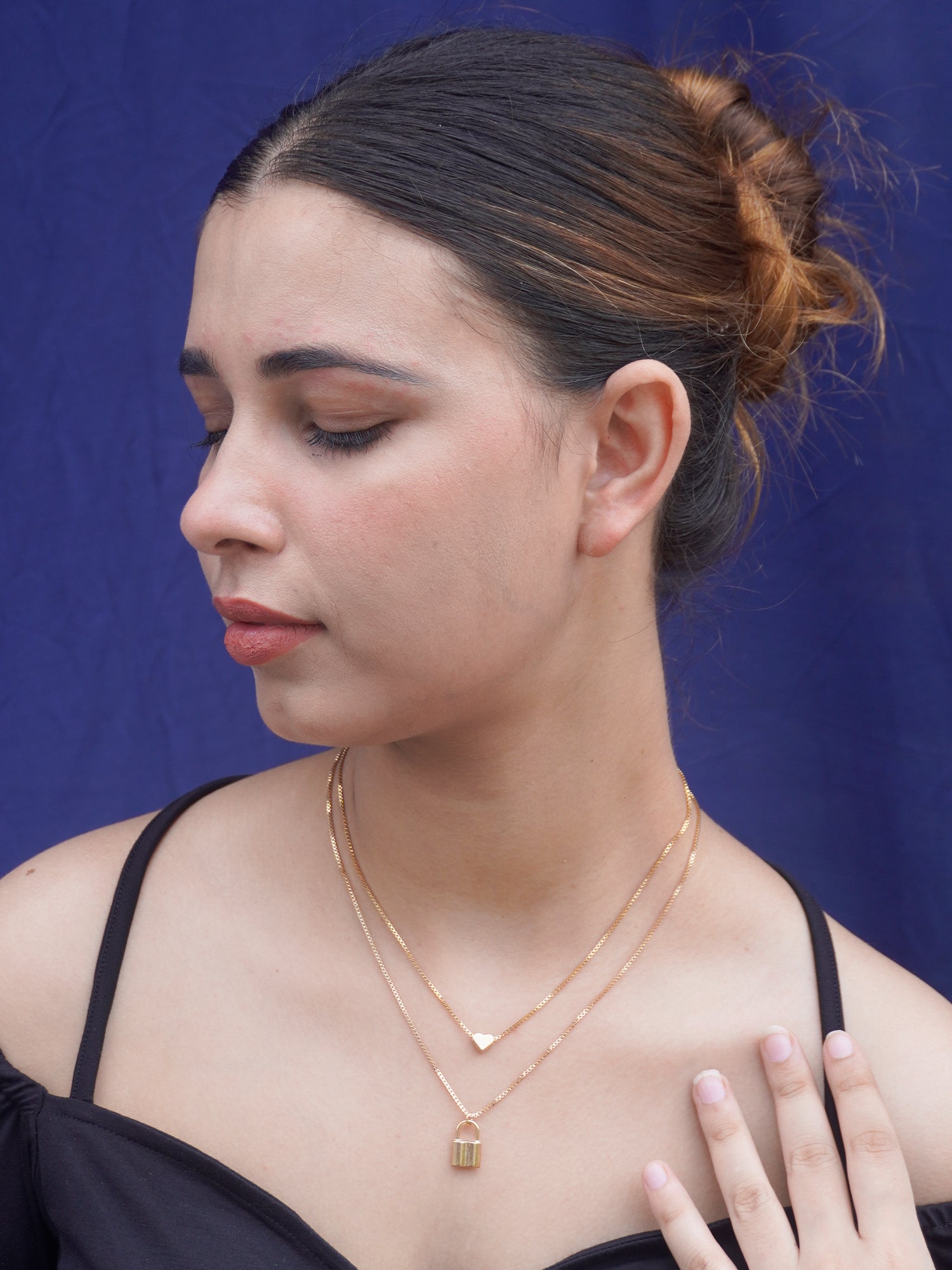 Showcase the Heart and Lock Double Layer Chain Pendant by pairing it with a sleek, high-neck or V-neck top to highlight the pendant's unique design. For a polished look, opt for a simple, straight hairstyle or a classic updo that keeps the focus on the necklace.