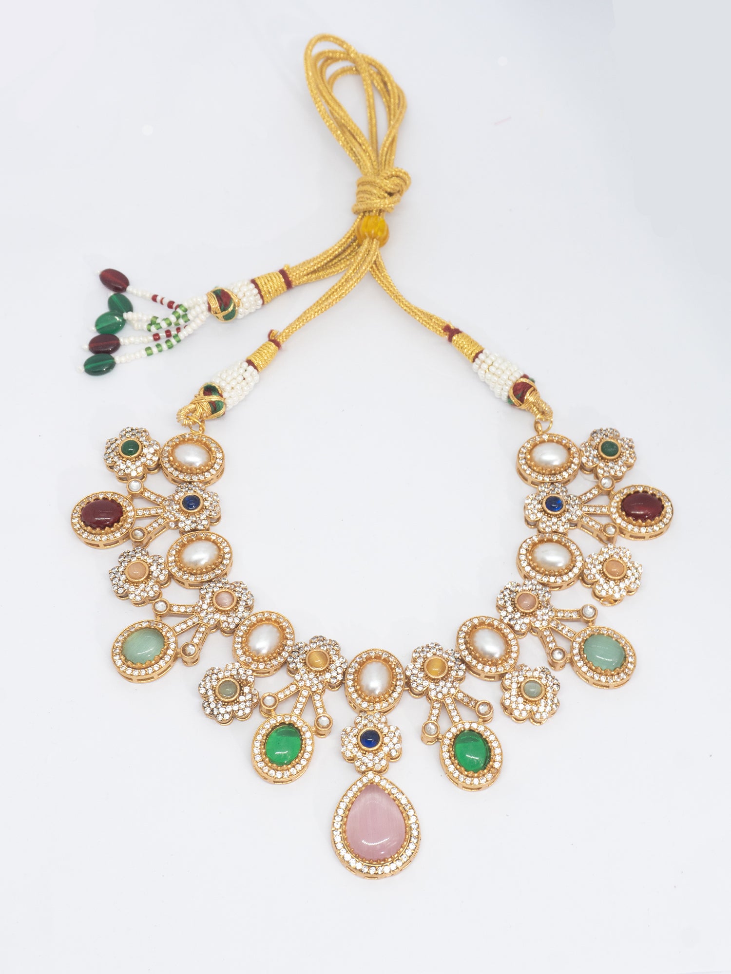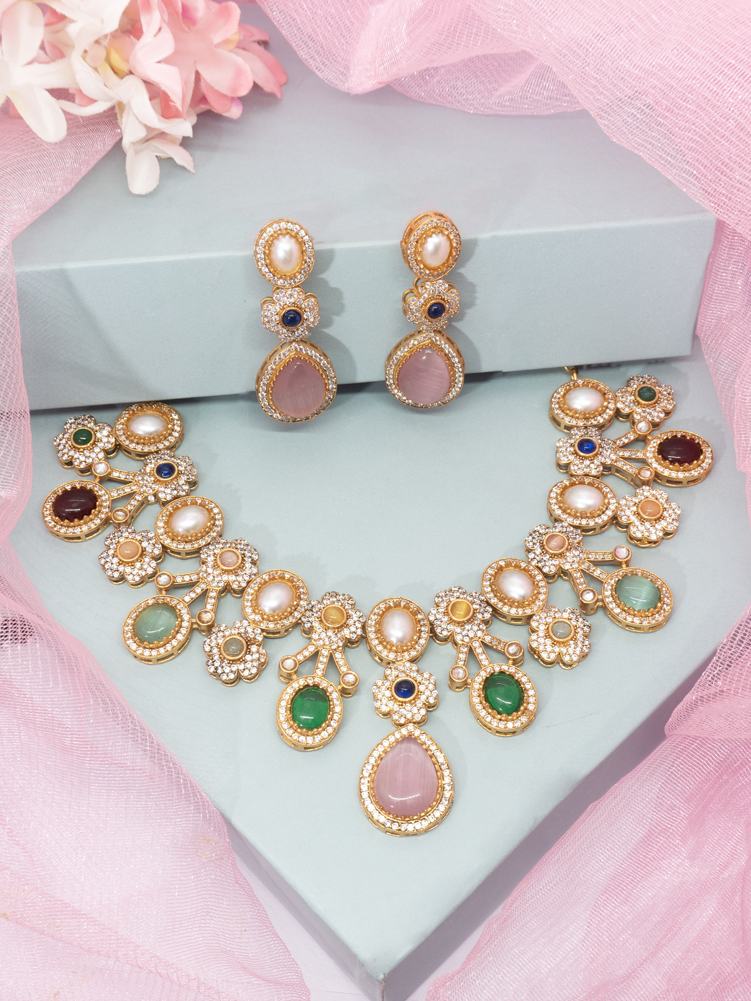 Elevate your look with the Multicolor Pearl & Zircon Floral Necklace Set - Gold & Rhodium Plated with American Diamonds by pairing it with a deep neckline or off-shoulder outfit to let the intricate floral design and vibrant colors shine. Complement the set with a soft, flowing hairstyle to create an elegant balance that highlights the sparkling American diamonds, pearls, and the contrasting gold and rhodium plating.