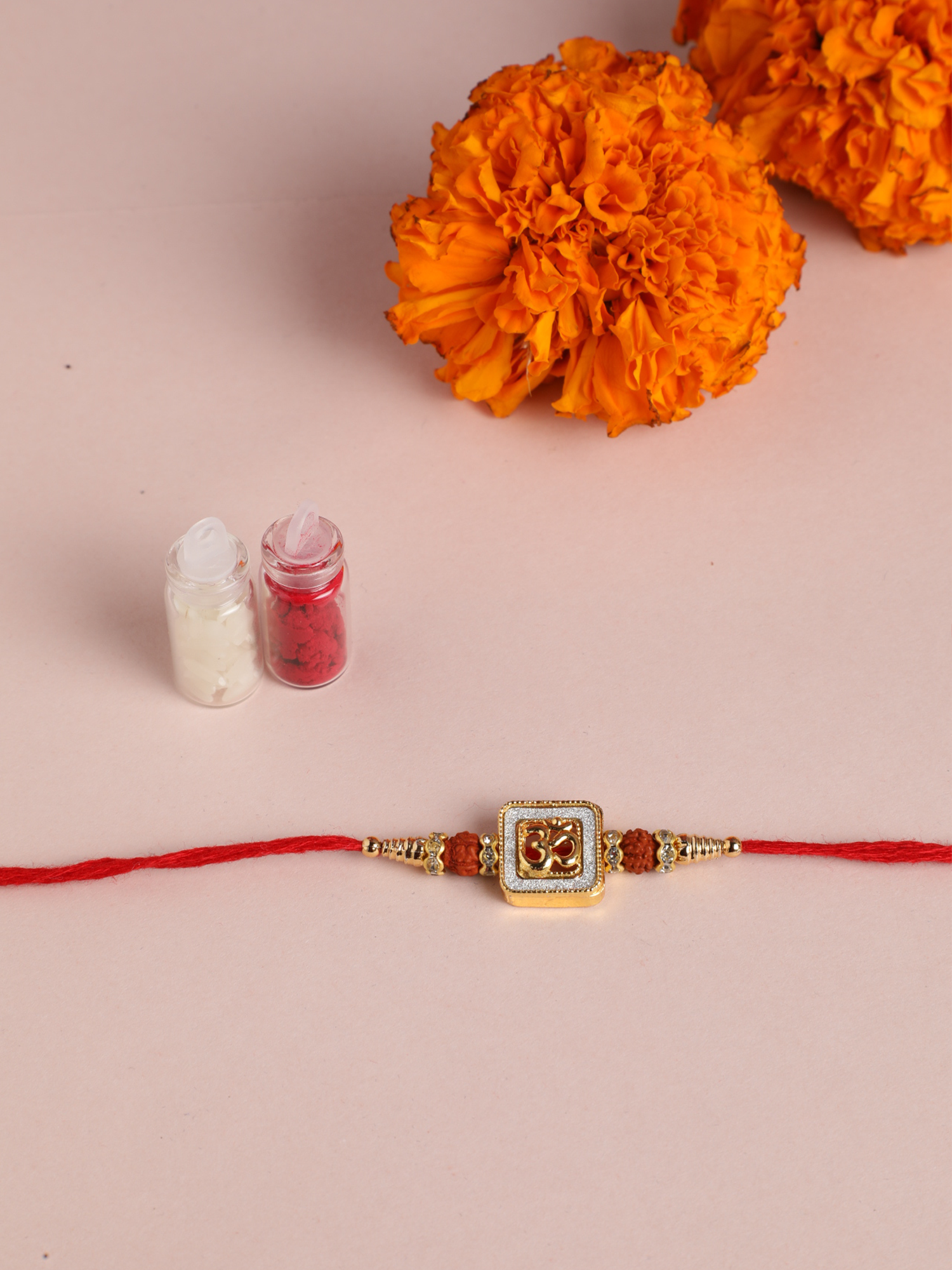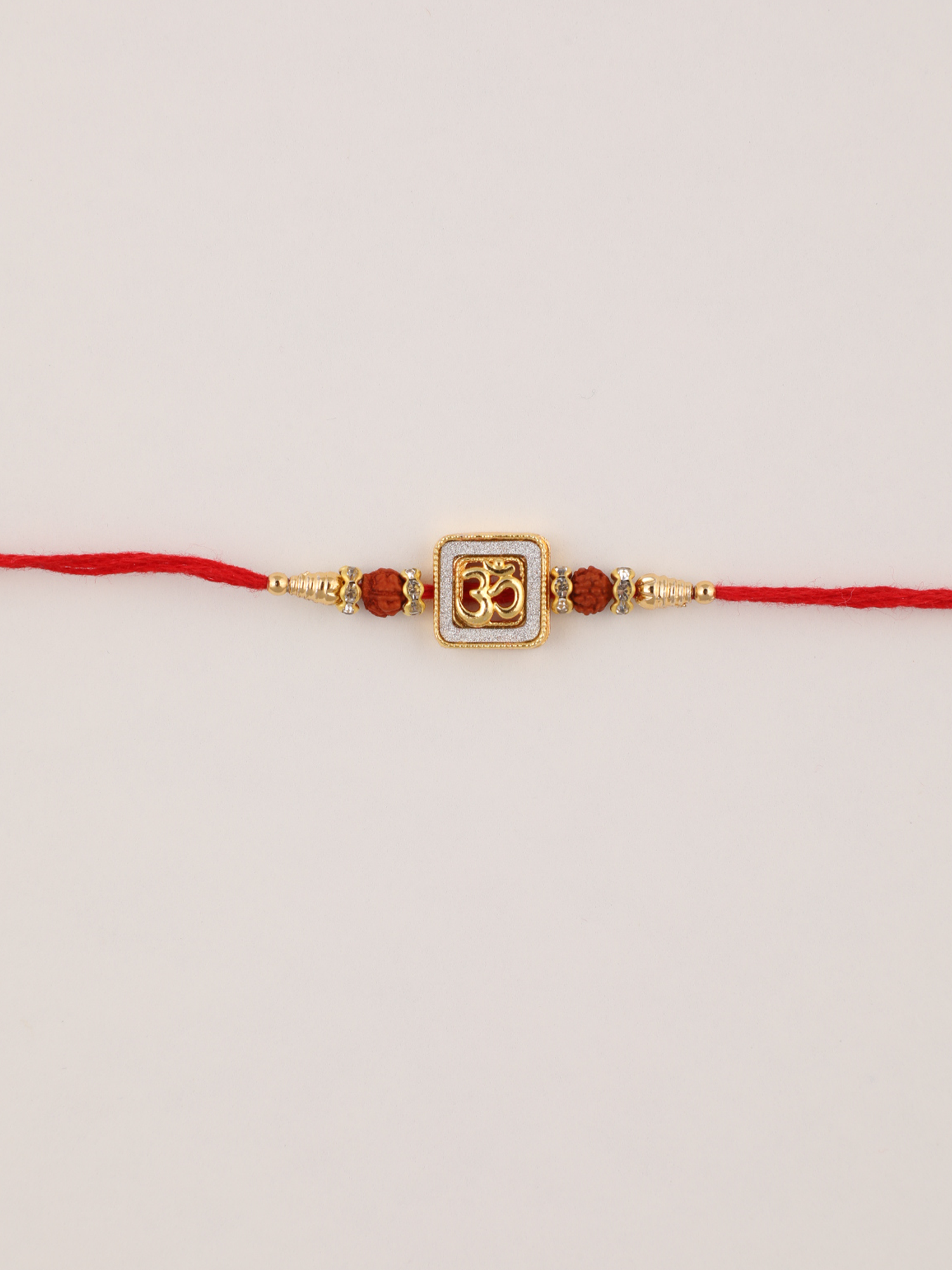 Rakshabandhan is a beautiful festival which is celebrated all over India with lots of joy and happiness. This is the time for a get together celebration with your siblings and close once. Let’s celebrate this unbreakable bond with Niscka Rakhi. This is very classic and elegant silver balls rakhi studed with colorful crystal stones. This is a band style rakhi for your loved ones.The rakhi is made up cz stones and has Om design with rudraksha balls studded in it. Your siblings will surely love the design and quality. Includes- Designer Rakhi, Roli and rice .