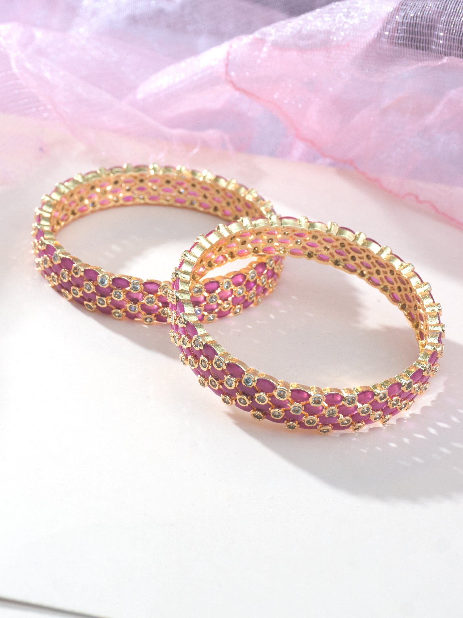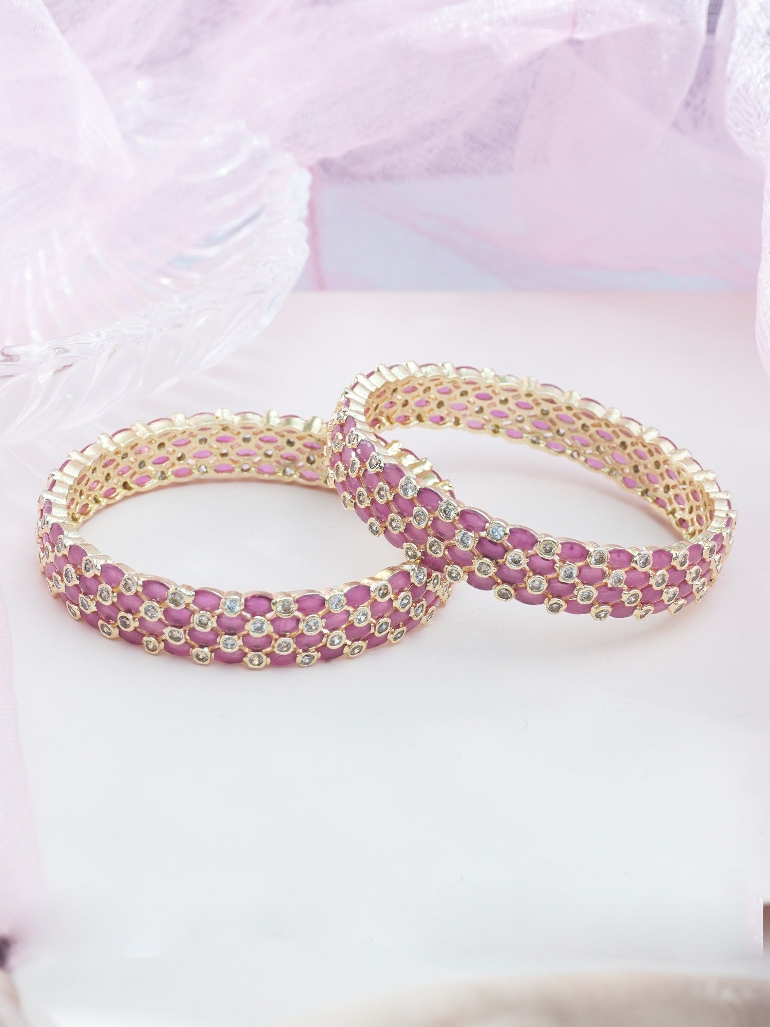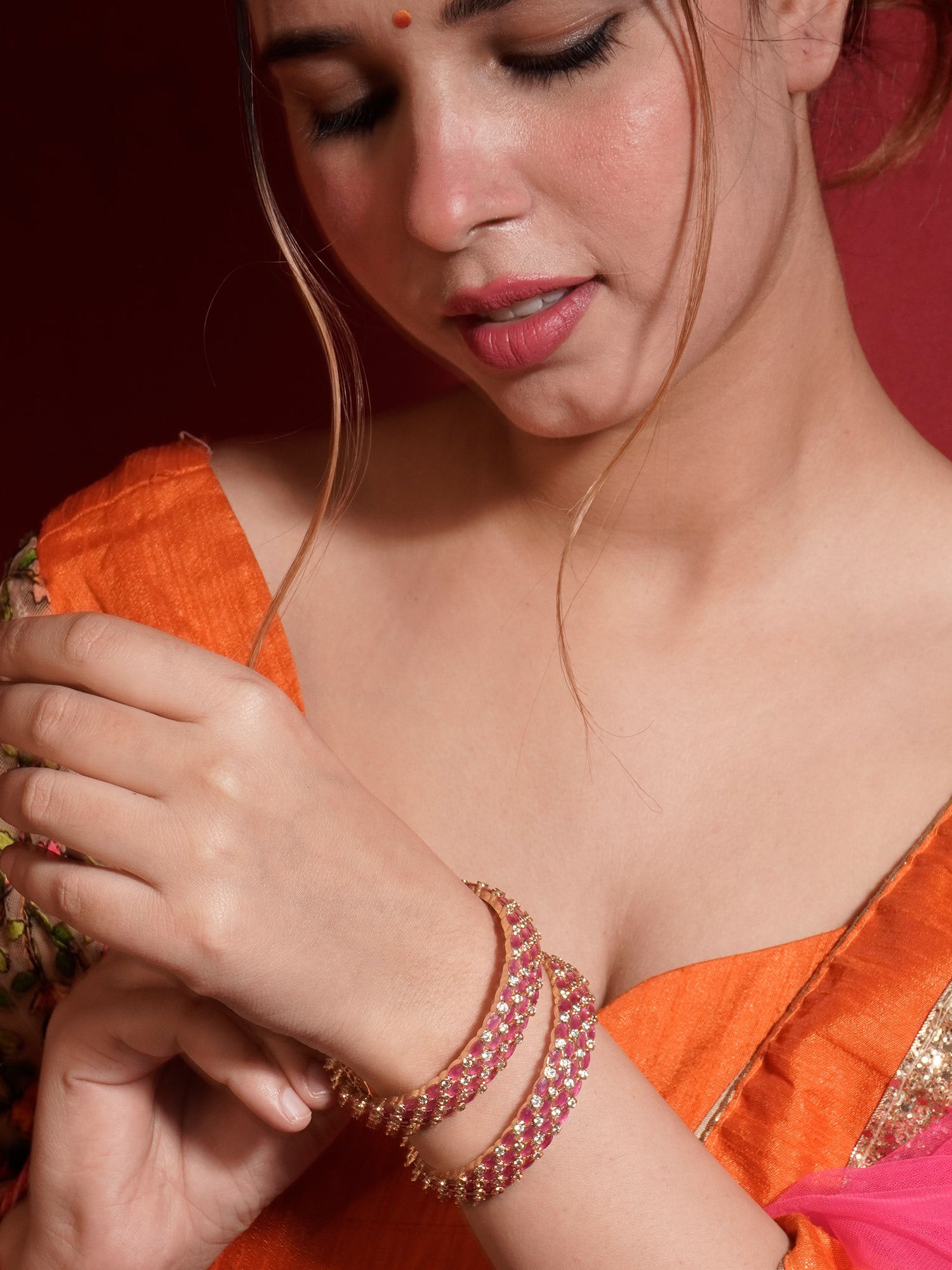 Discover elegance redefined with Niscka's exquisite pair of bangles, crafted to make a statement at every occasion. These bangles are meticulously designed with a blend of 24k gold plating and rhodium polish, enhancing their luxurious shine. Adorned with high-quality American diamonds, each bangle sparkles brilliantly, while intricate Kundan work adds a touch of traditional charm. Accents of pink ruby stones bring in a vibrant, regal touch, creating a beautiful contrast. Perfect for pairing with ethnic or fusion attire, these bangles are the epitome of timeless elegance.
