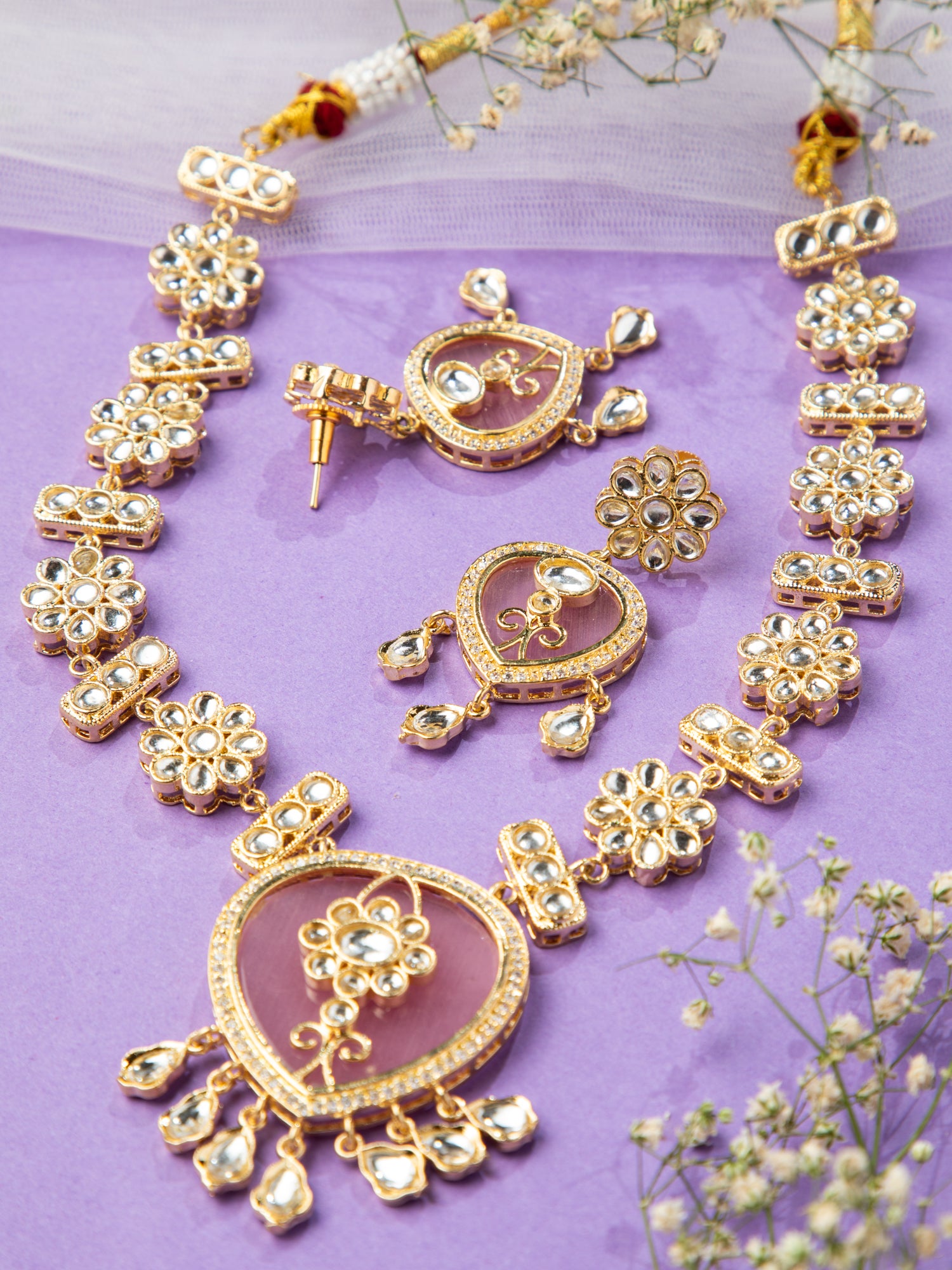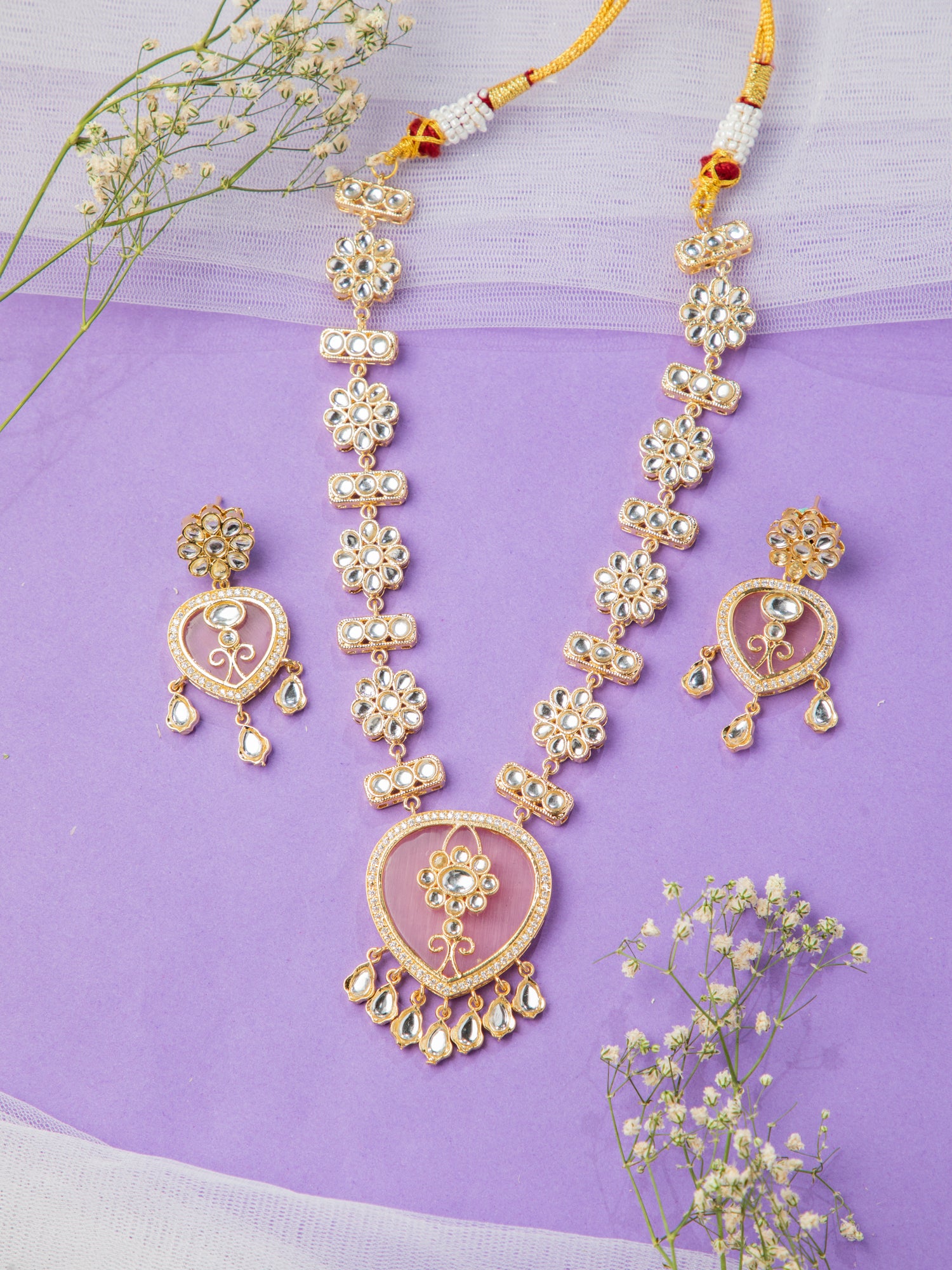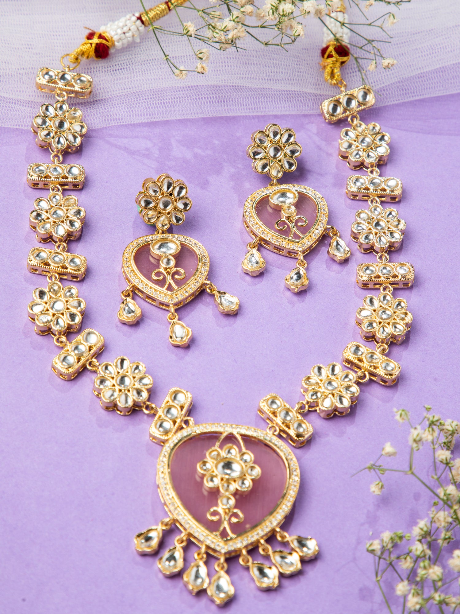 18K Gold Plated Necklace Set with Earrings featuring a big pink heart-shaped stone pendant, surrounded by white American diamonds and floral white round Kundan. The chain and earrings mirror this mesmerizing floral Kundan design, perfect for daily and function wear.
