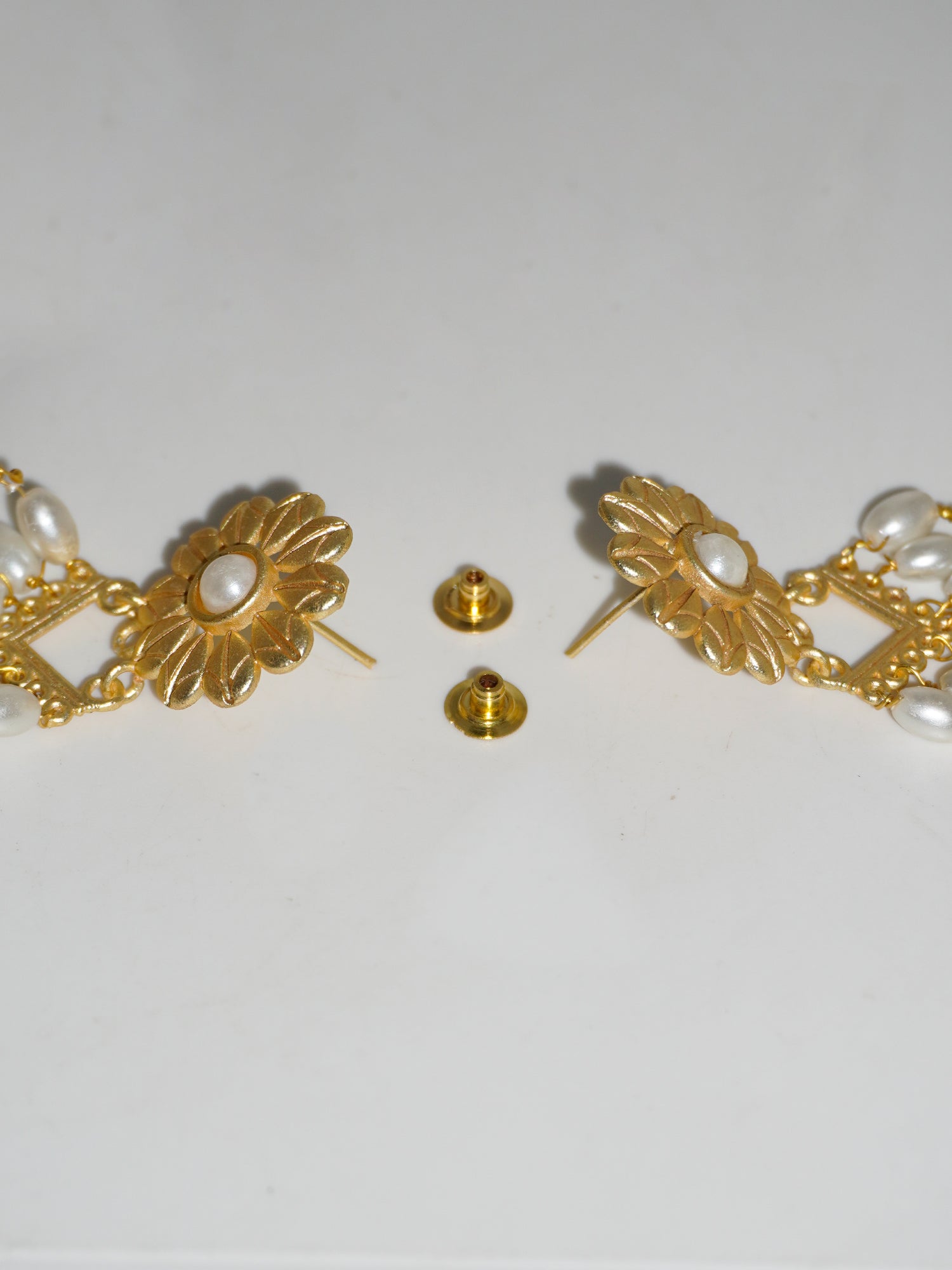 Stunning 22K gold-plated matte finish triple-layered geometric earrings with floral accents and faux pearls. Handcrafted by local artisans, these must-have earrings are perfect for parties, festivals, or functions. A gorgeous new design that adds timeless elegance.Pair with a sleek bun and traditional attire to let these statement earrings shine at any festive or party event.