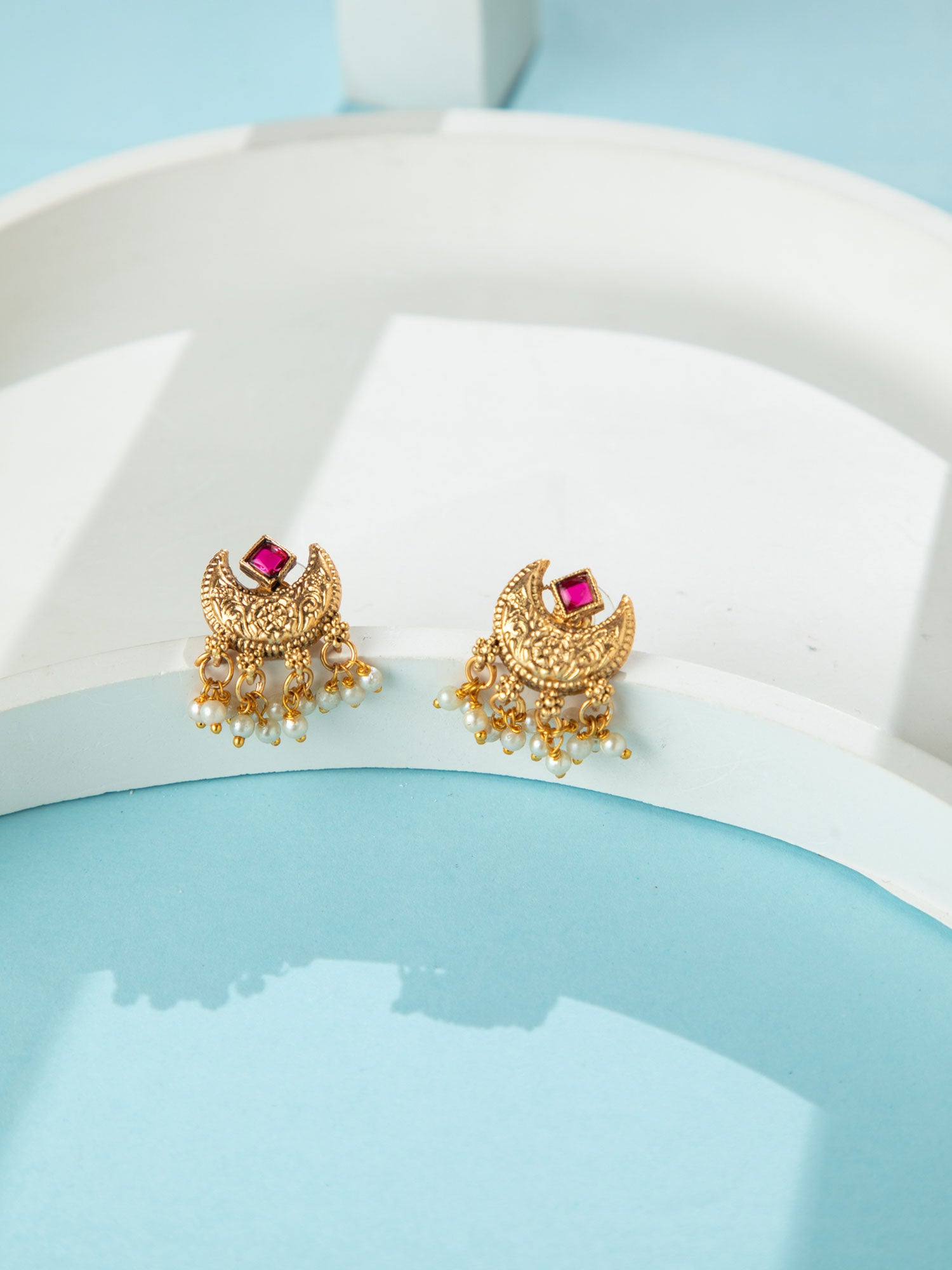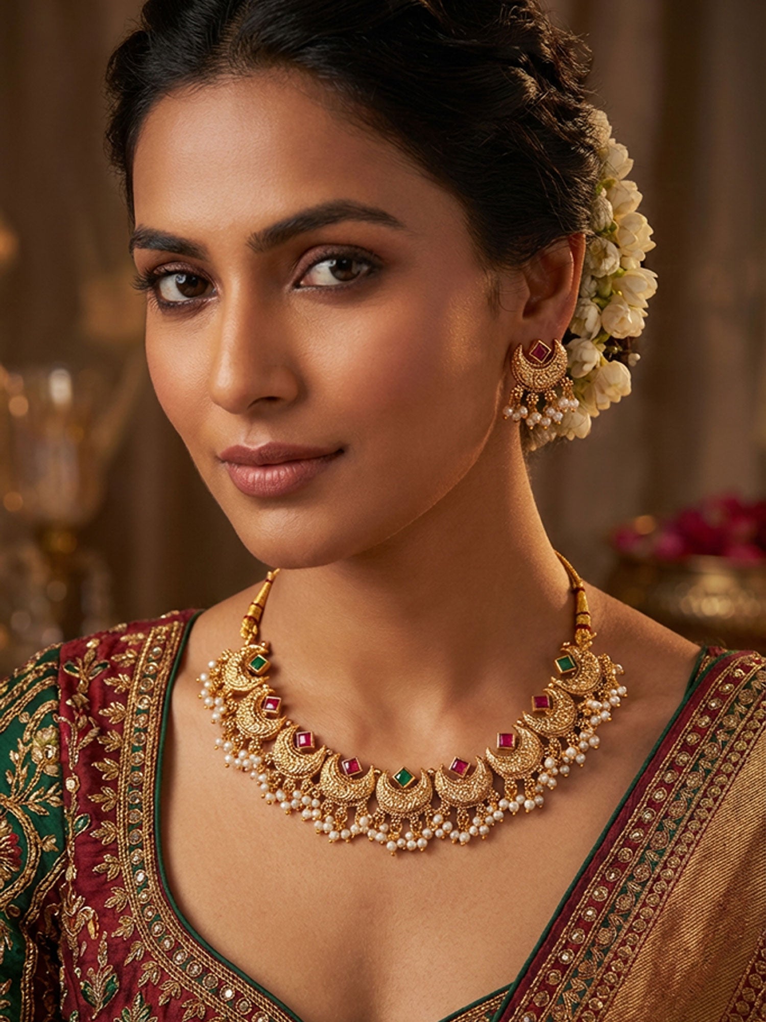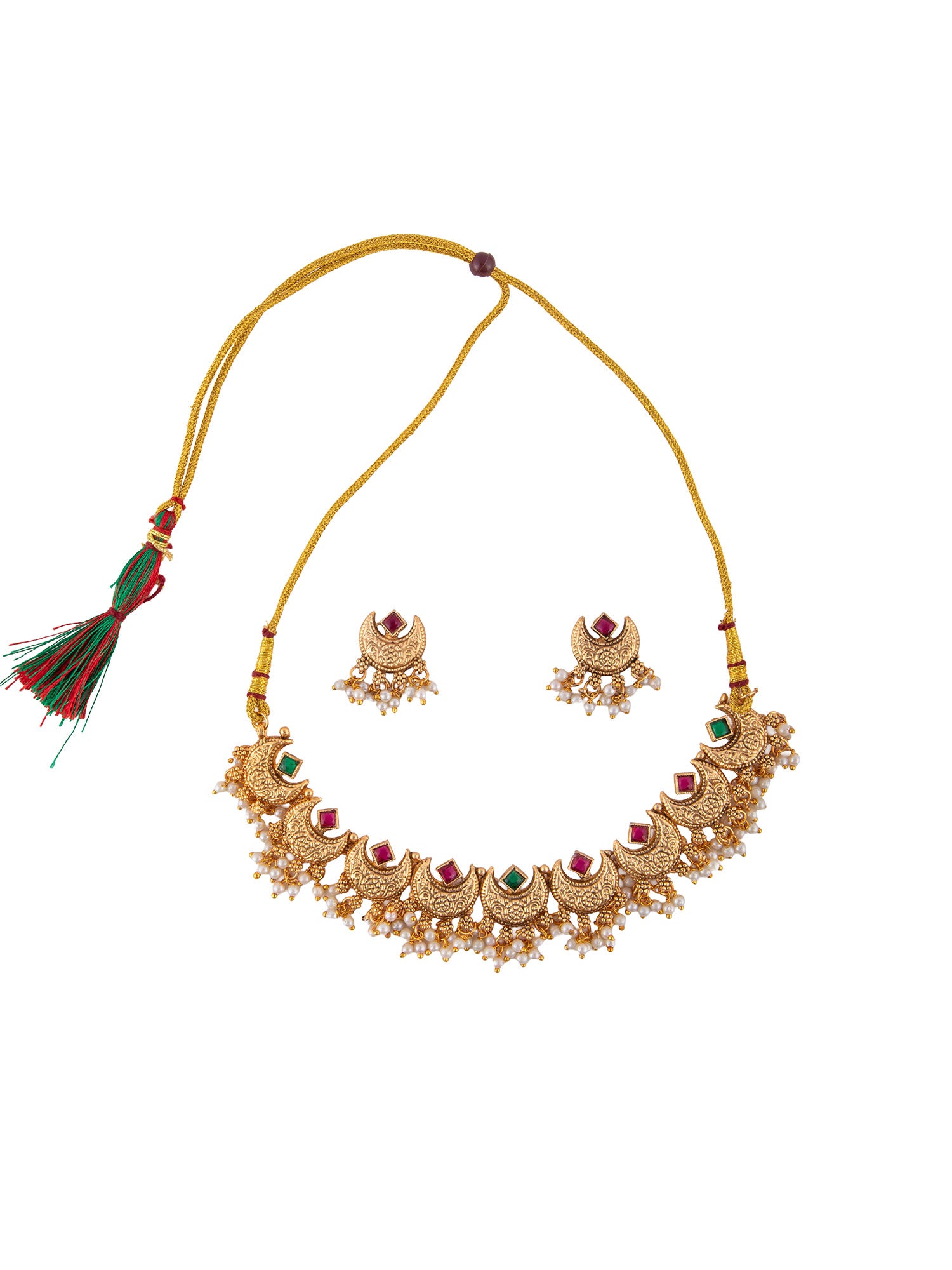 22K Gold Plated Ruby Emerald Crescent Necklace and Earrings Set