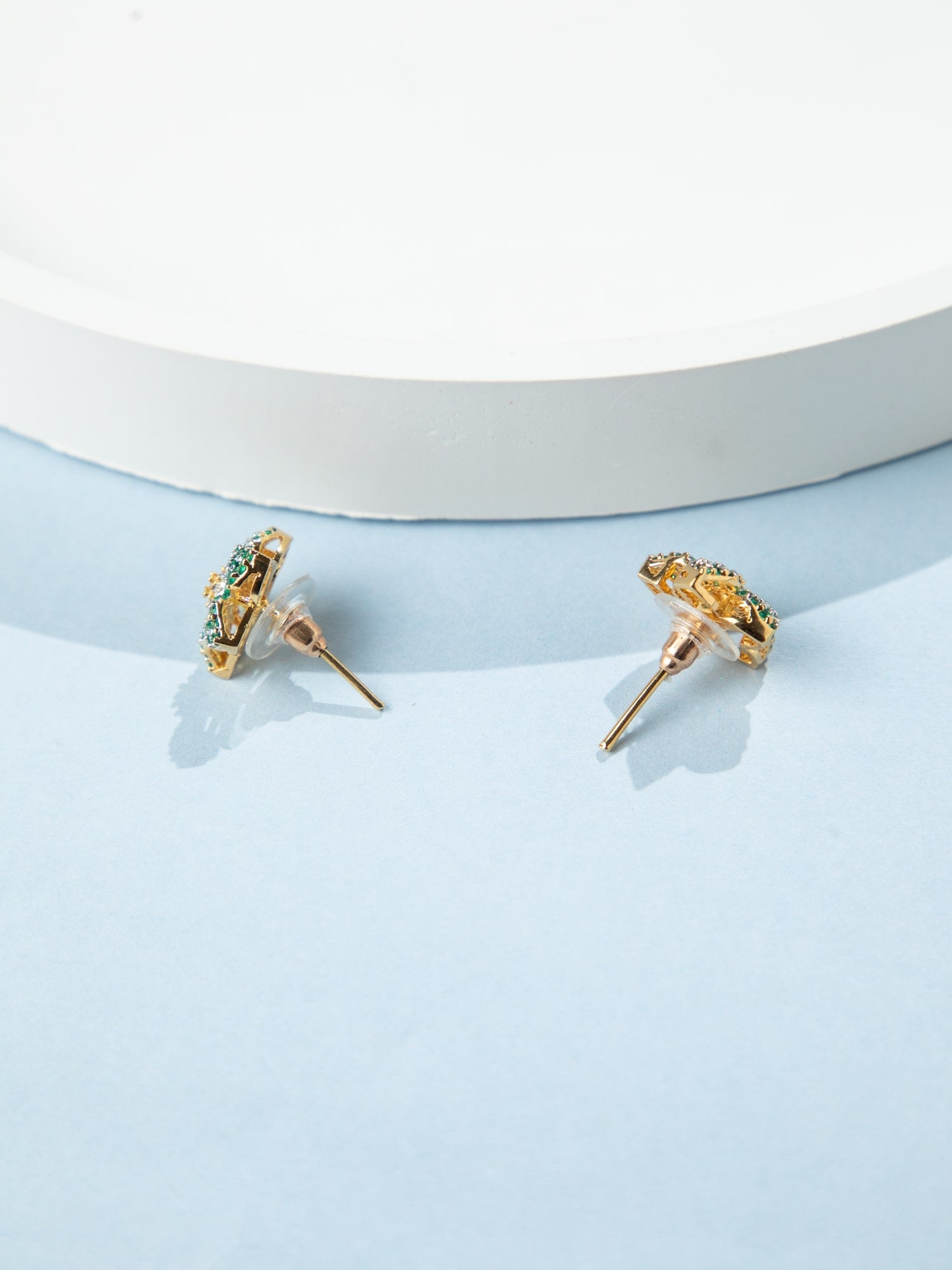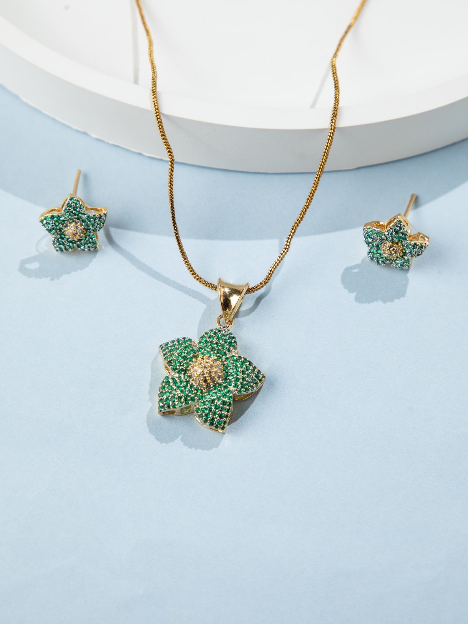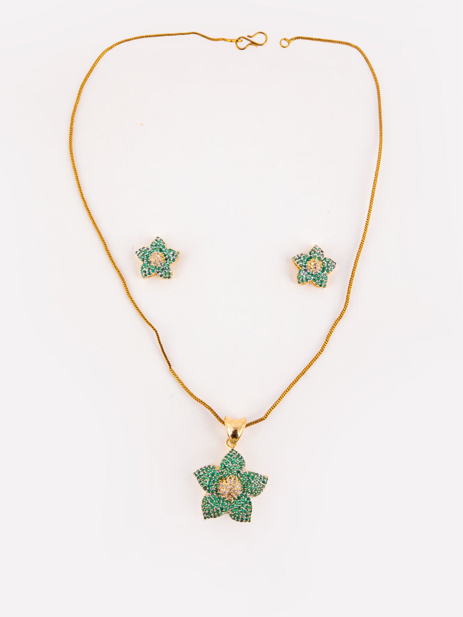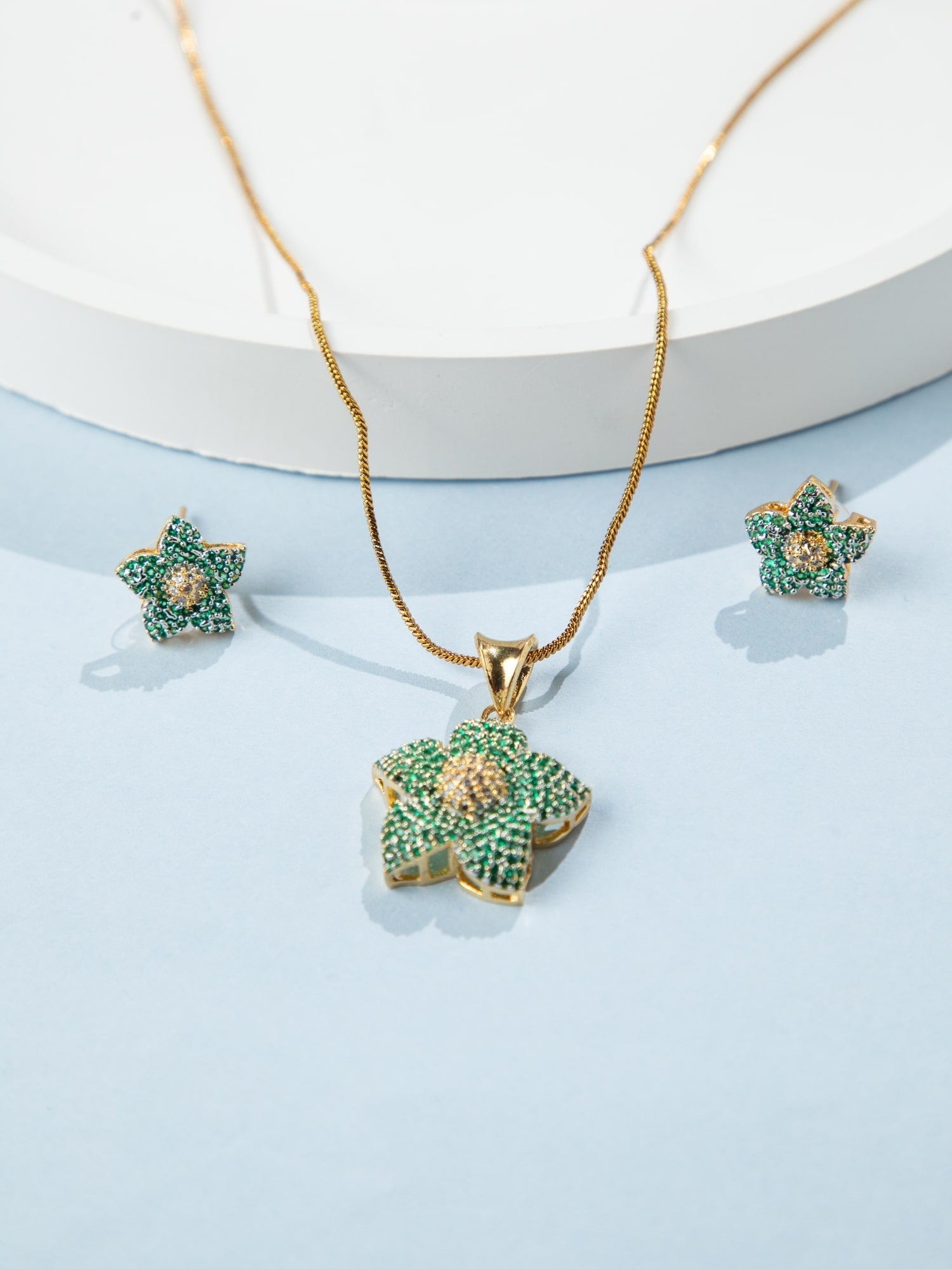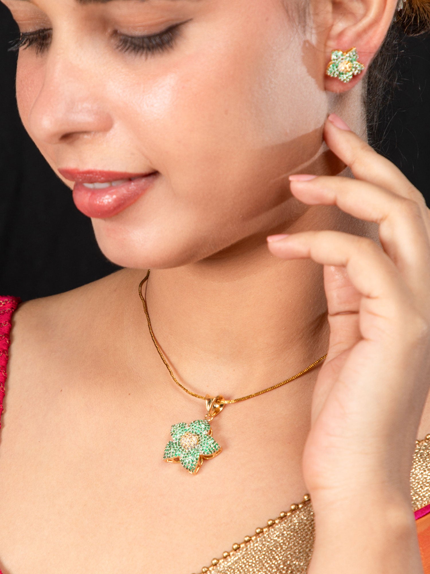 24K Gold Plated American Diamond Floral Necklace and Earrings Set with Green and White Stones