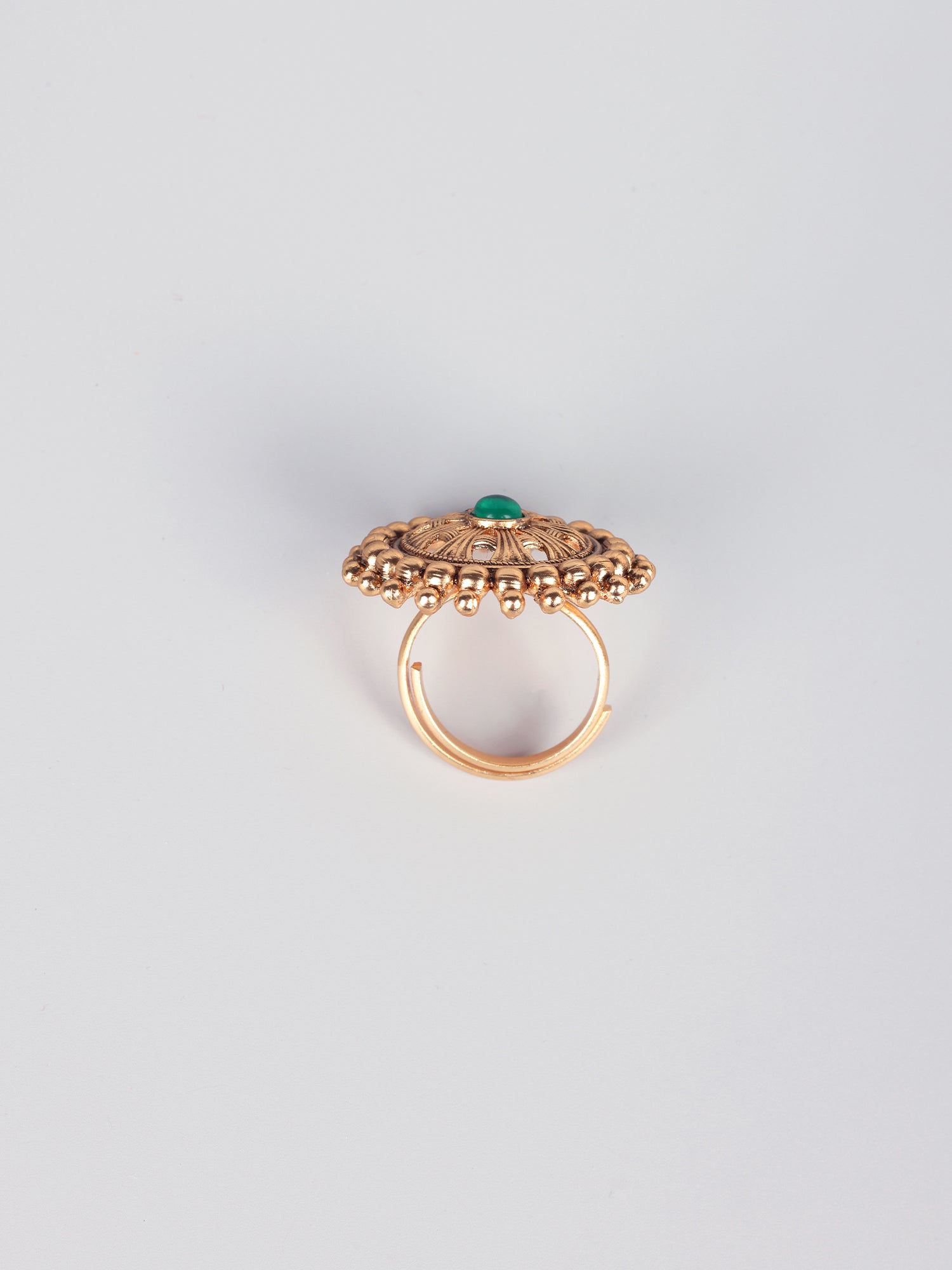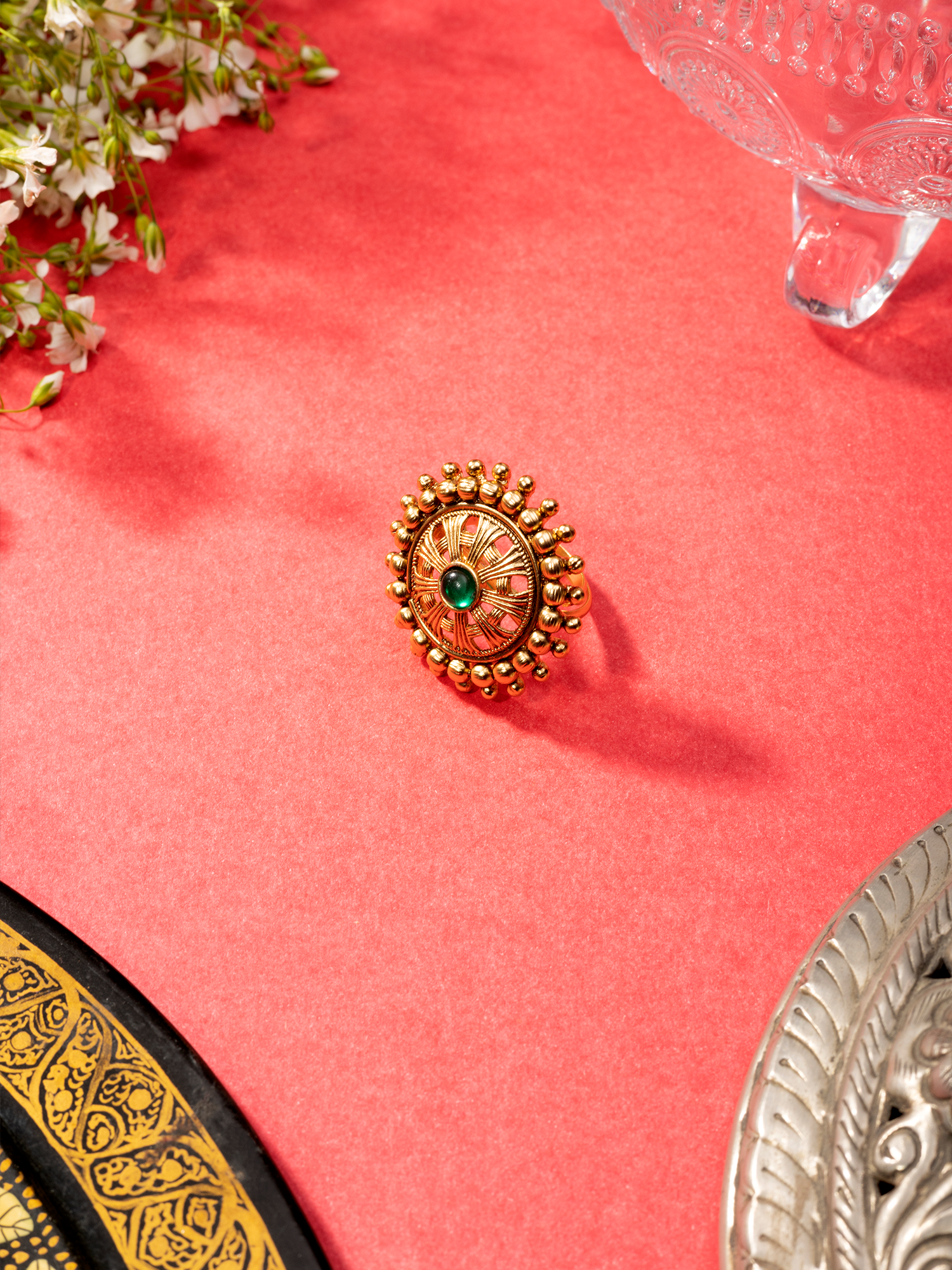 Introducing our gorgeous 24K Gold-Plated Antique Emerald Ring, a captivating blend of elegance and sophistication. Adorned with a stunning emerald (Green Stone), this ring is artfully crafted to exude contemporary style and design. Handmade by local artisans, it seamlessly blends tradition with modernity, making it suitable for both daily wear and special occasions. Elevate your ensemble with this timeless piece, adding a touch of luxury and grace to every outfit you wear.