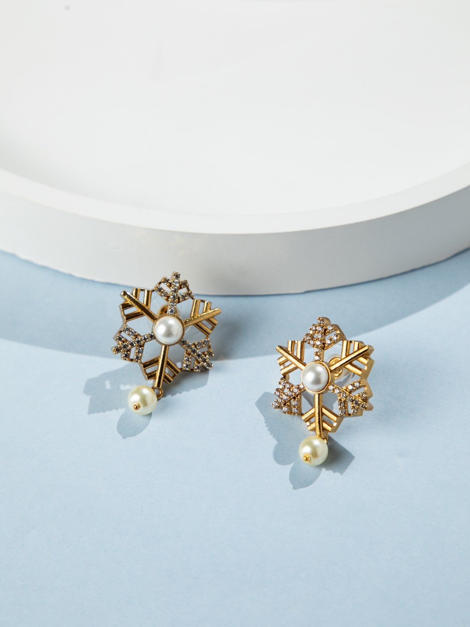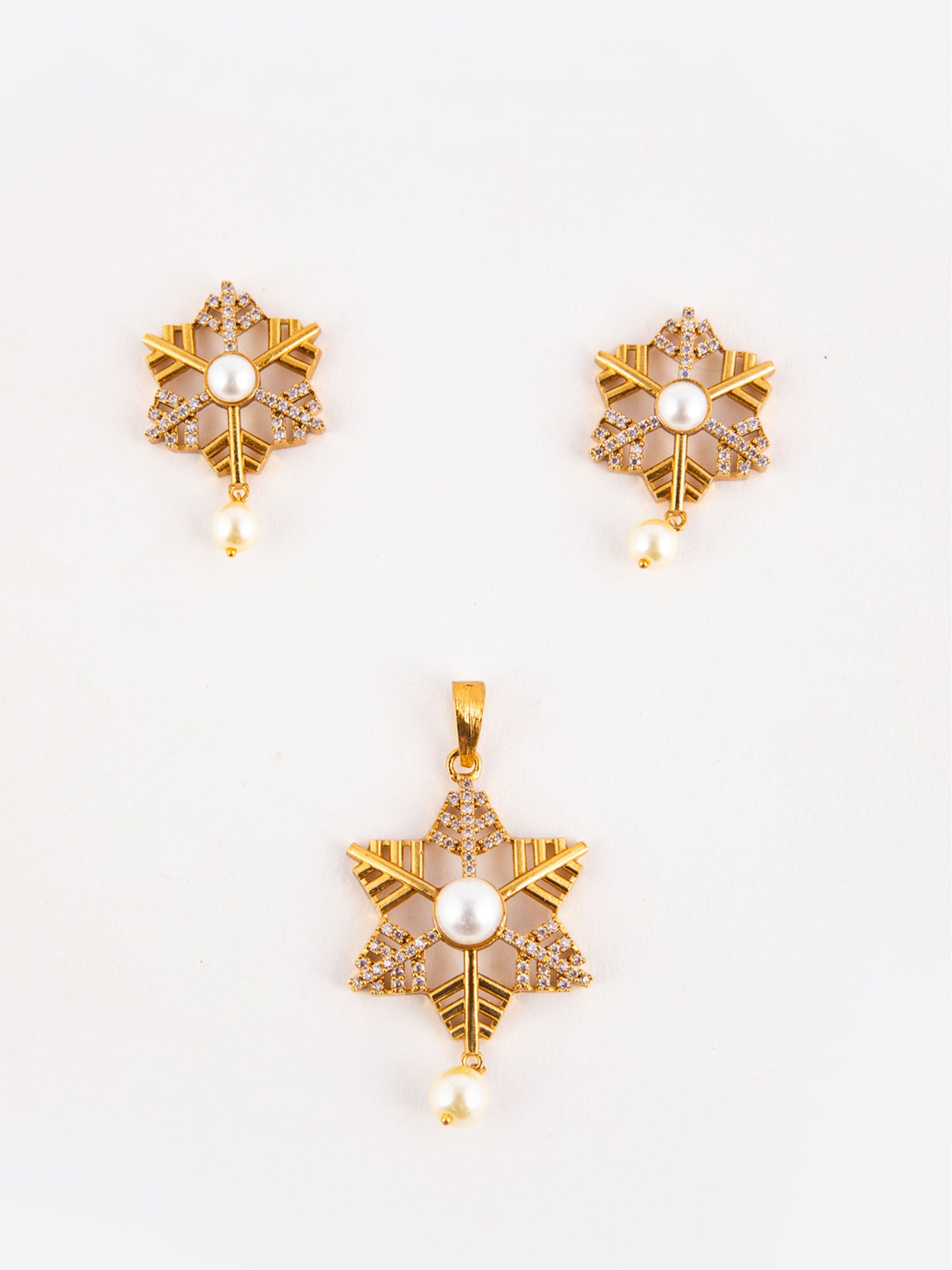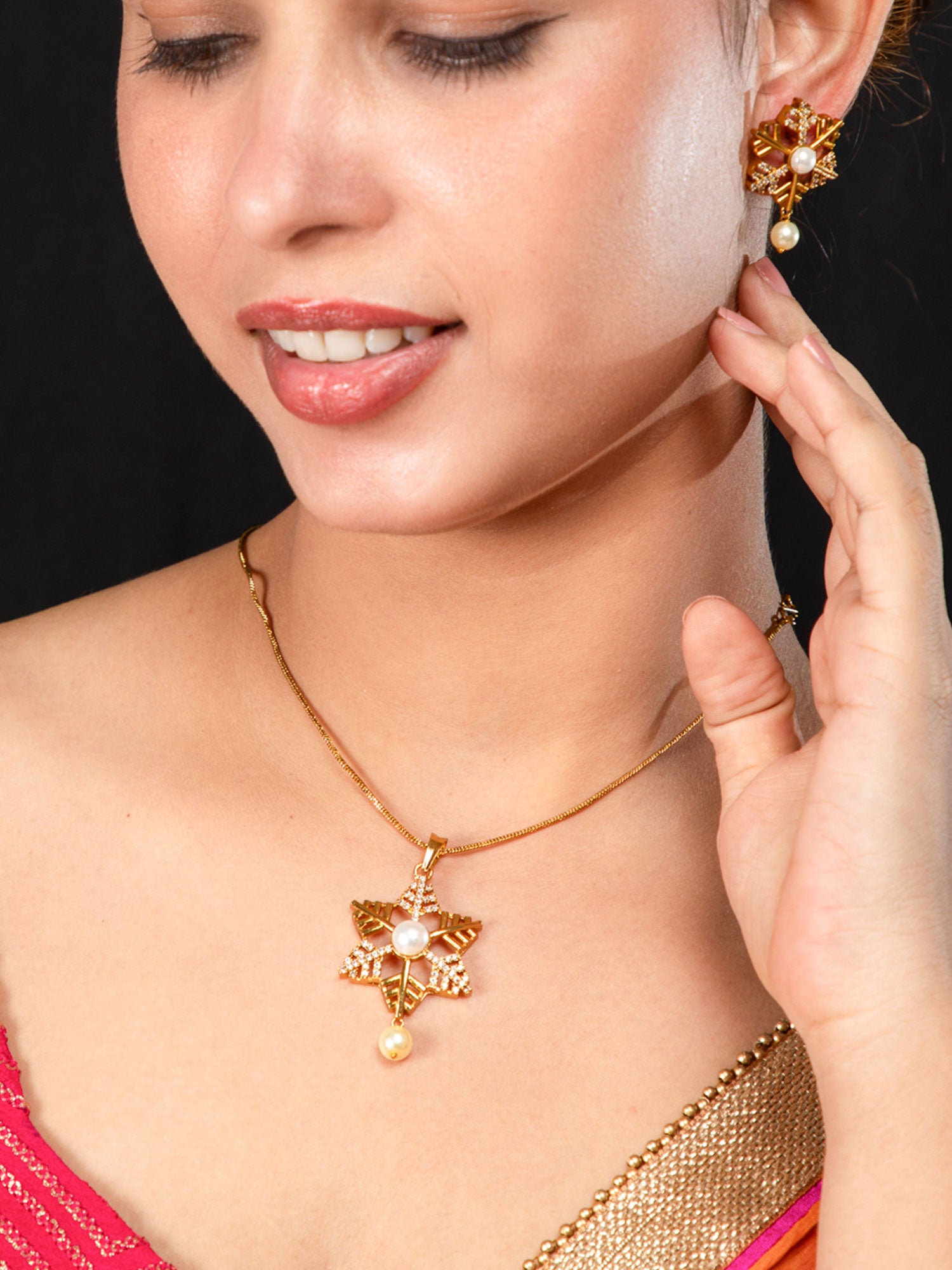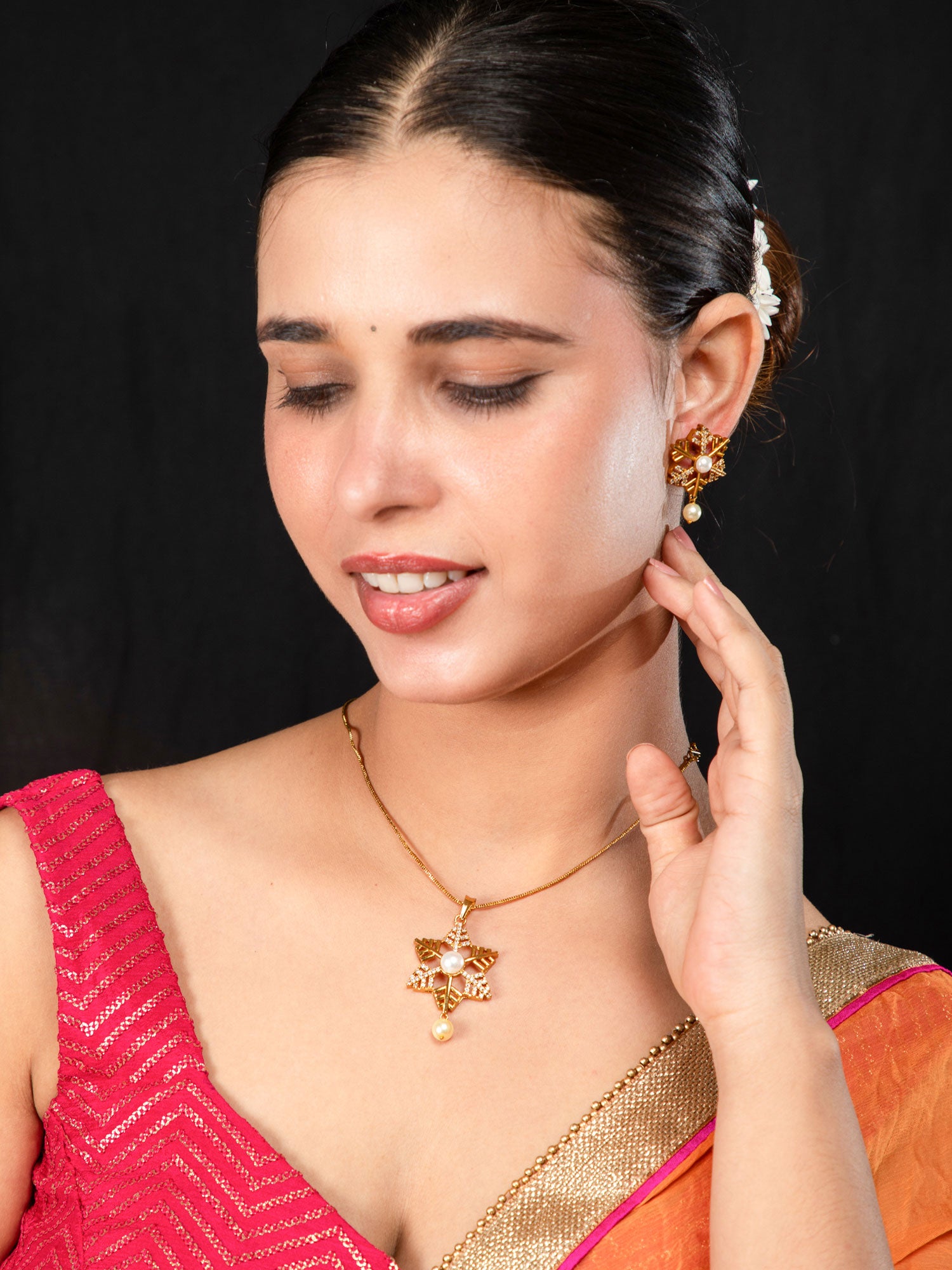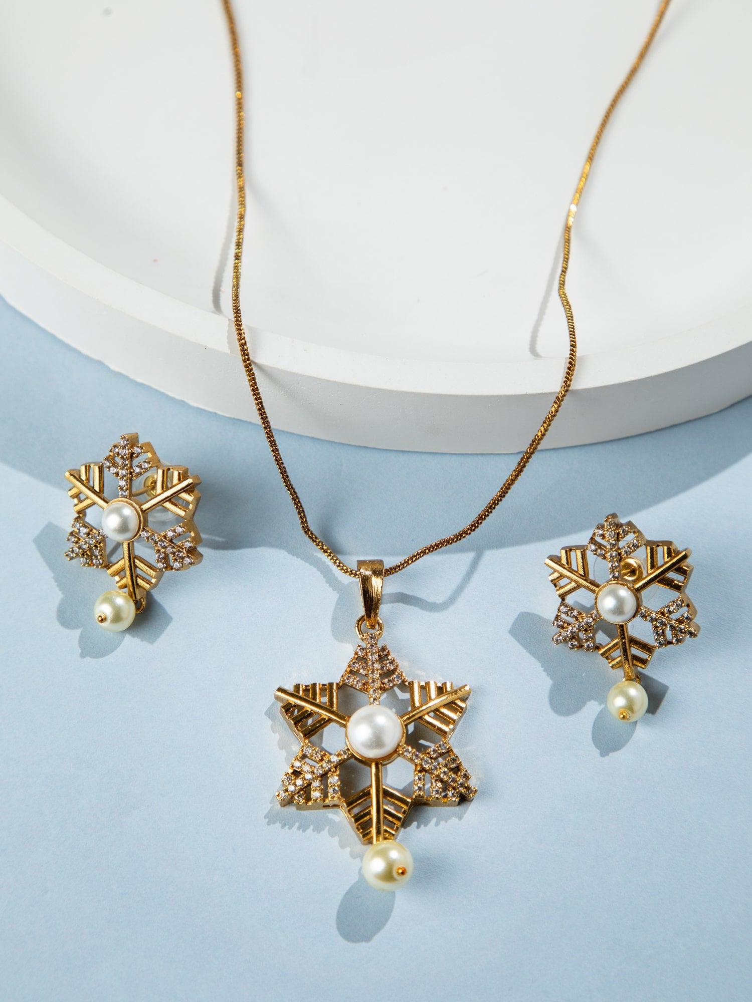 24K Gold Plated Antique Necklace and Earrings Set with Snowflake Design and Pearl Center