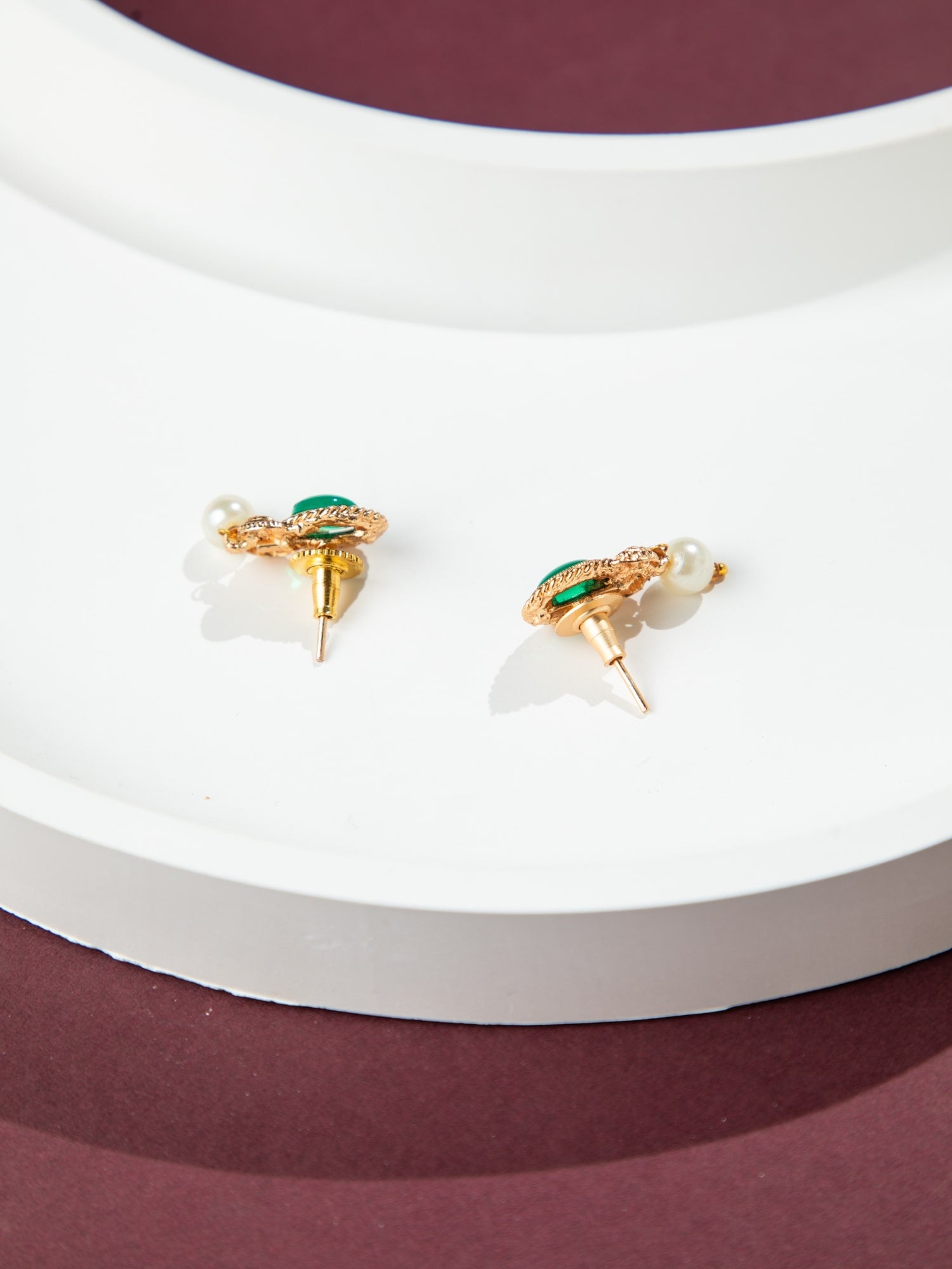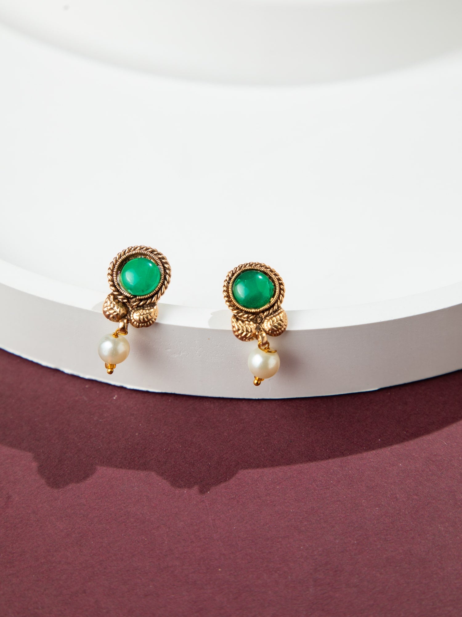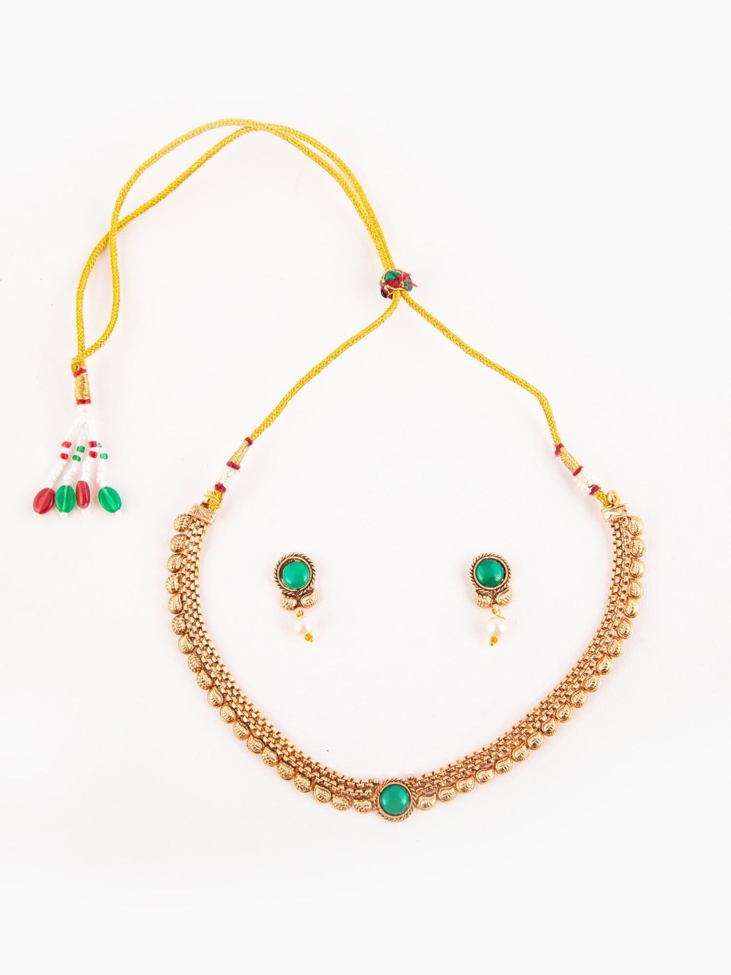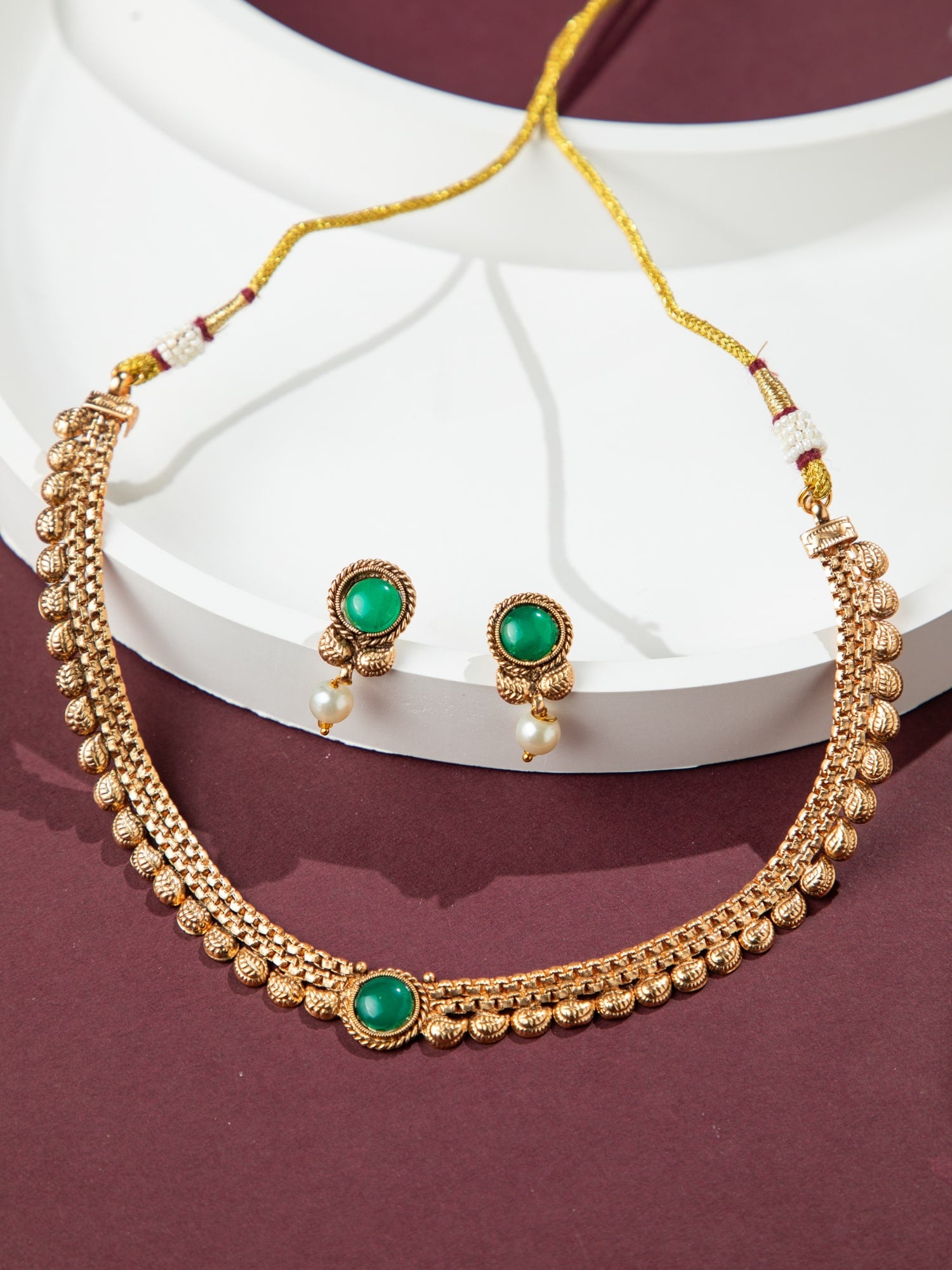 24K Gold Plated Antique Necklace with Earrings Set with Oval Green Stones