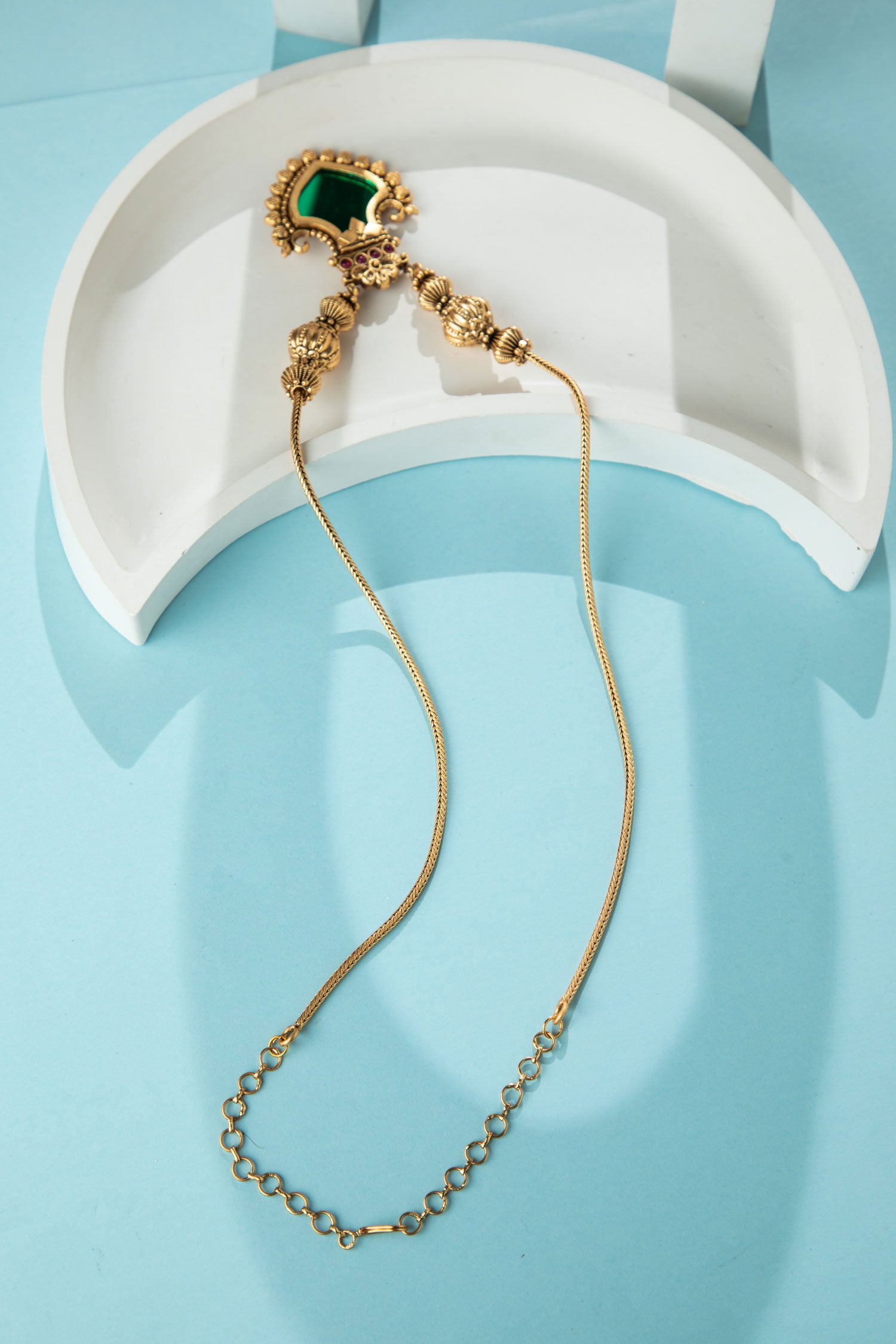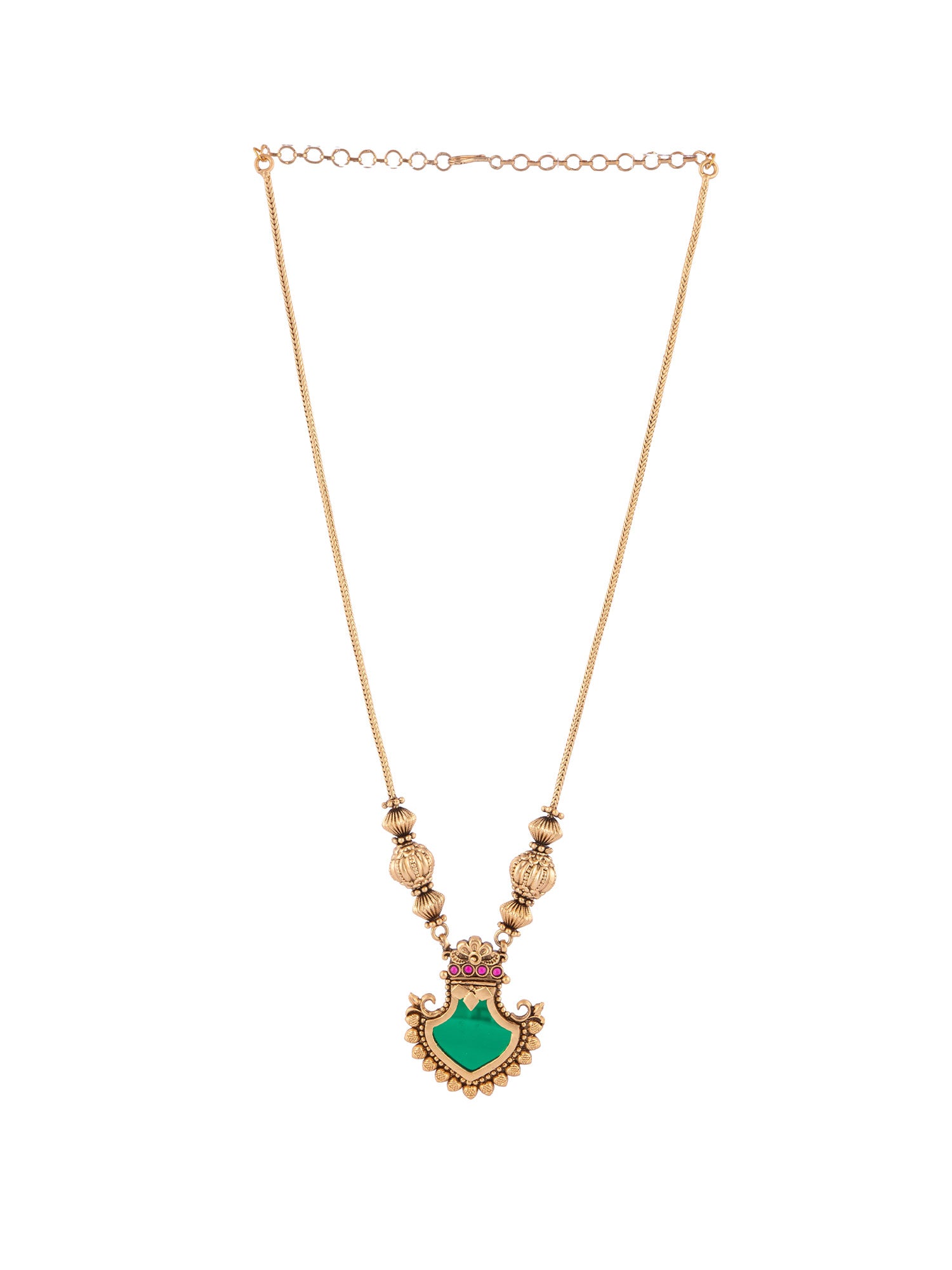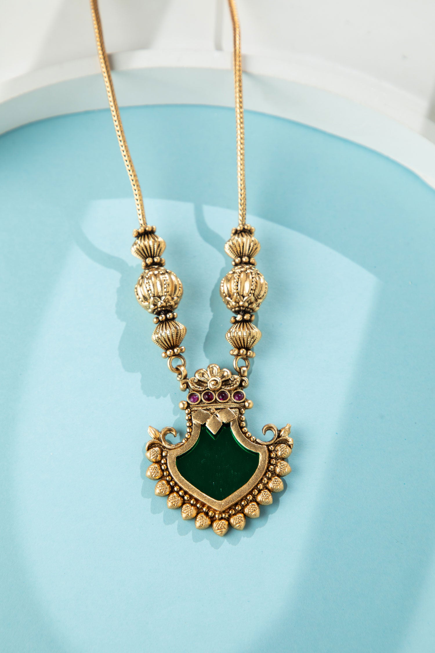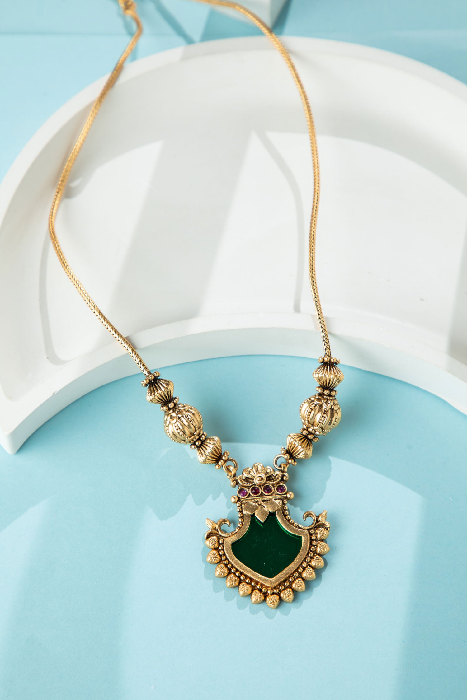 24K Gold Plated Antique Necklace with Green Glass and Red Stone Pendant