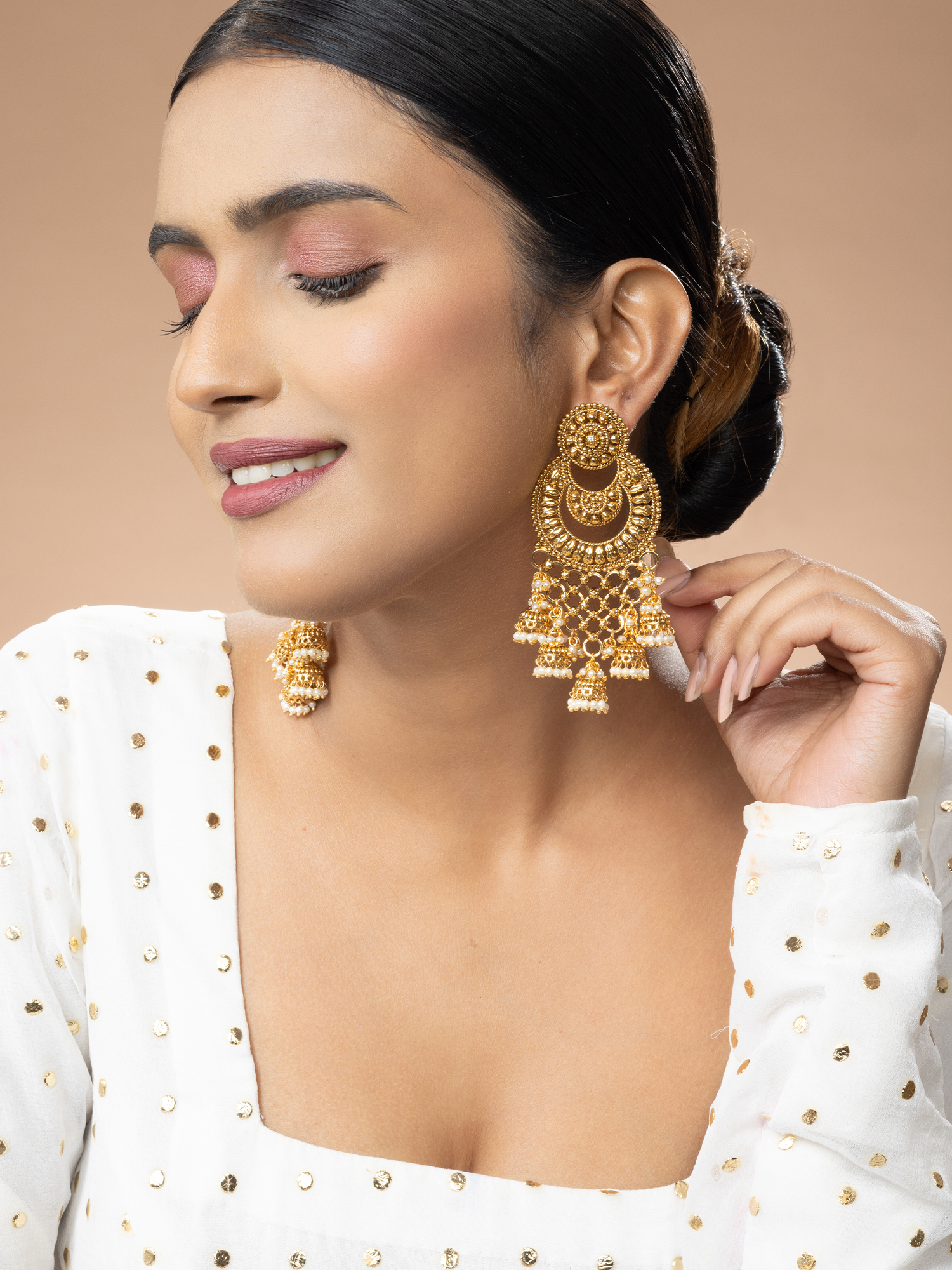 Adorn yourself in regal elegance with our 24K Gold Plated Chand Bali Earrings Set. These beautiful chandbalis feature little jhumkas at the bottom, creating a striking silhouette. The big size, gold-plated earrings are ideal for festivals, weddings, or any special functions. Adorned with little white pearls, these earrings showcase an elegant and latest traditional design. Handmade by local artisans, this set is a perfect accessory for both wedding functions and parties, reflecting a blend of cultural richness and contemporary style.